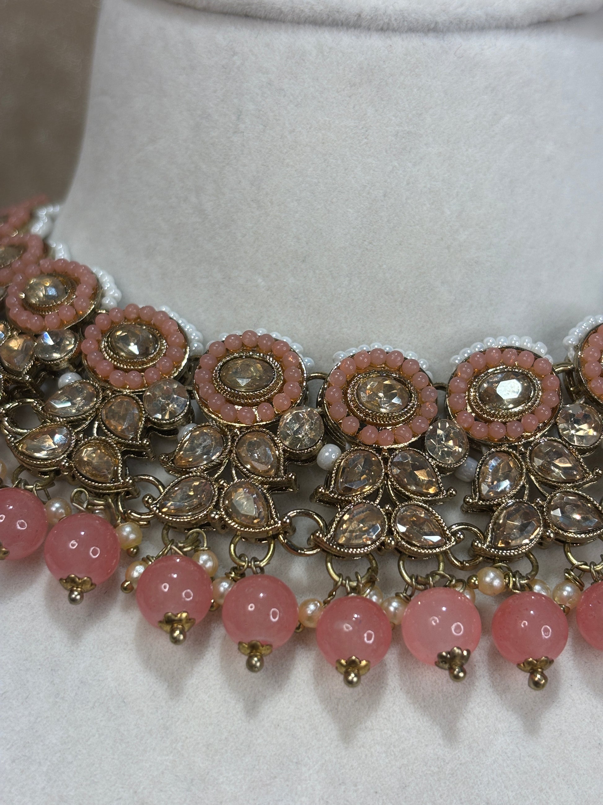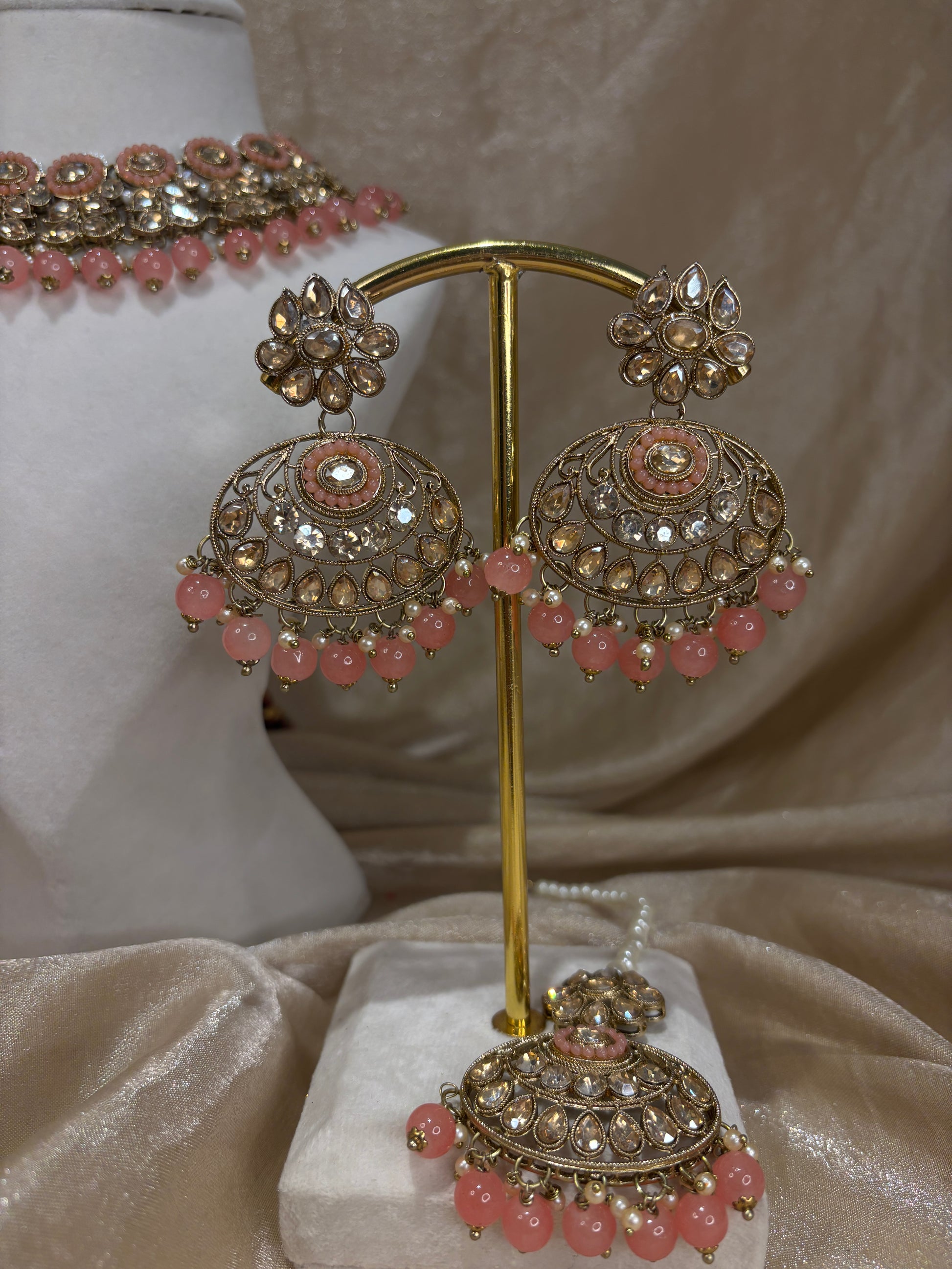 Peach/pink necklace set in Polki; comes with earrings and tikka