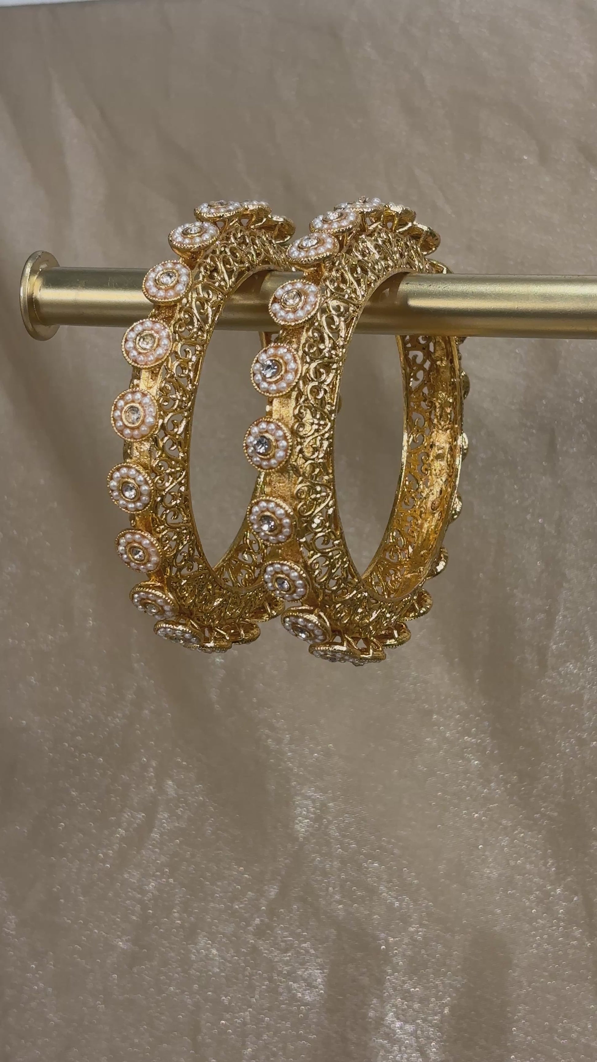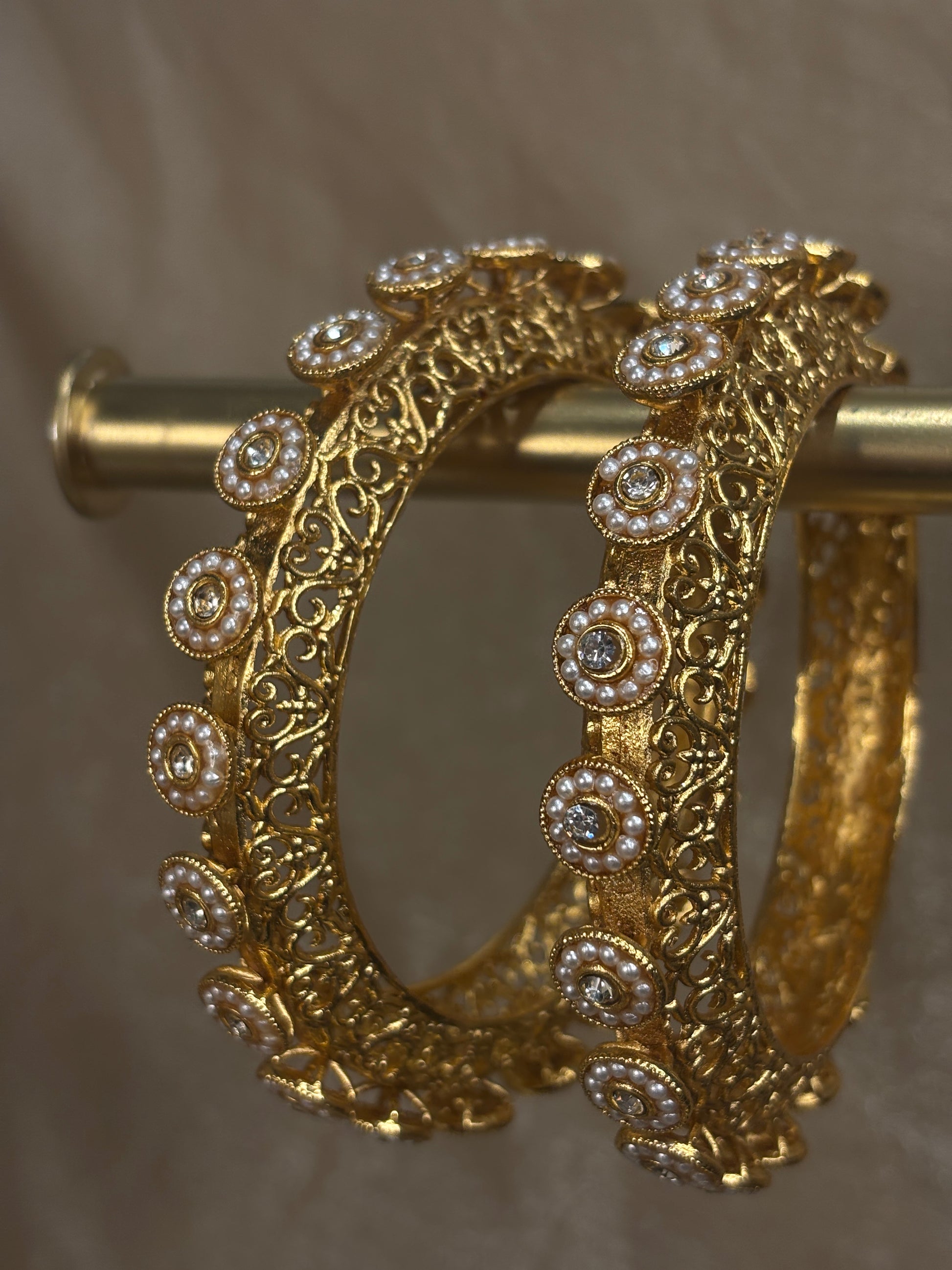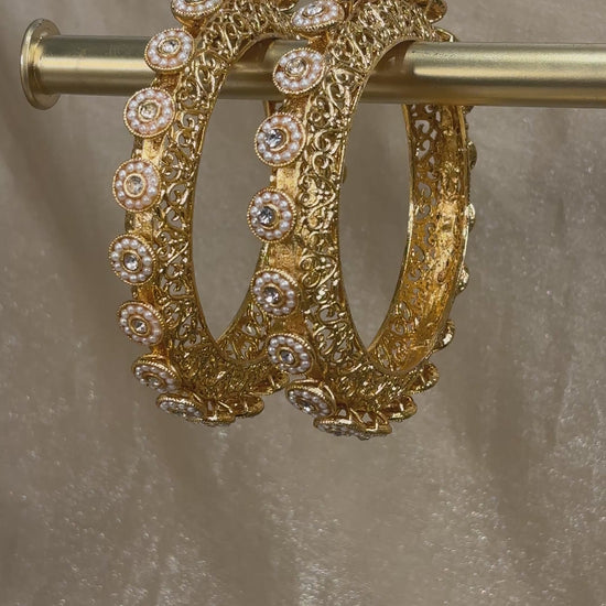 Yellow gold pearl detail rajwadi kare with intricate details; comes in a set of 2