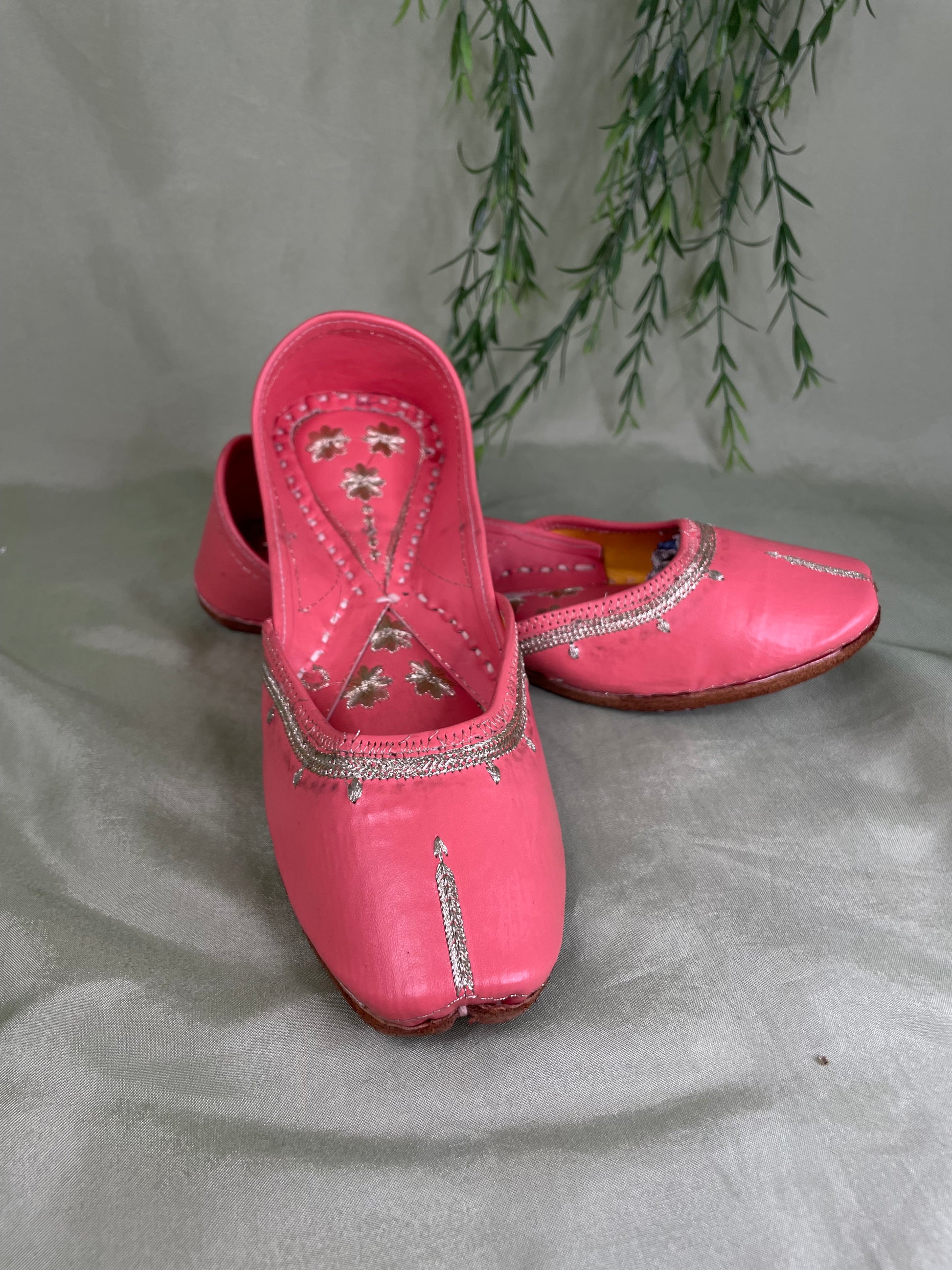Pink leather jutti with simple tilla work. All of our juttiyan are double padded for maximum comfort!
