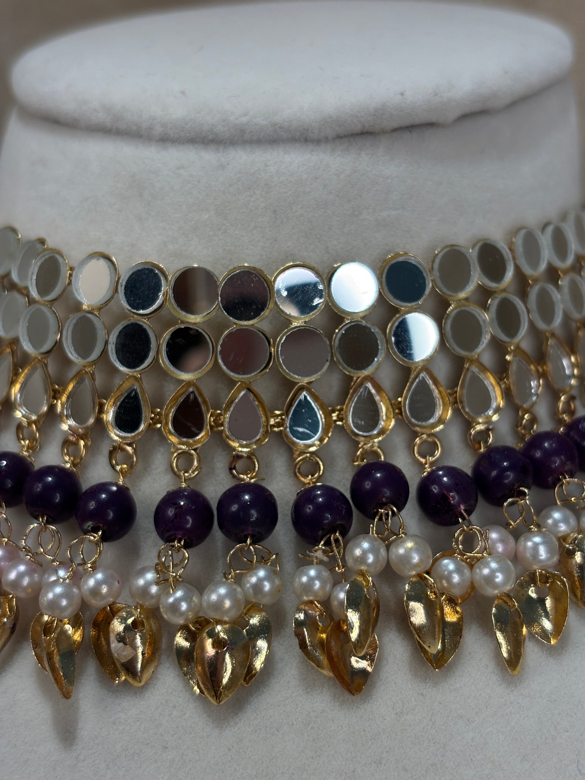 Deep purple mirror work choker set with small pearl details; comes with earrings and tikka