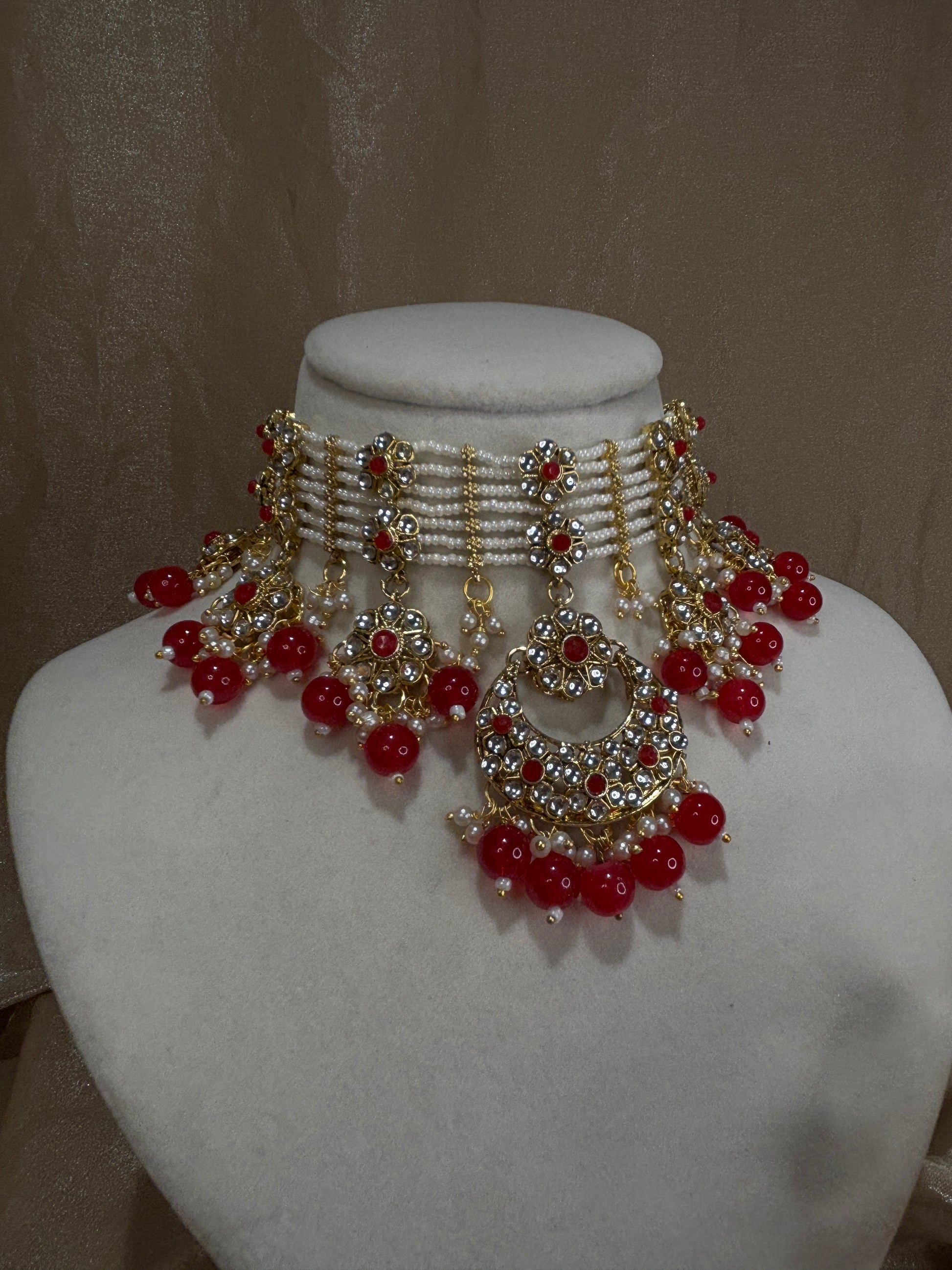 Red kundan choker set with pearl details; comes with earrings and tikka