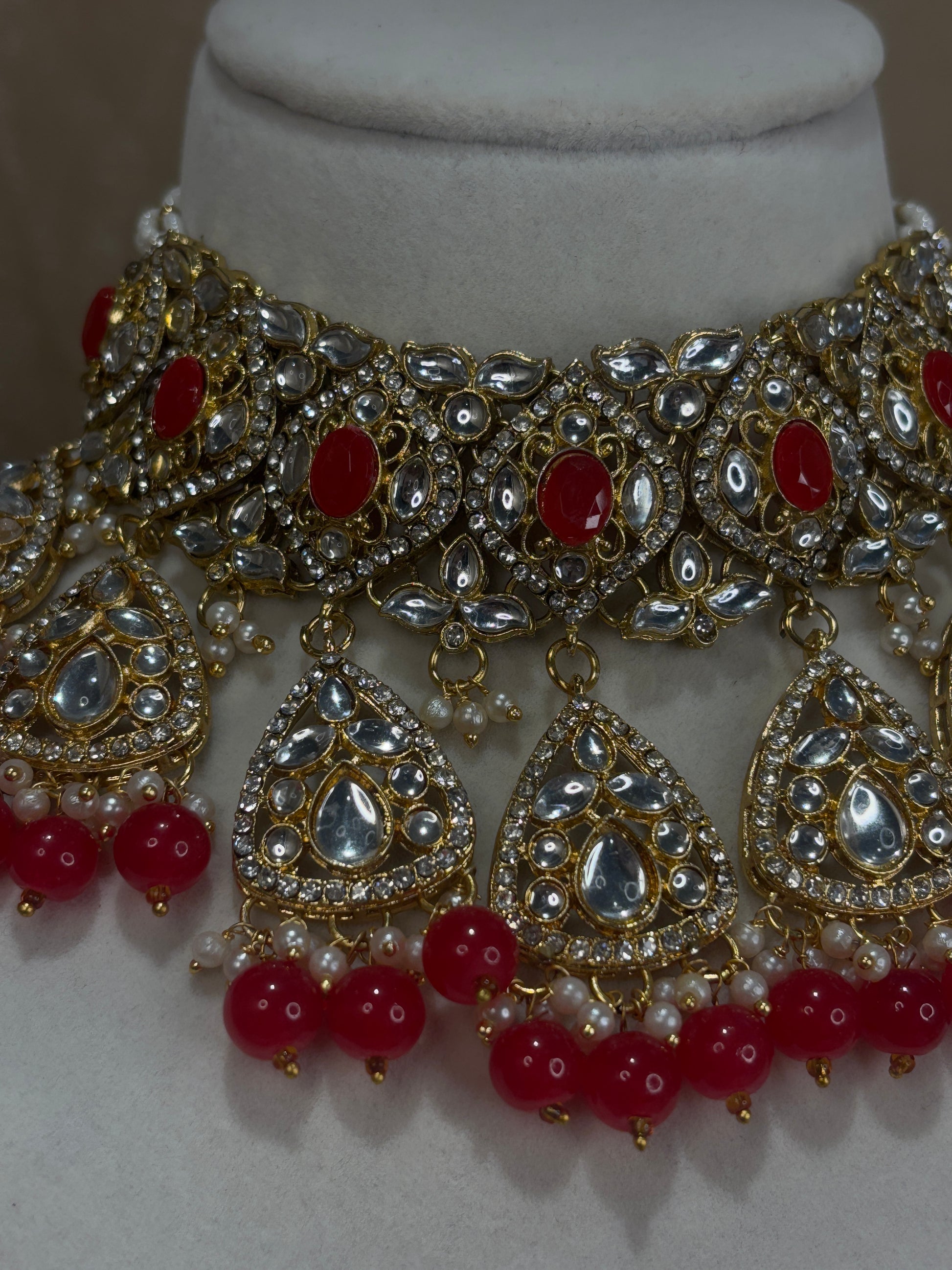 Red kundan choker set with pearl detials; comes with earrings and tikka