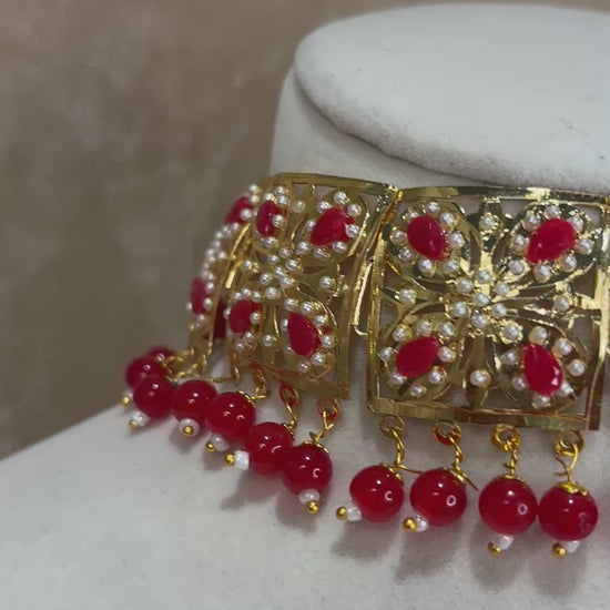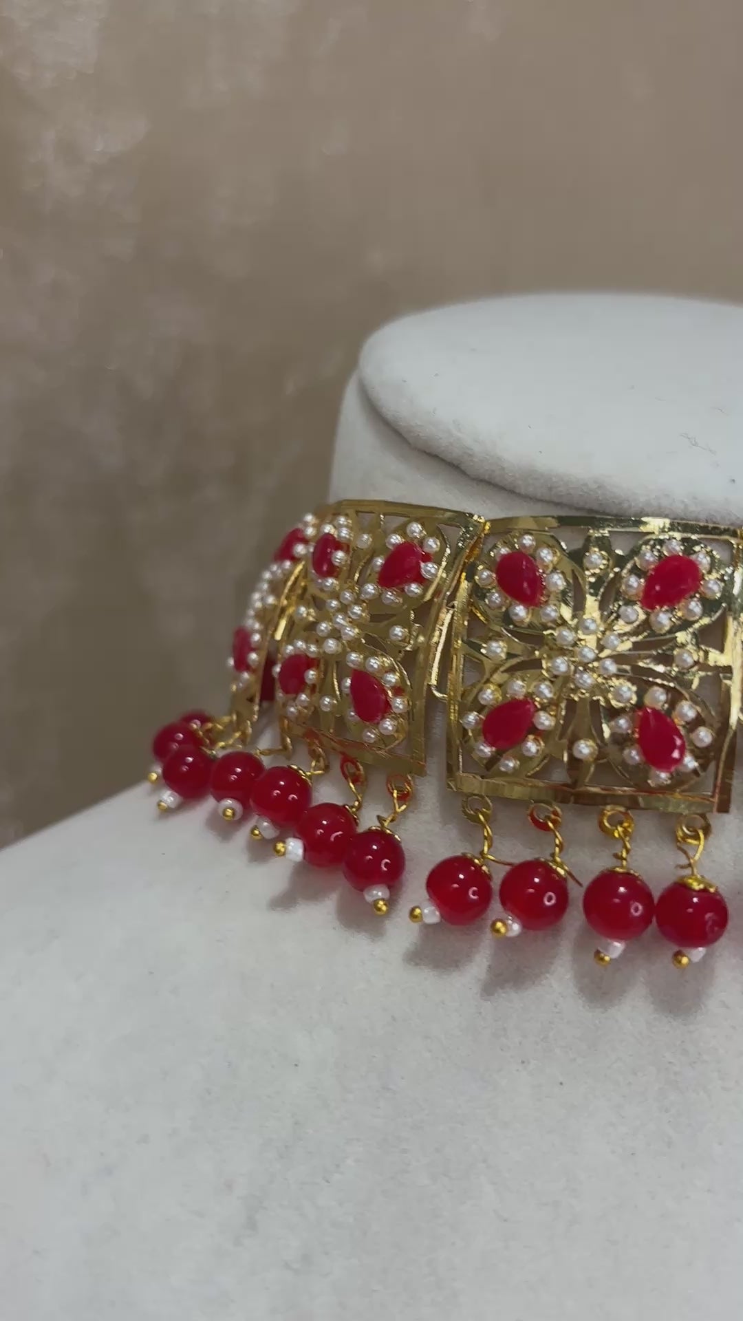 Bright red jadau choker set with small pearl details; comes with earrings and tikka