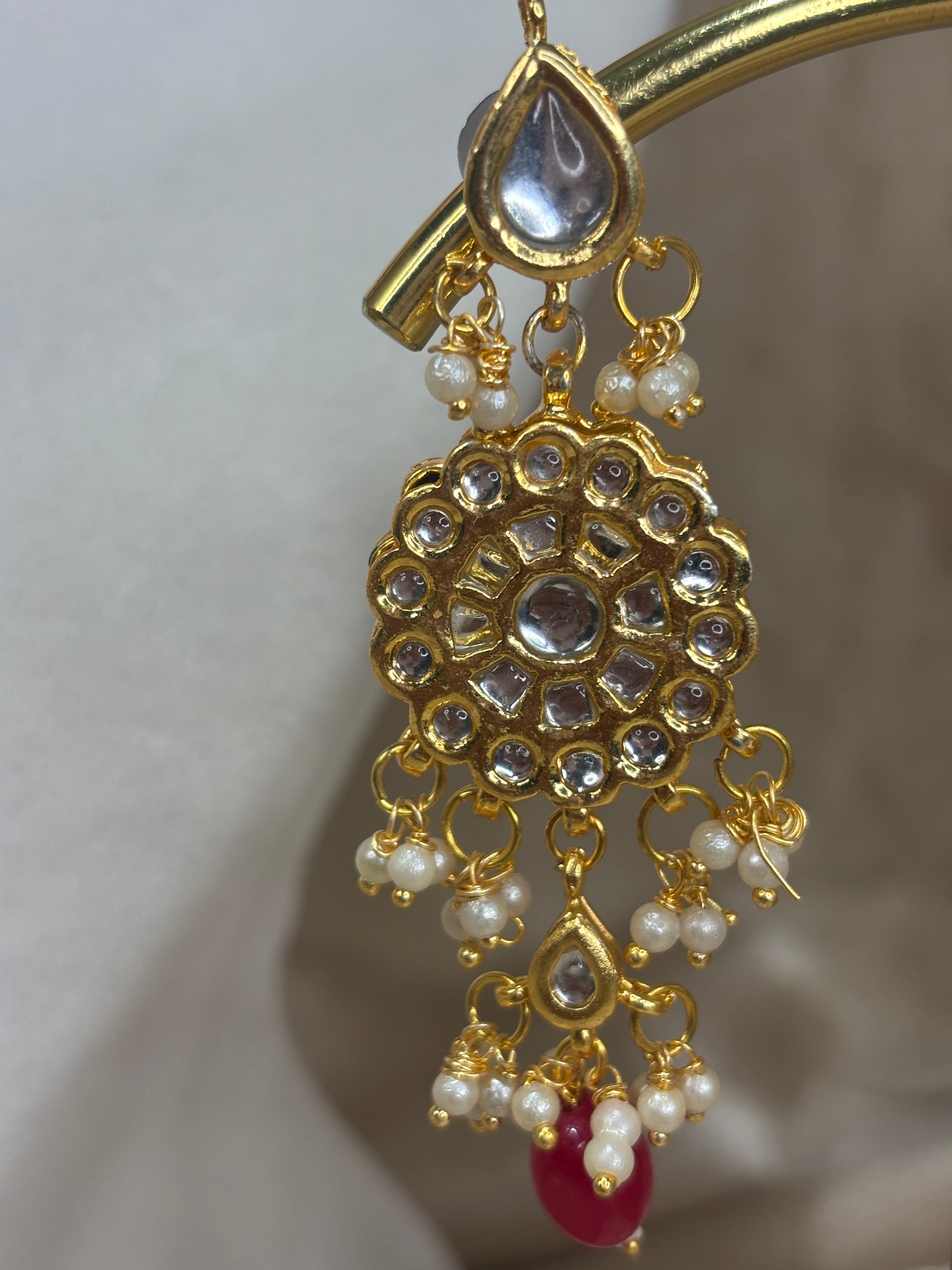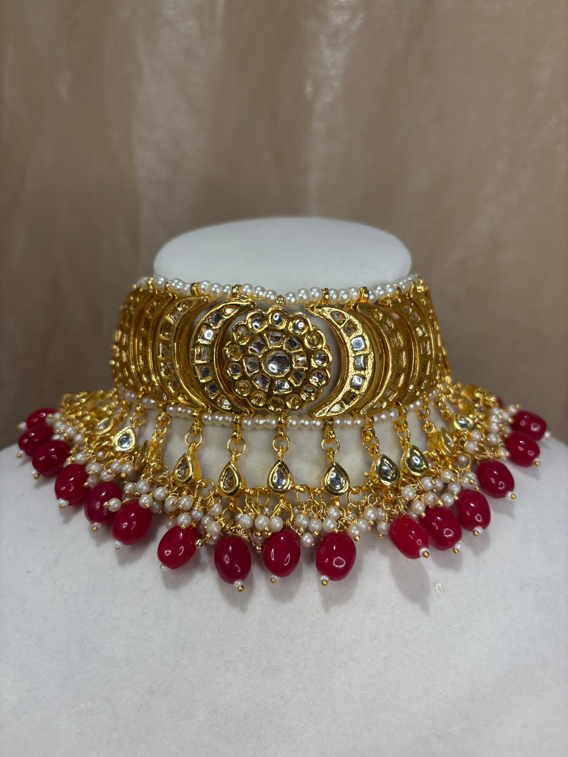 Red kundan choker with pearl details; comes with stud earrings and tikka