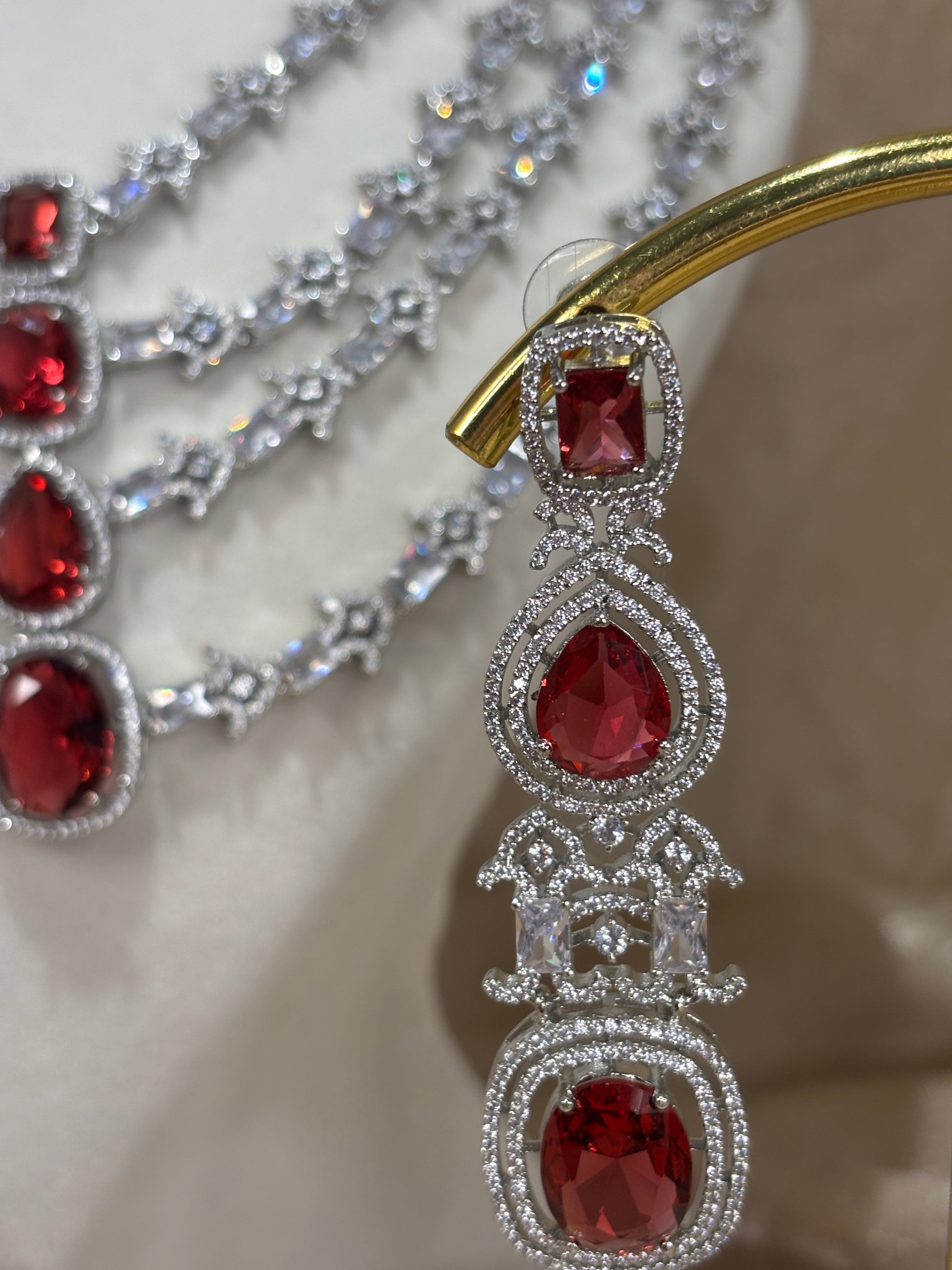 Ruby red 3-layer bridal American diamond necklace; comes with earrings