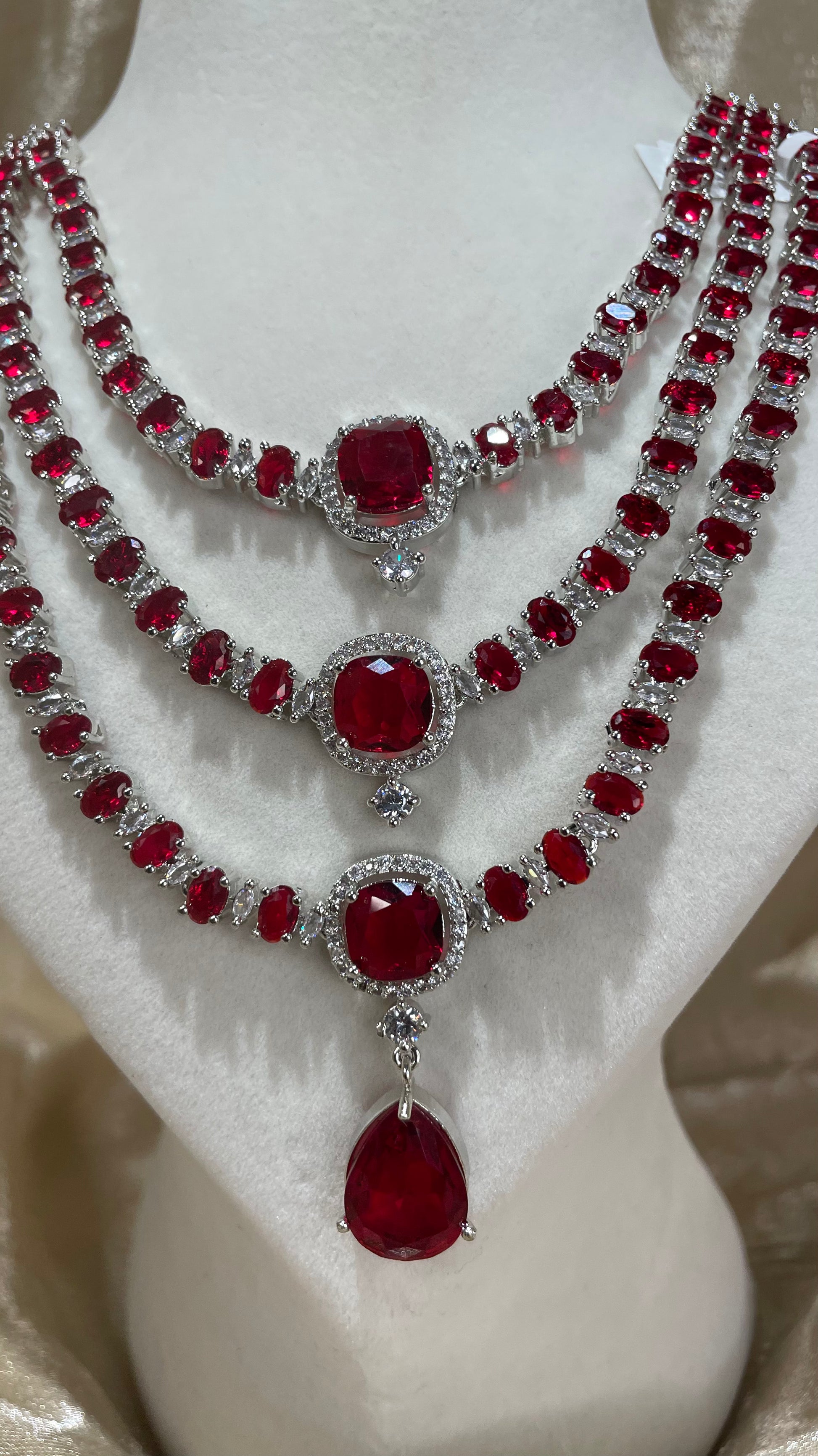 ruby red 3 layered American diamond necklace set; with earrings and tikka