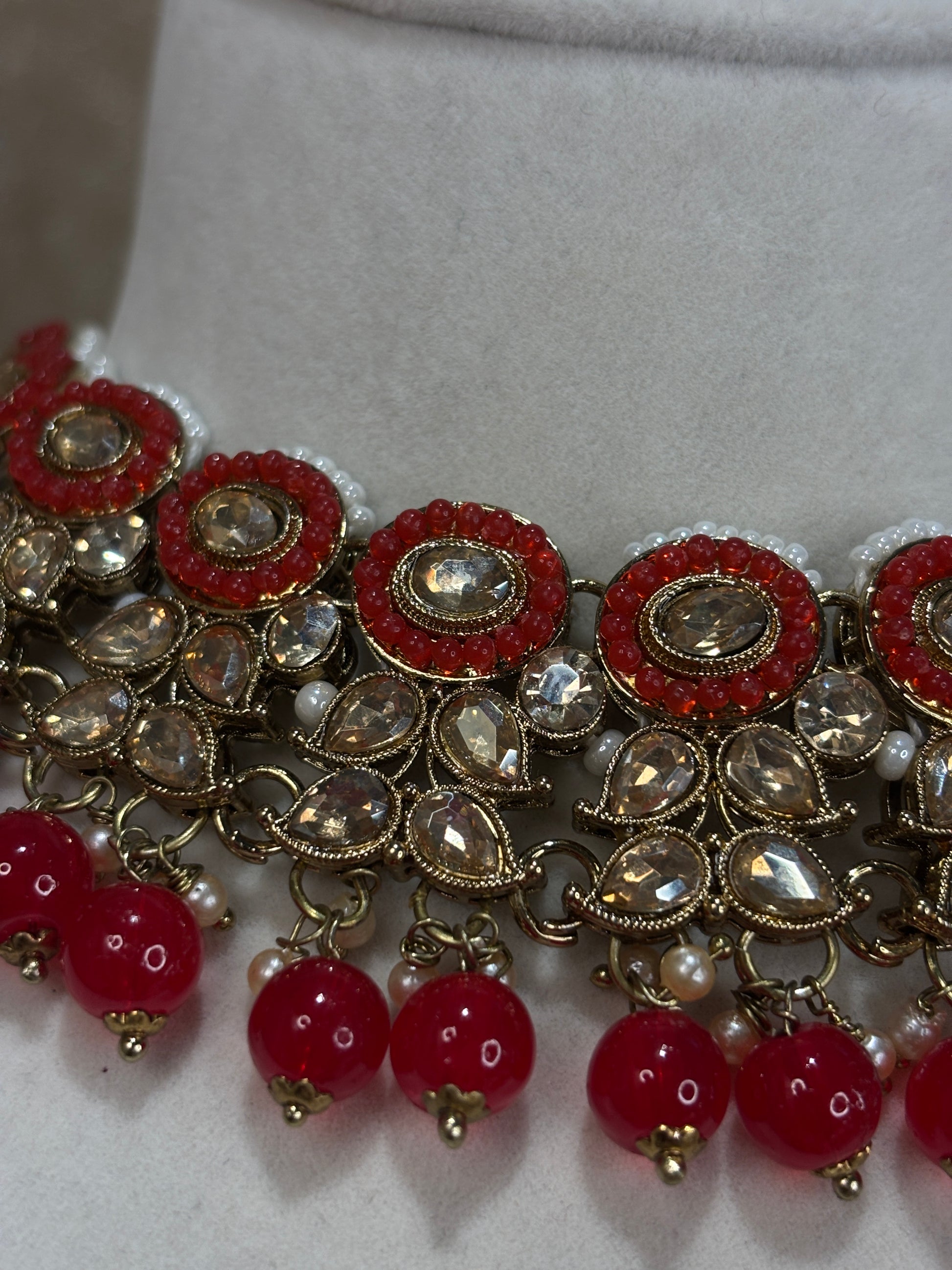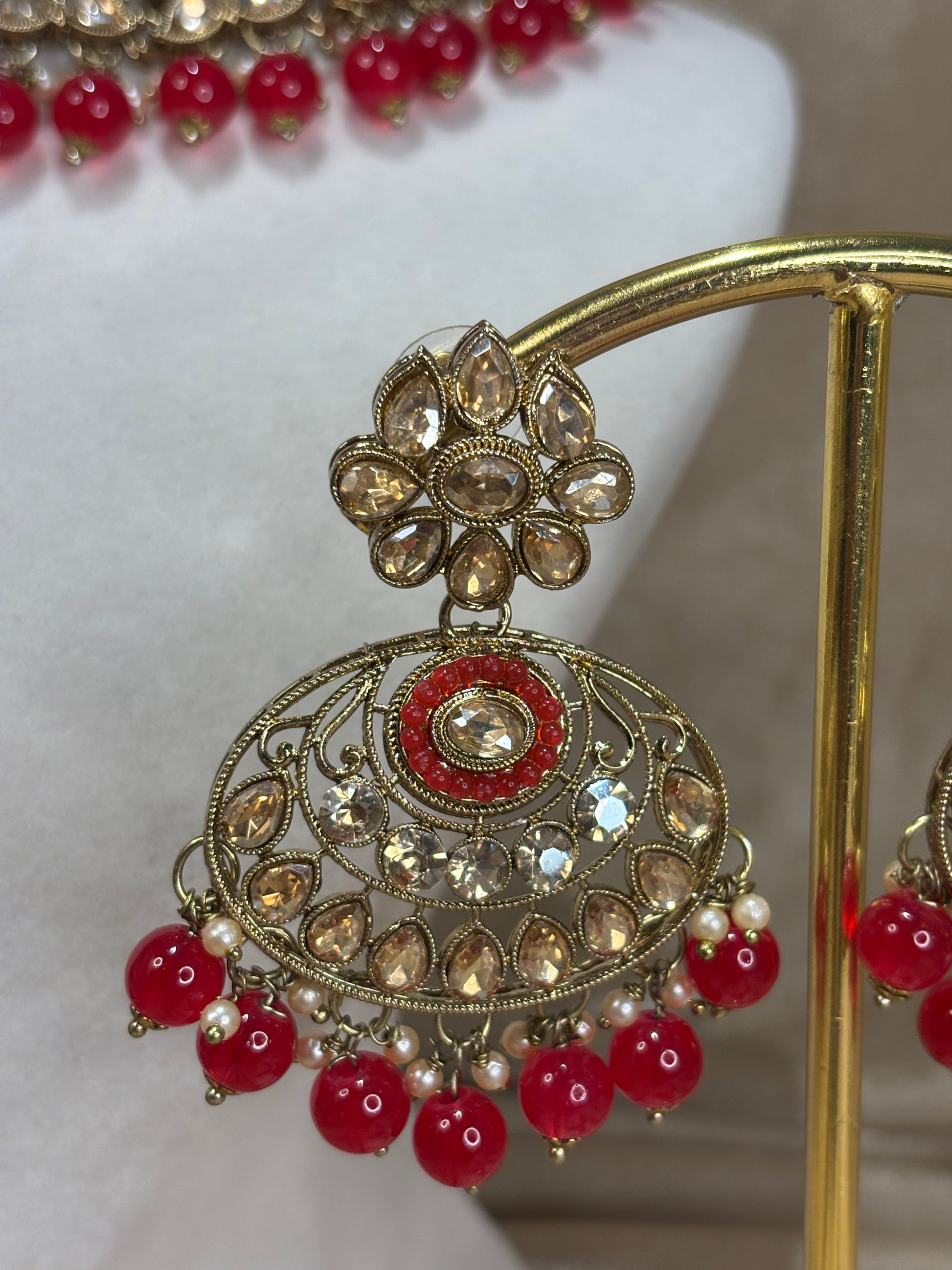 Bright red necklace set with small pearl details; comes with earrings And tikka