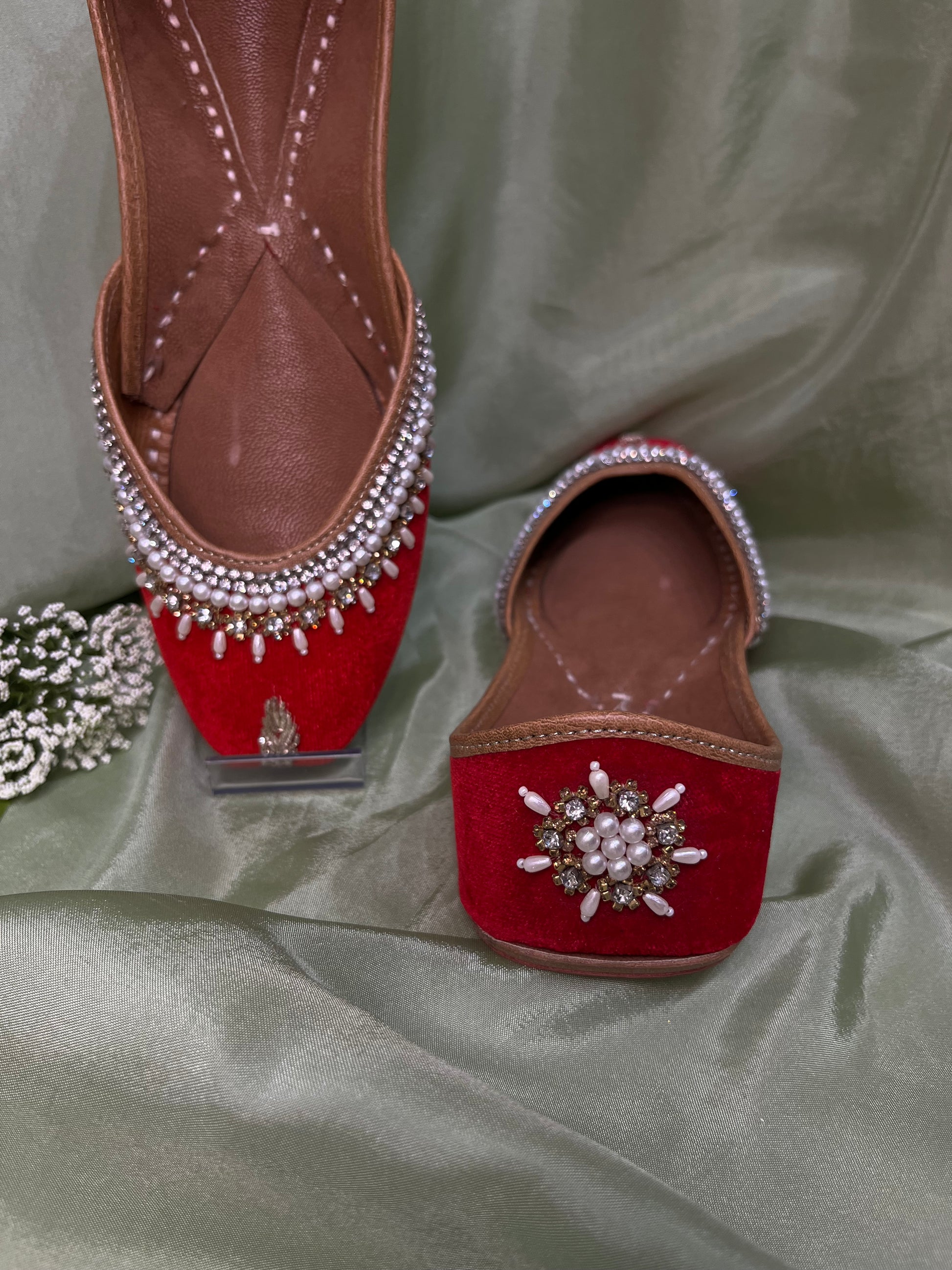 Bright red velvet jutti with pearl work. All of our juttiyan are double padded for maximum comfort!