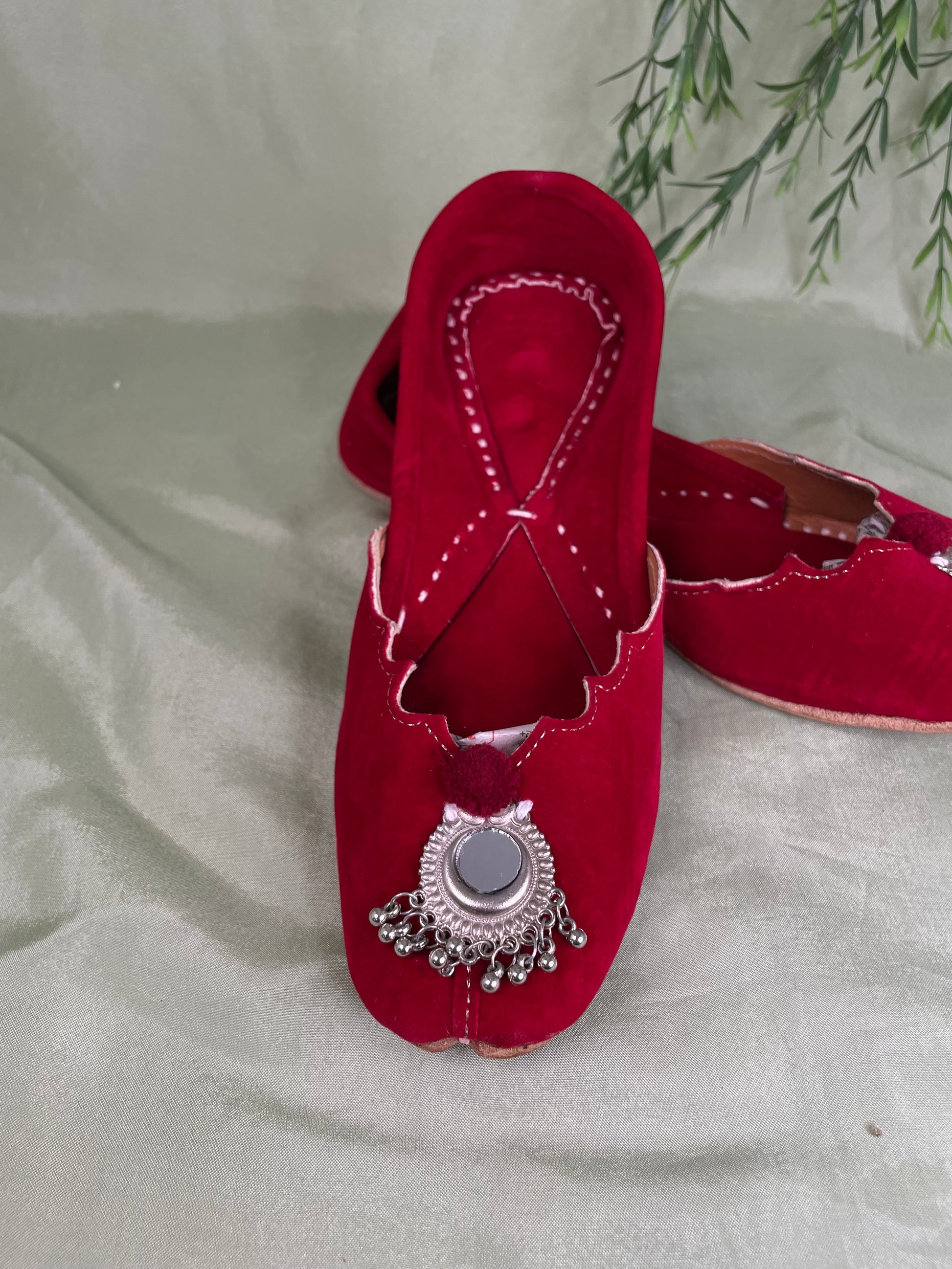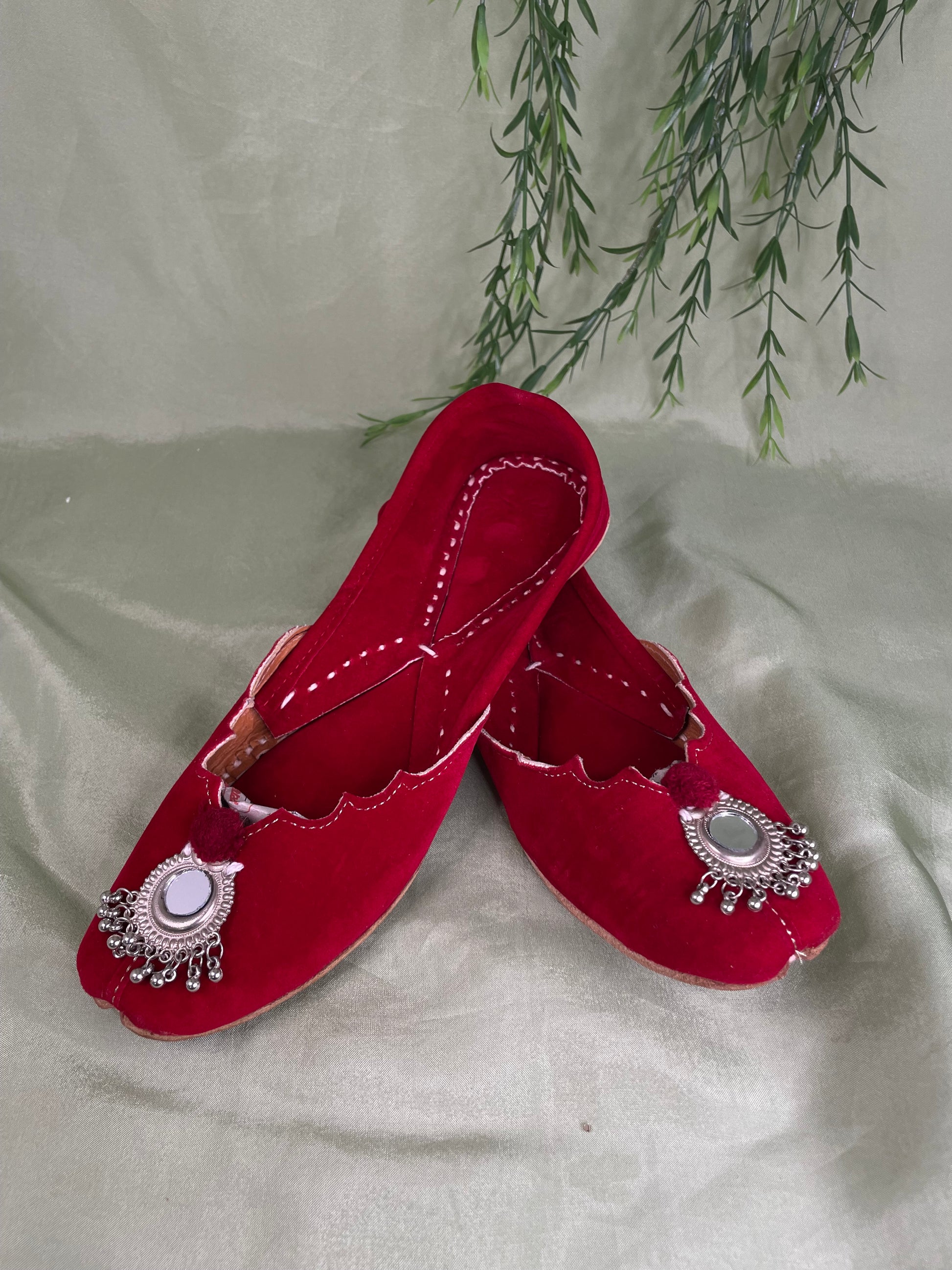 Deep red velvet jutti with oxidized pendent detail. All of our juttiyan are double padded for the most comfort.