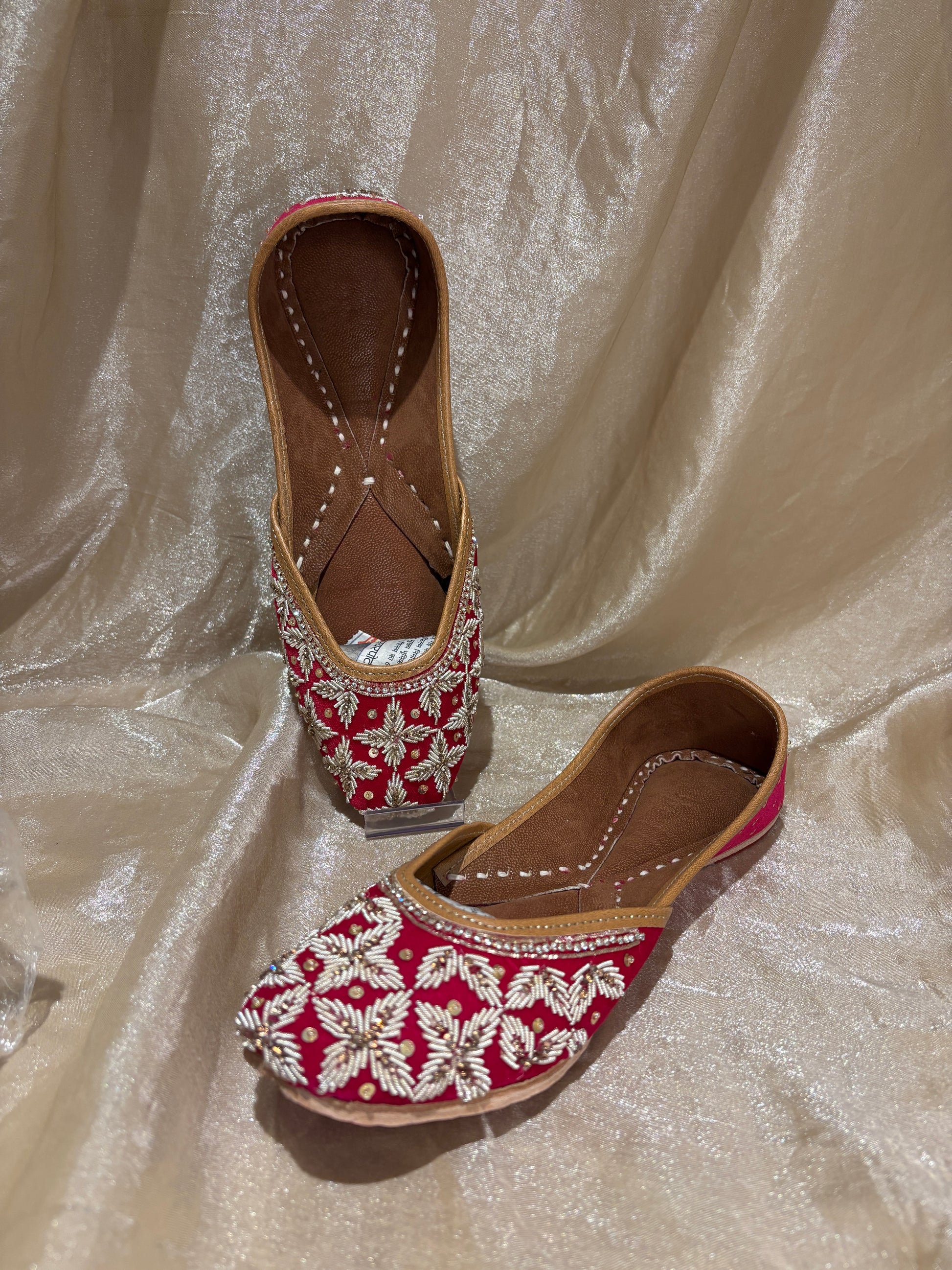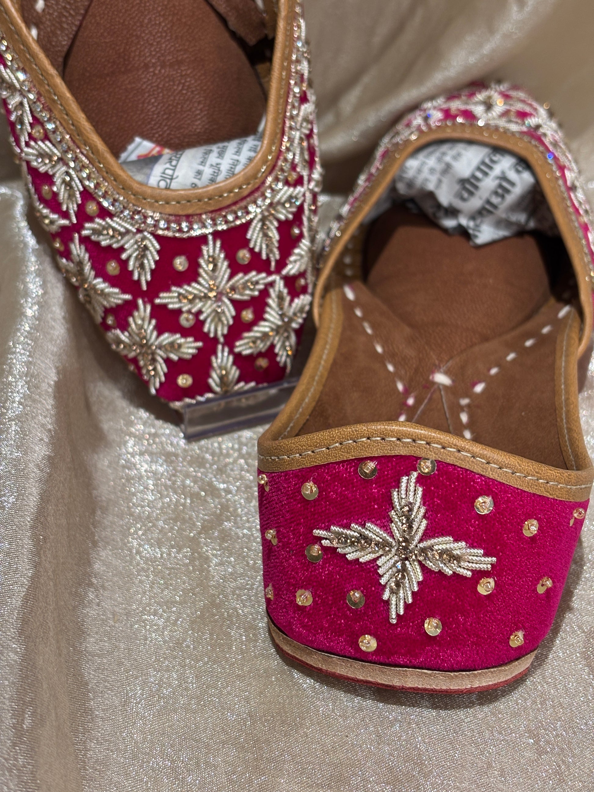 magenta punjabi jutti with detailed embroidery; all juttis come with double padding for ultimate comfort