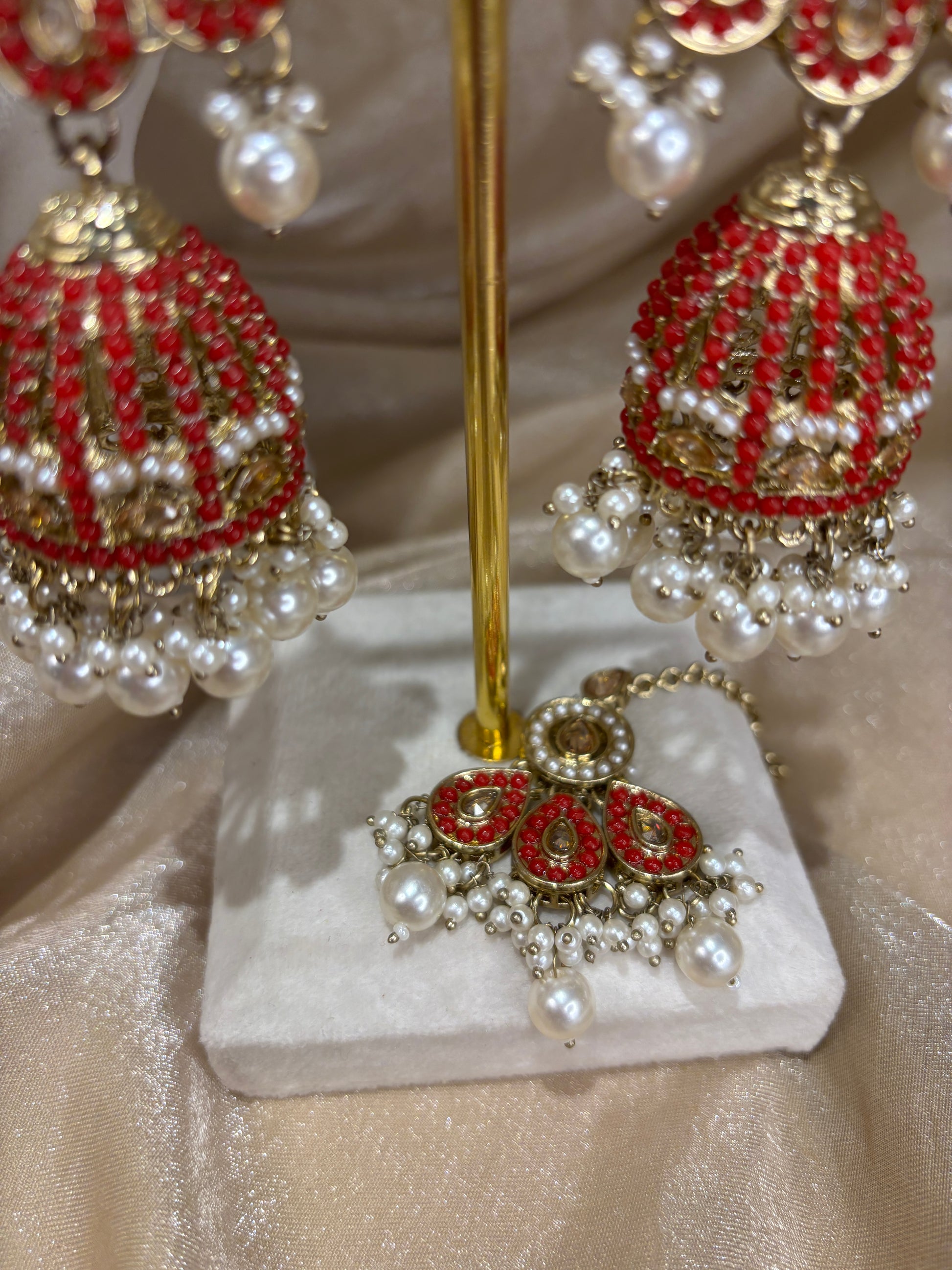 Pakistani nav rattan style necklace set with bright red accents and pearl details; comes with statement earrings and tikka
