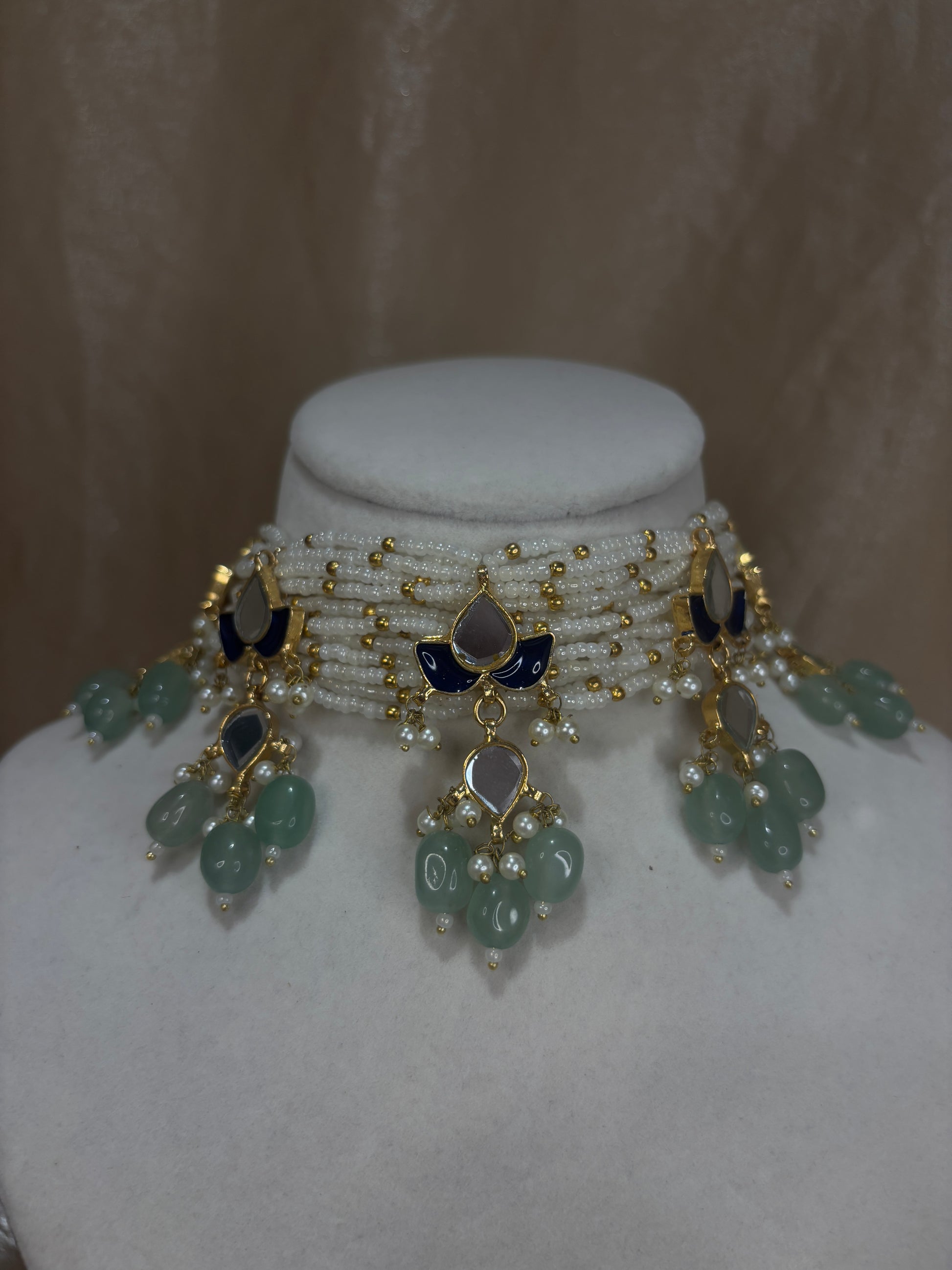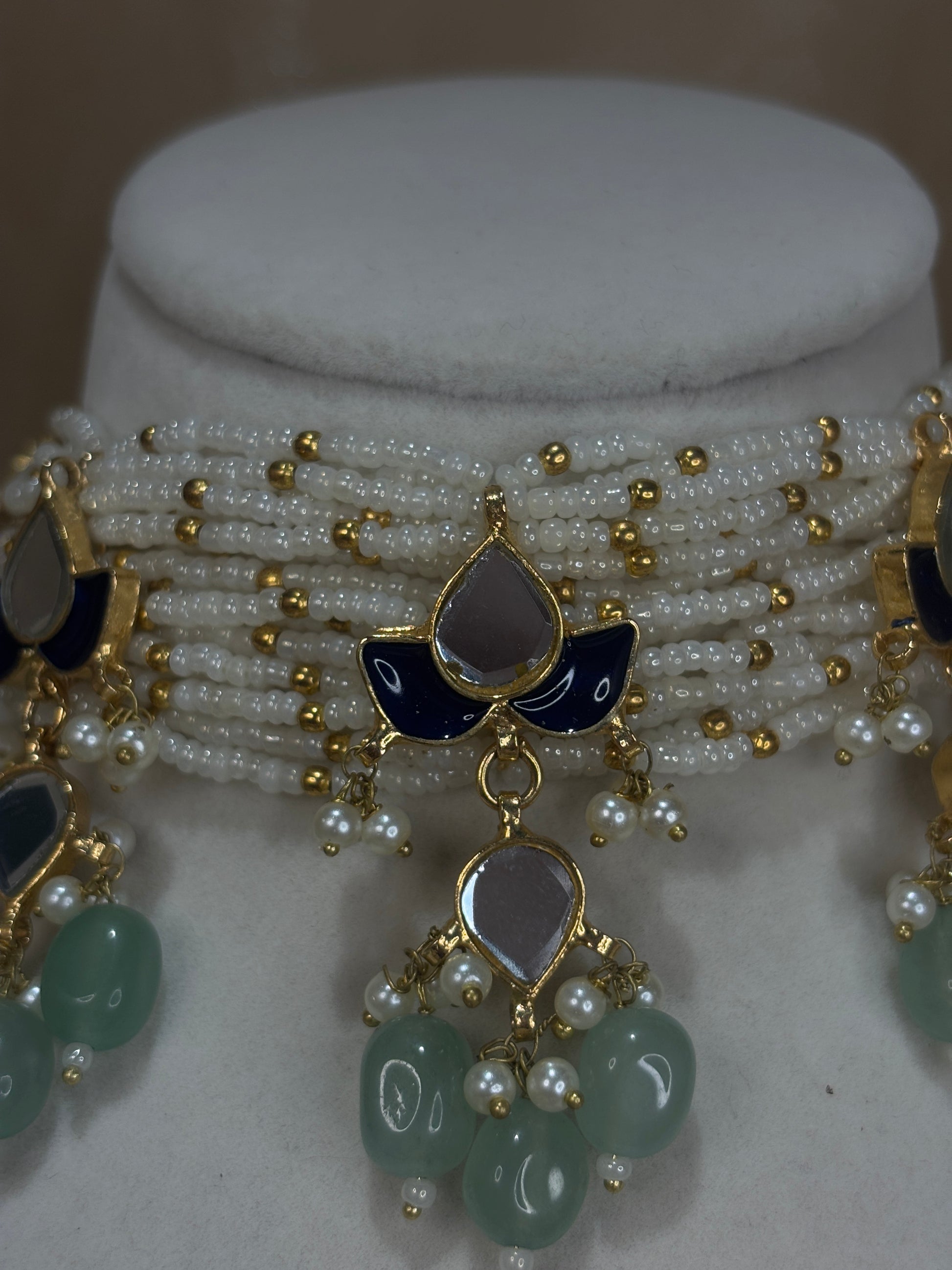 Royal blue and mint green 22k gold plated Pakistani thappa kundan set with pearl details; comes with earrings (with over the ear sahare) and tikka