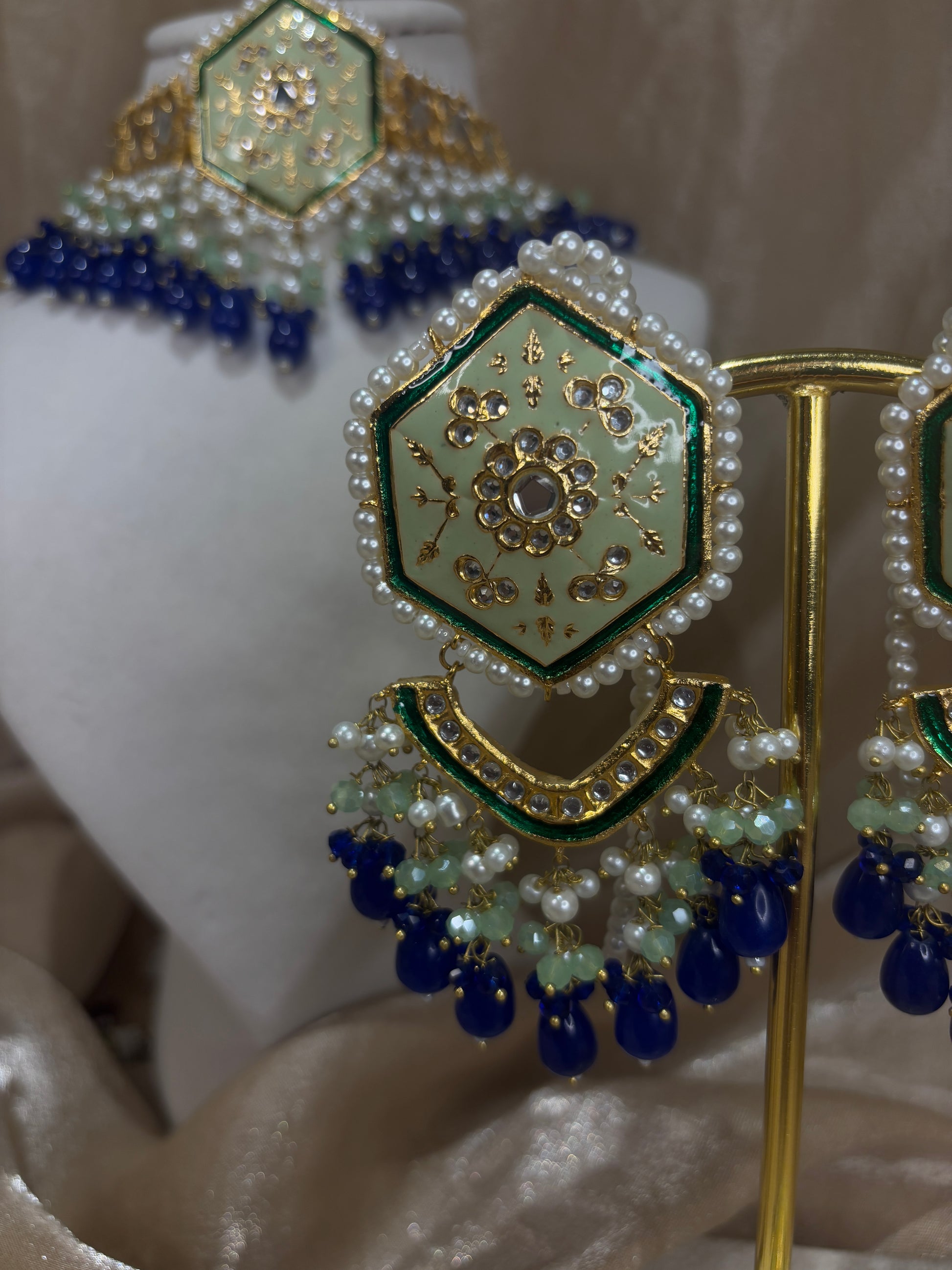 Royal blue and mint green 22k gold plated Pakistani thappa kundan choker with meenakari (hand painted) details; comes with heavy earrings (with over the ear pearl sahare) and tikka