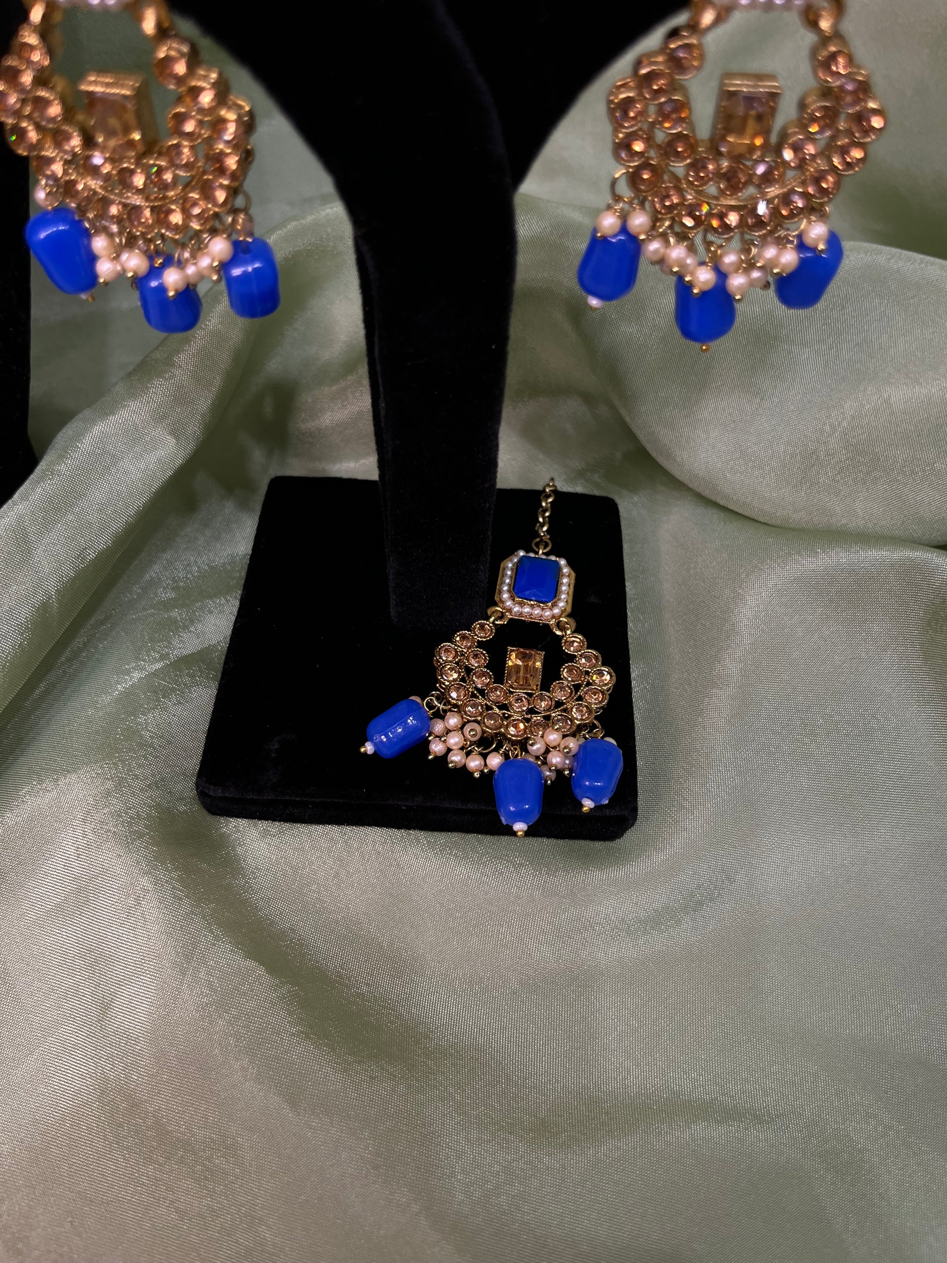 Royal blue choker with flower/pearl details; comes with earrings and tikka.