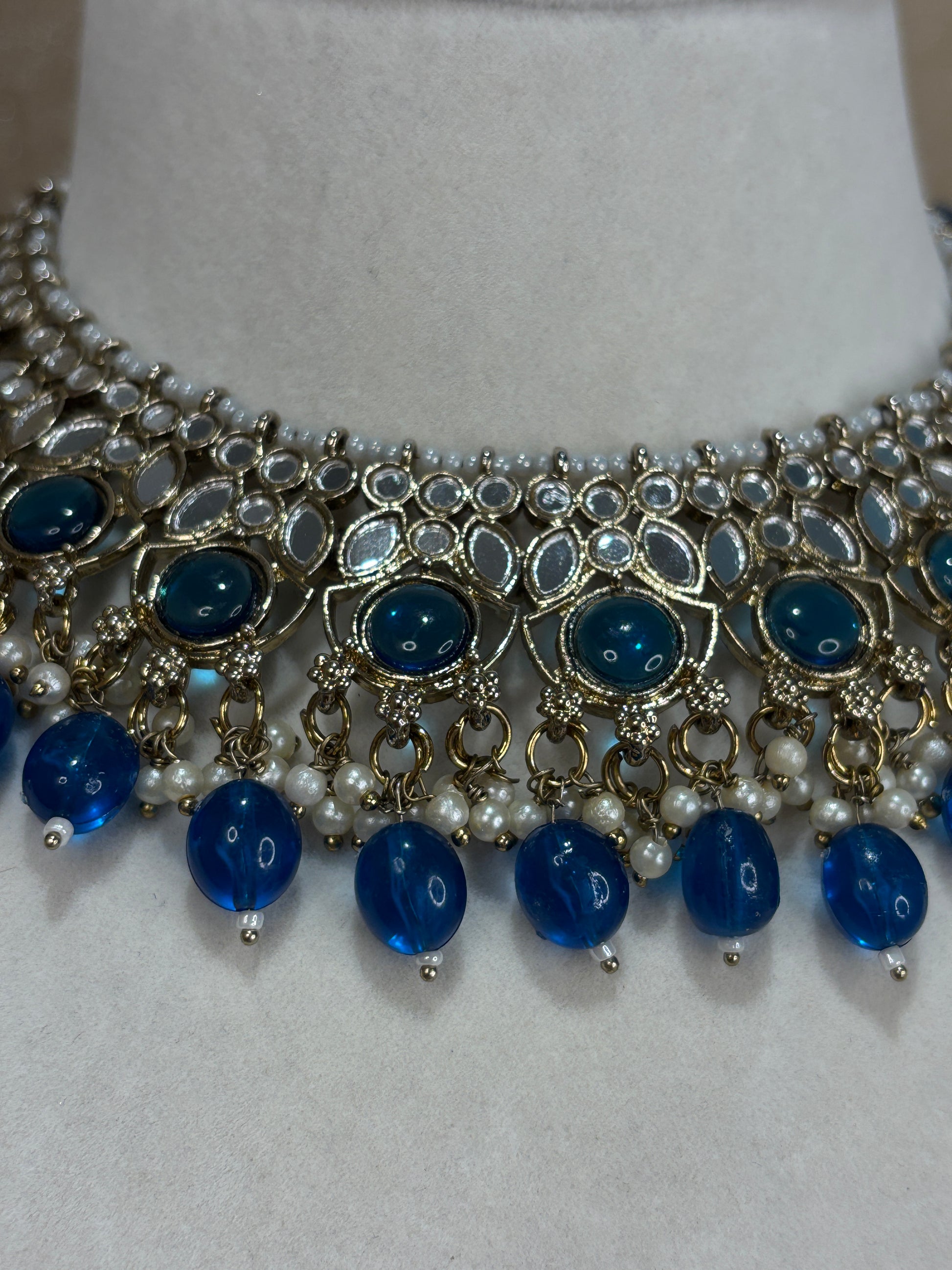 Stunning royal blue mirror work necklace with small pearl details; comes with earrings and tikka