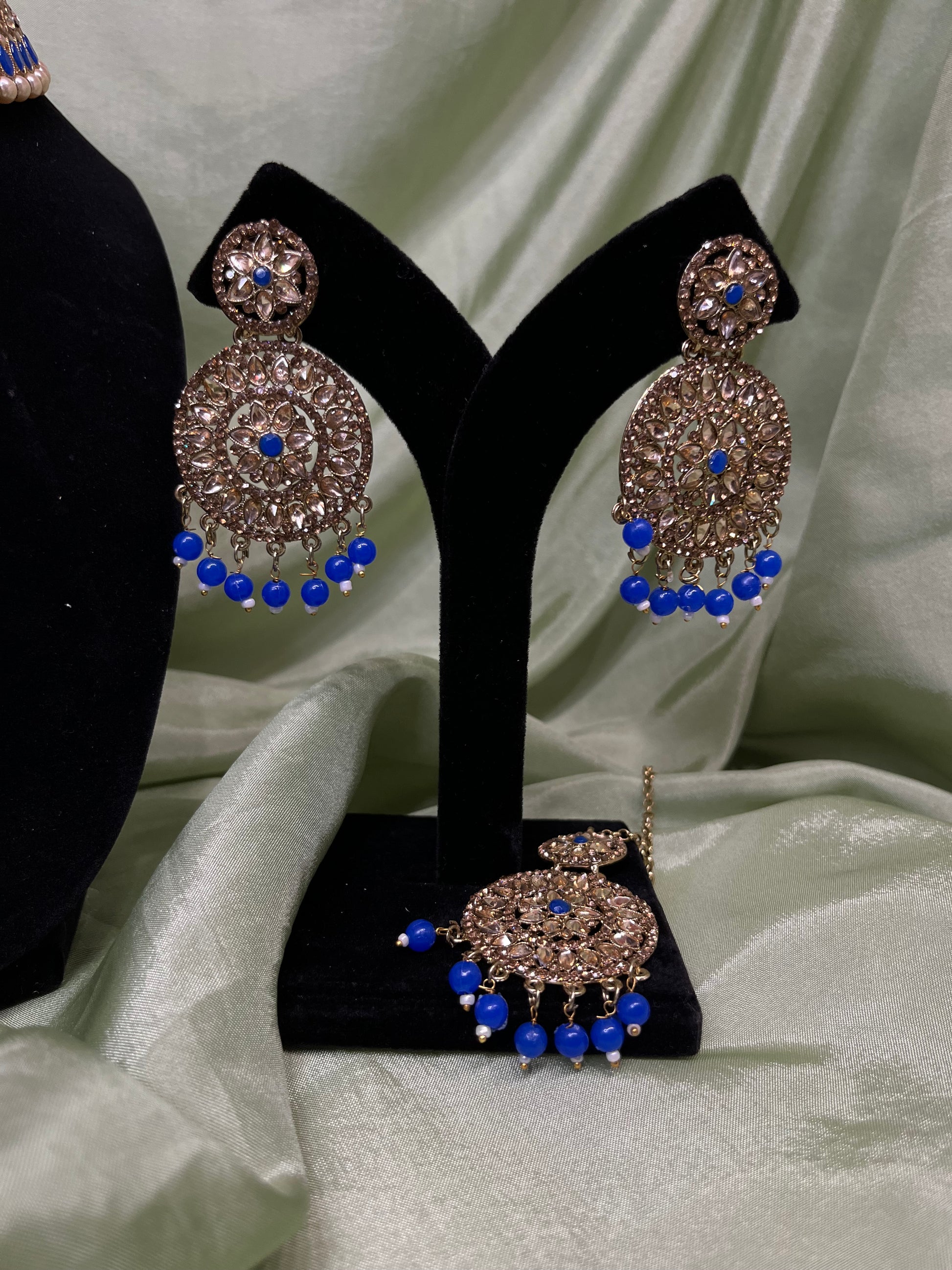 Royal blue necklace with pearl details; comes with round shaped earrings and tikka.