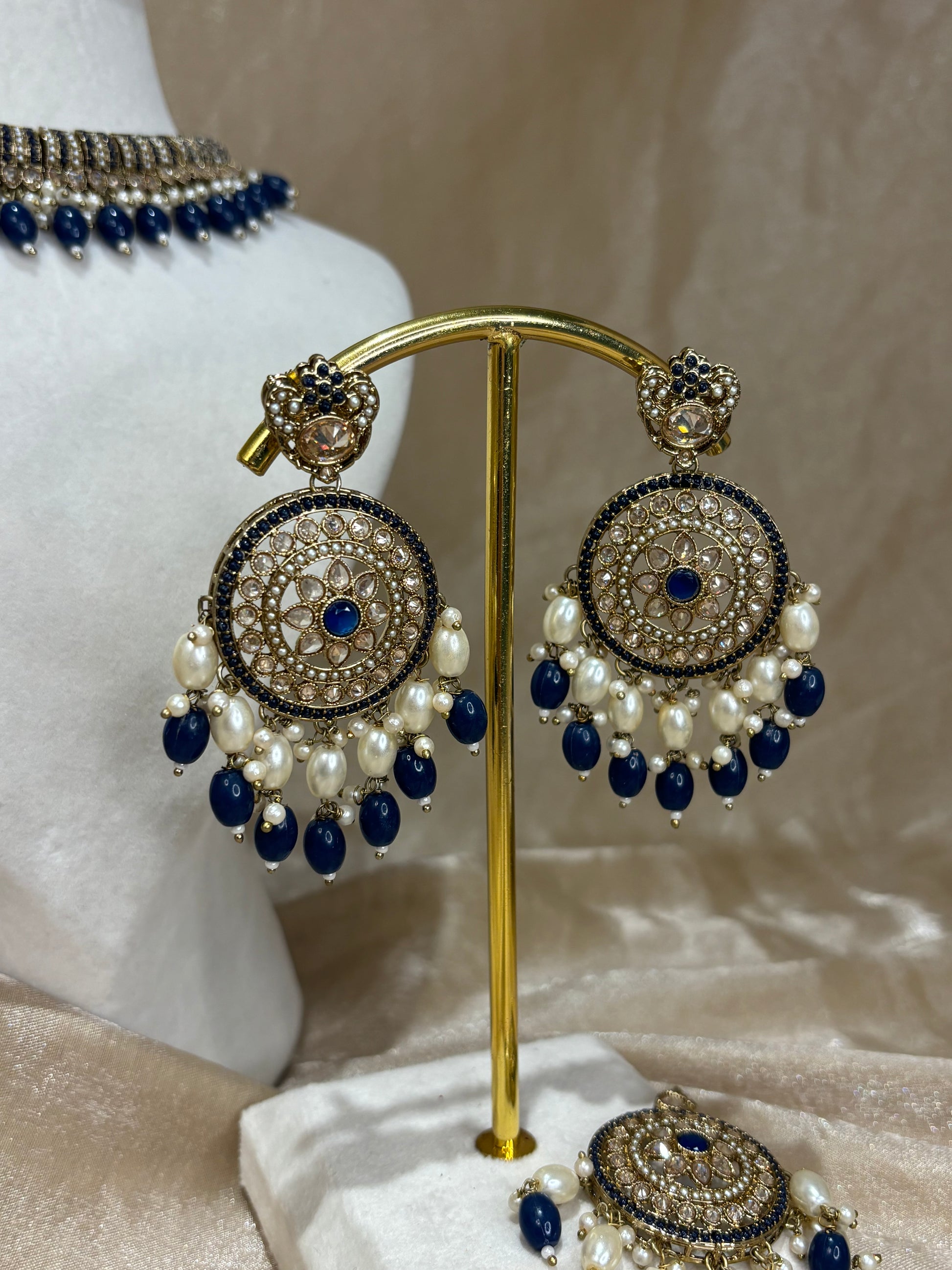 Royal blue necklace set with pearl details; comes with heavy earrings and tikka