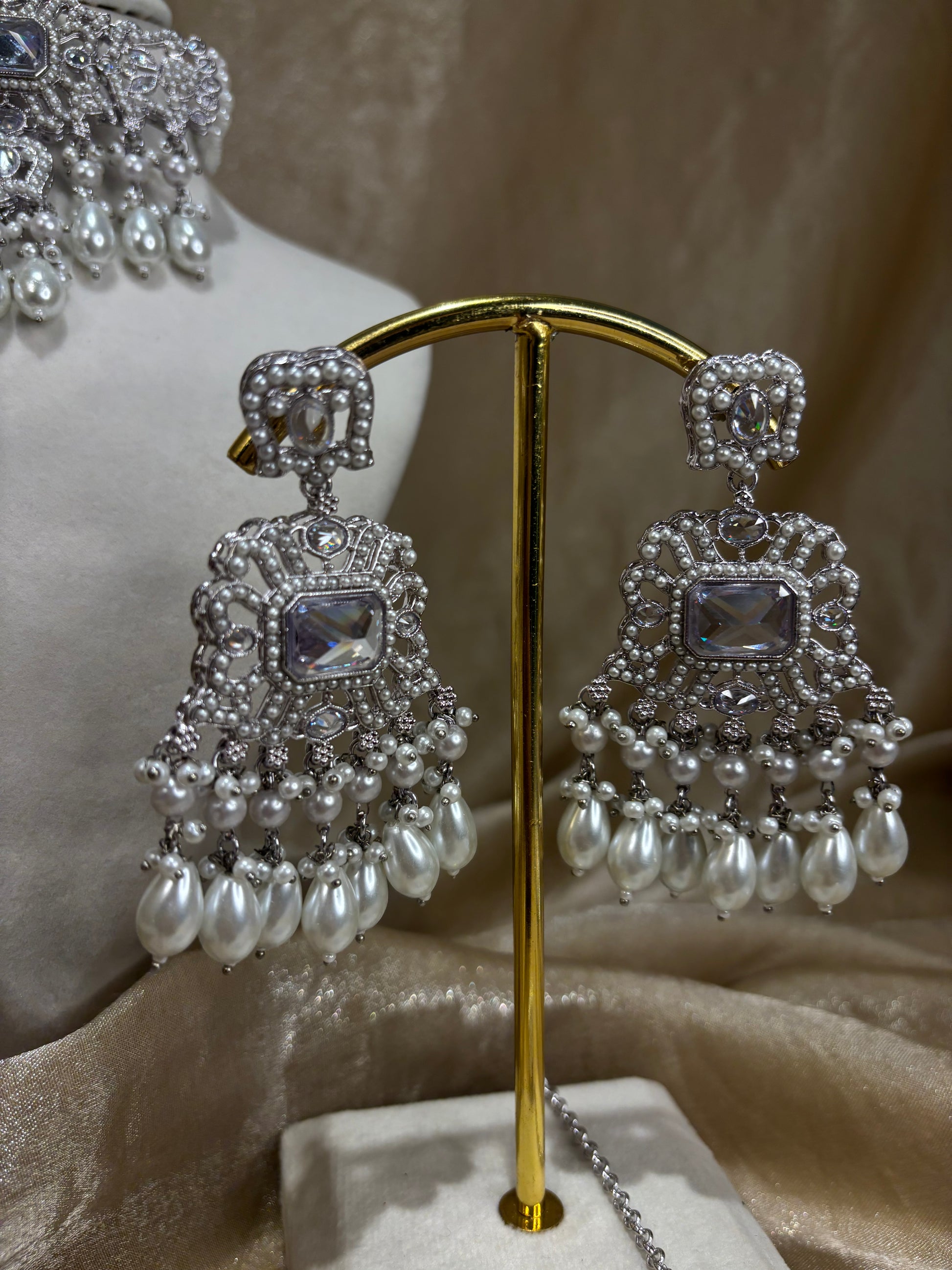 Silver choker set with pearl details; comes with heavy earrings and tikka