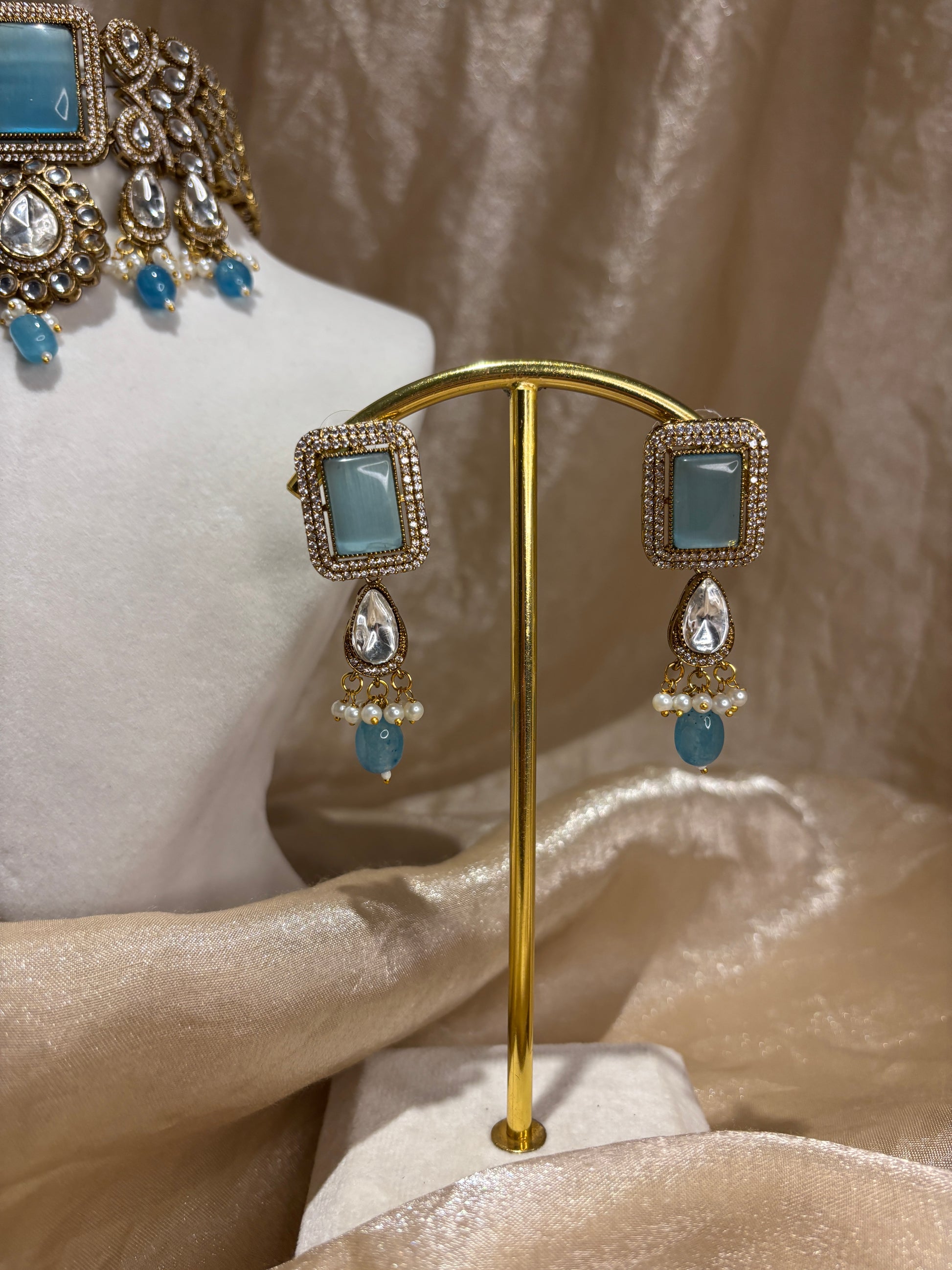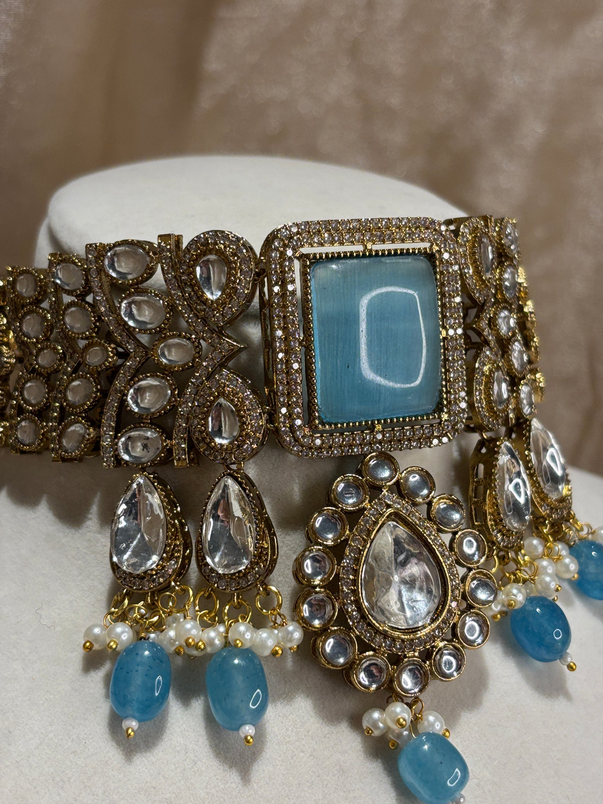 Tiyani kundan choker set with sky blue/frozi Mona Lisa stones