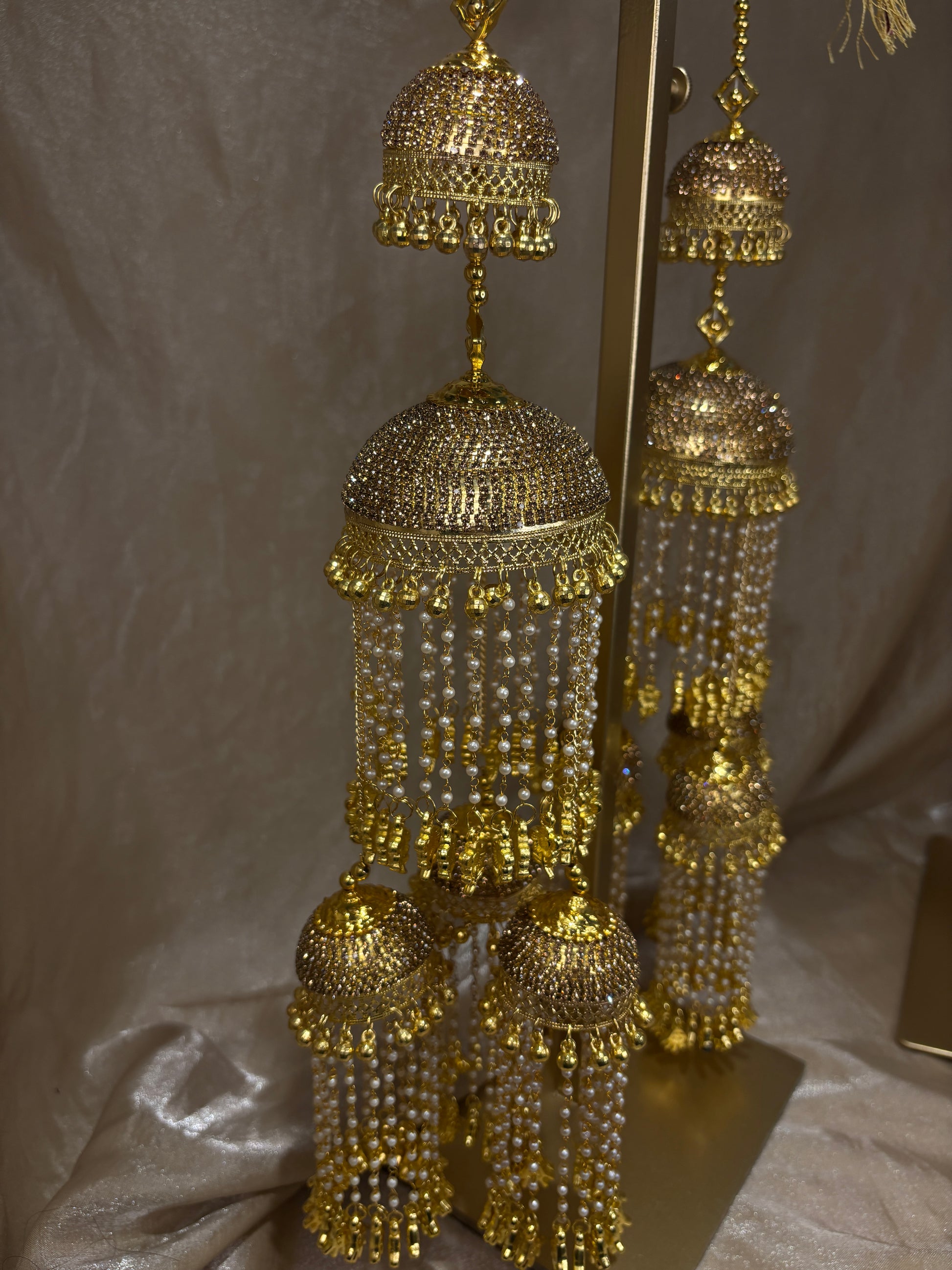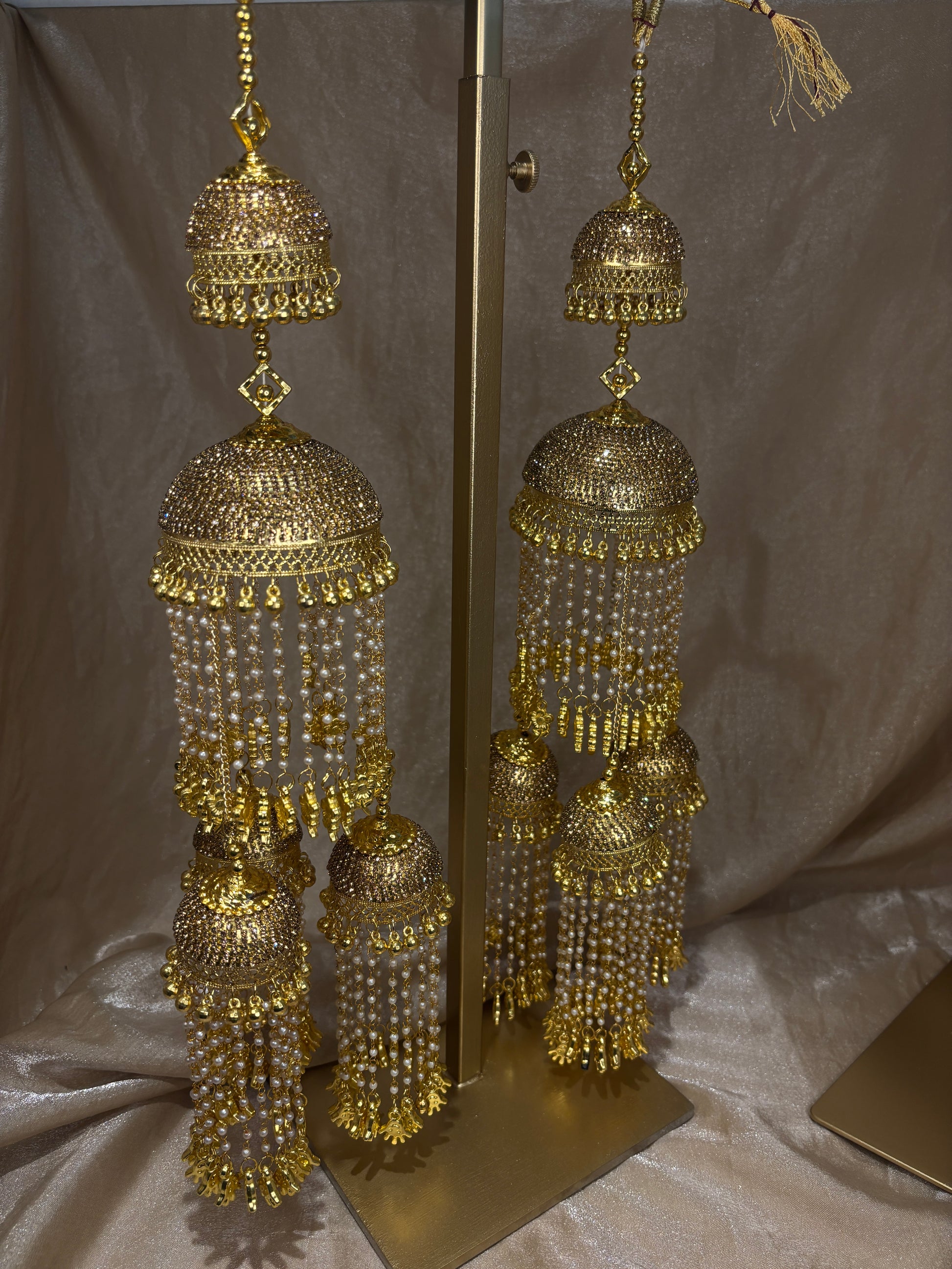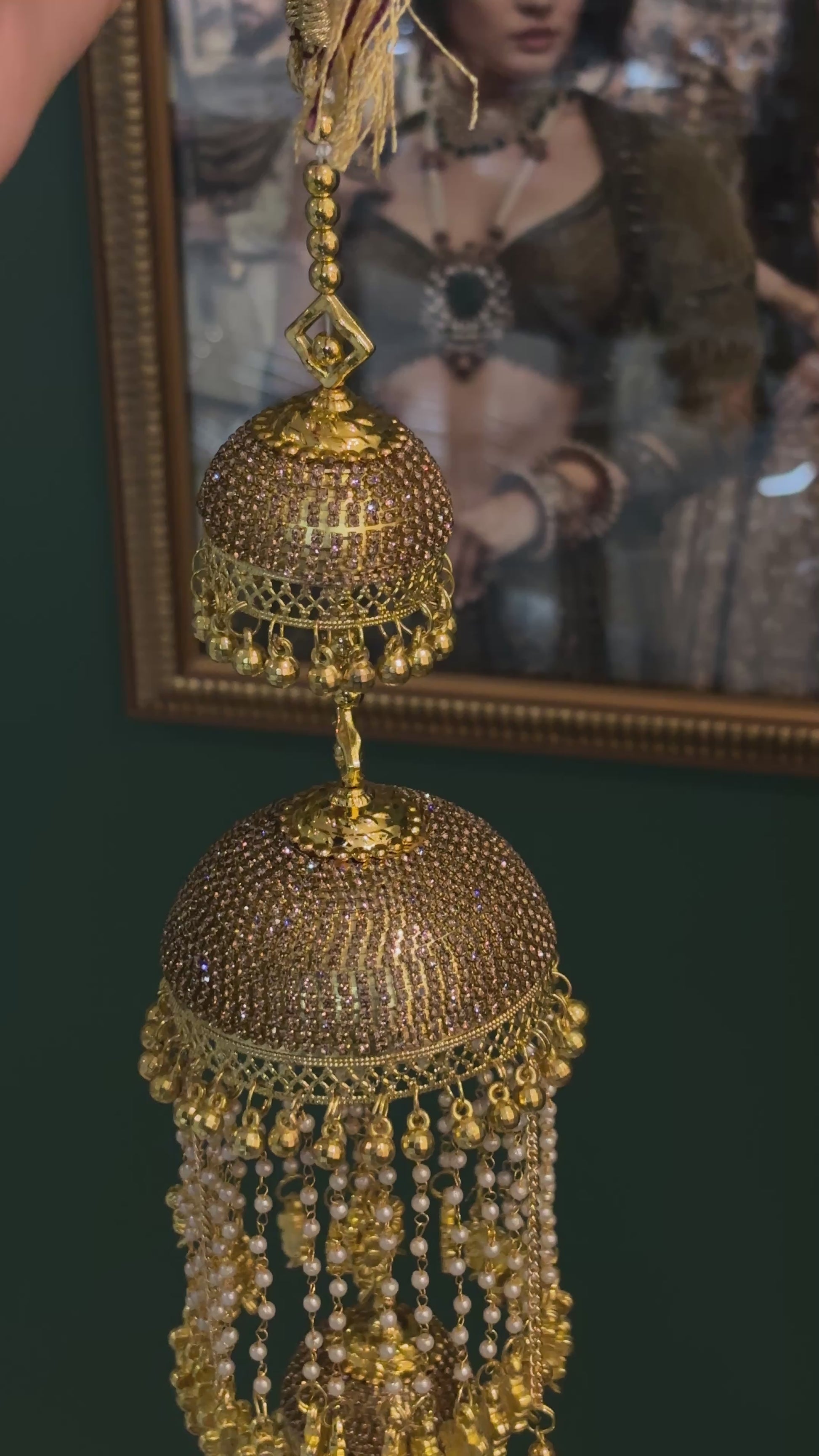 Stunning statement 3 layer pipal Patti kaleeray with bell and small pearl details; comes with adjustable string to attach to wrist. About 15.5 inches long