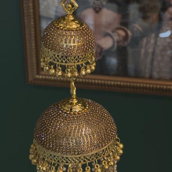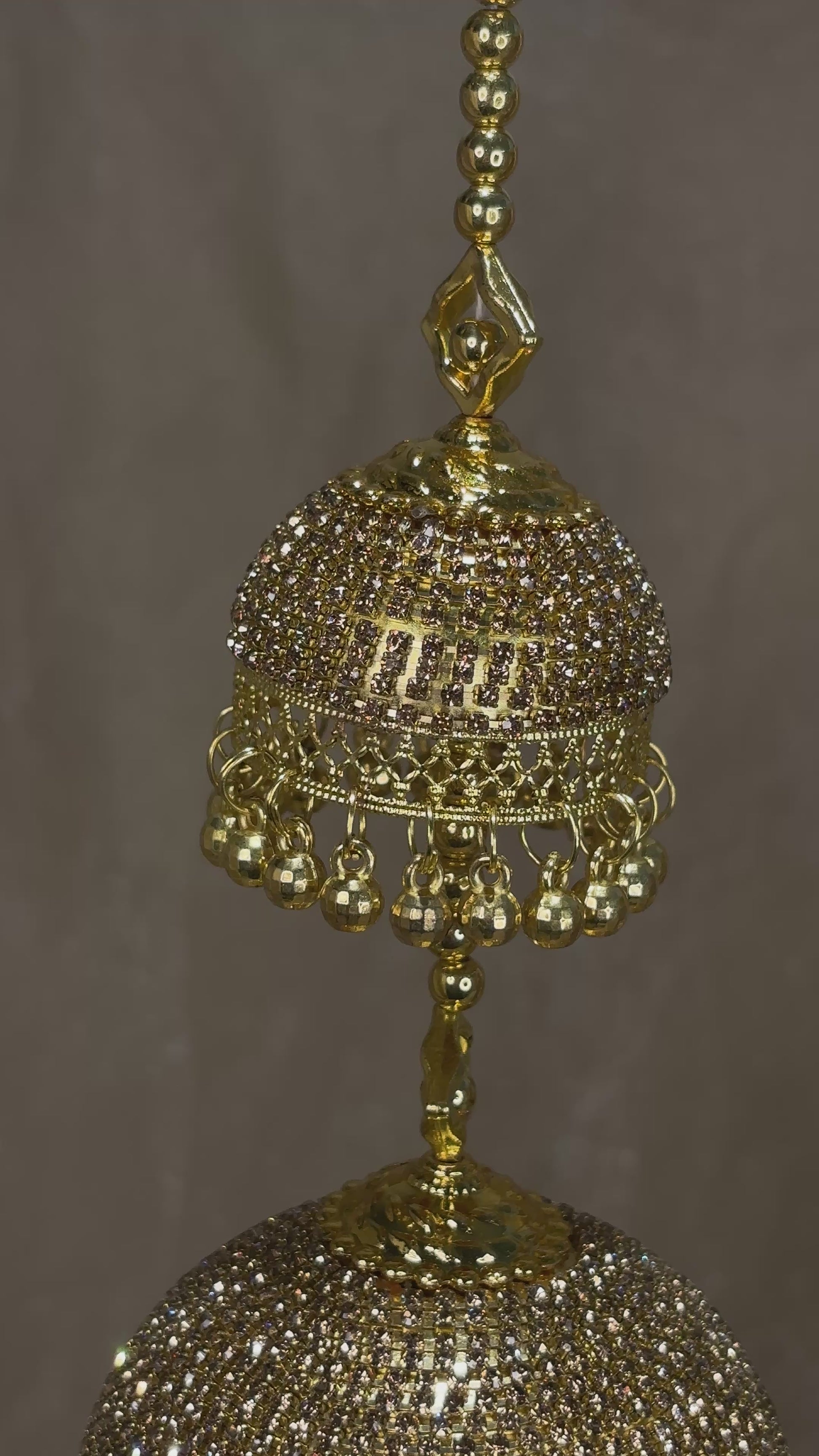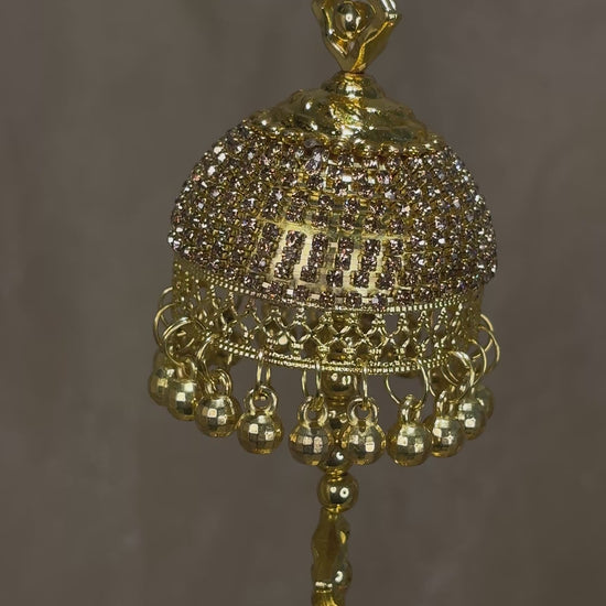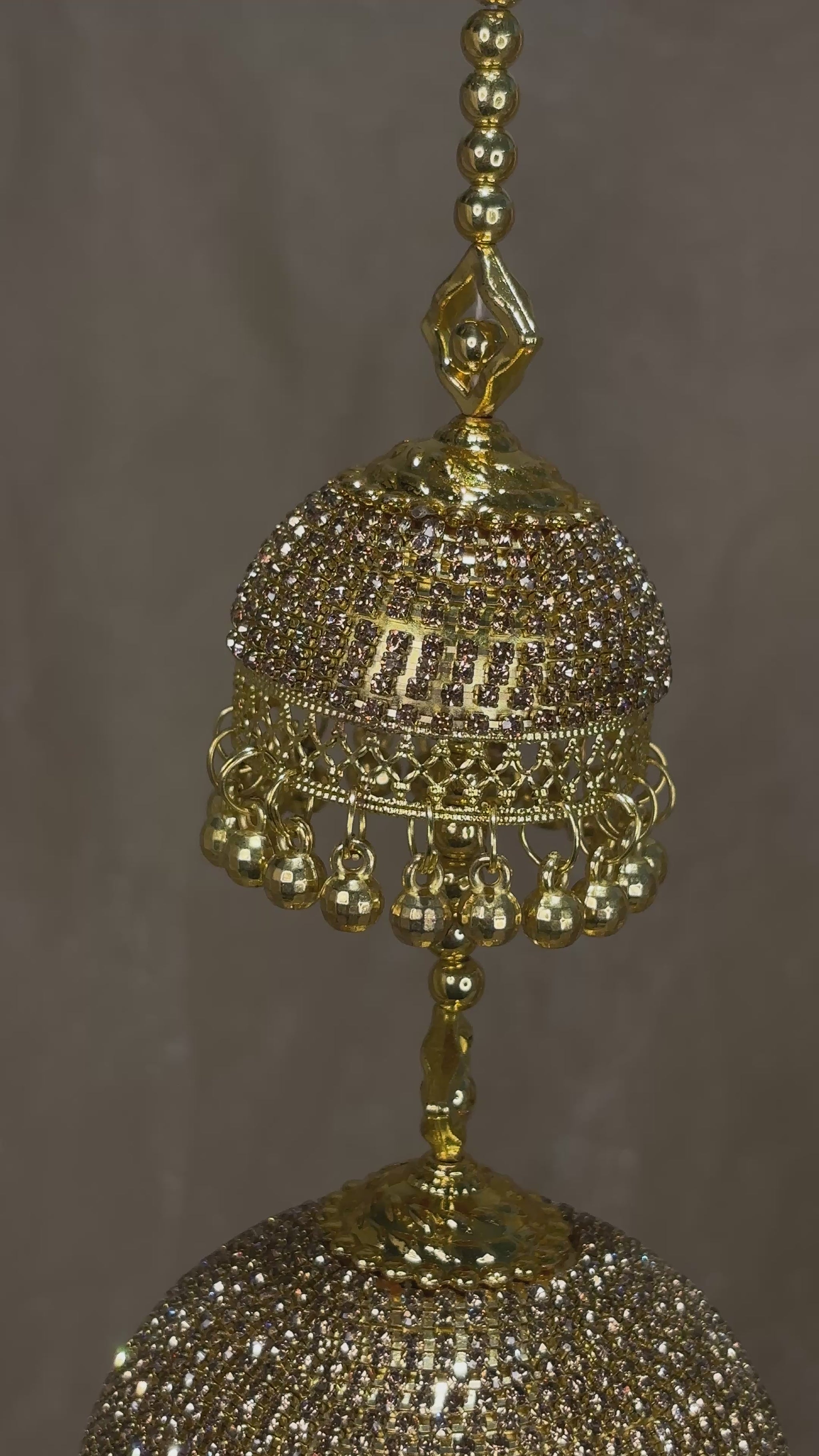 Stunning statement 3 layer pipal Patti kaleeray with bell and small pearl details; comes with adjustable string to attach to wrist. About 15.5 inches long