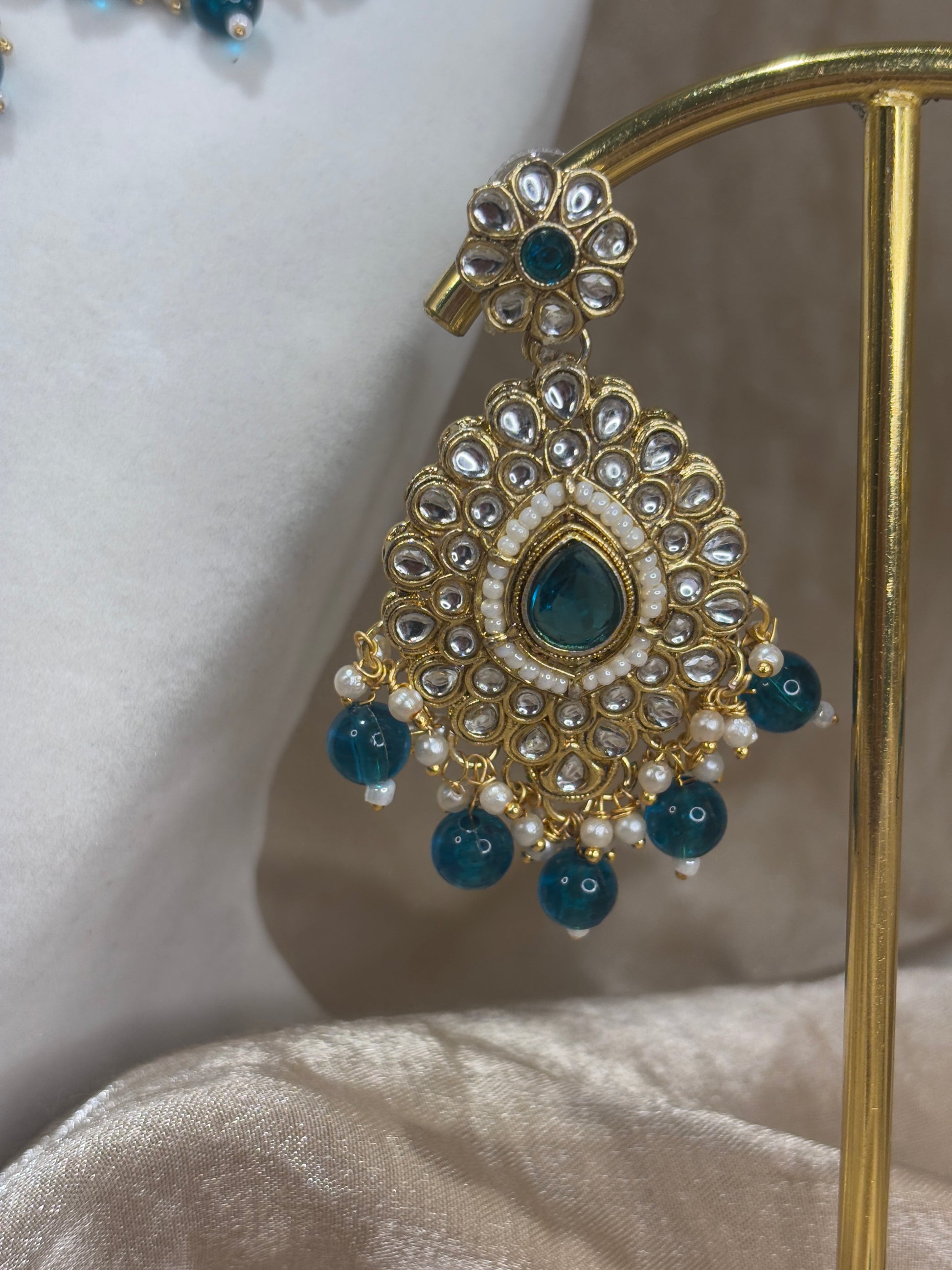 Teal/green kundan choker set with pearl details; comes with earrings and tikka