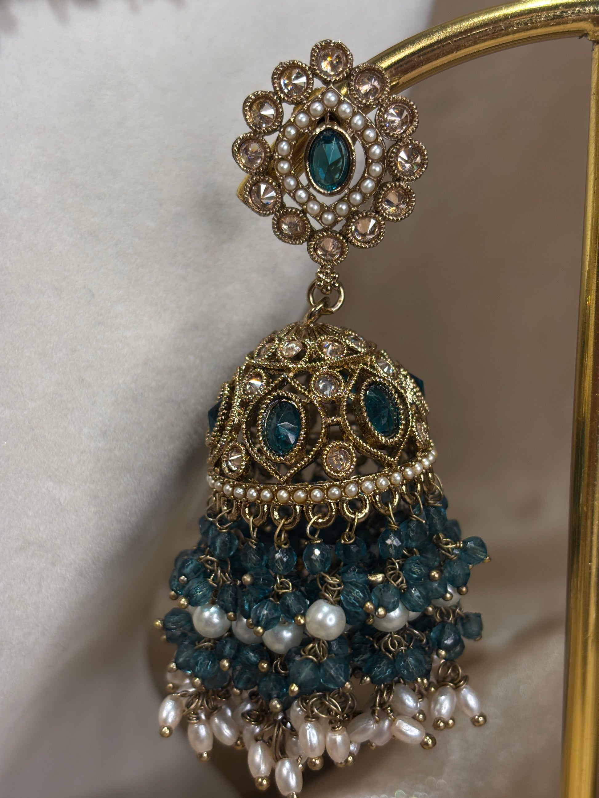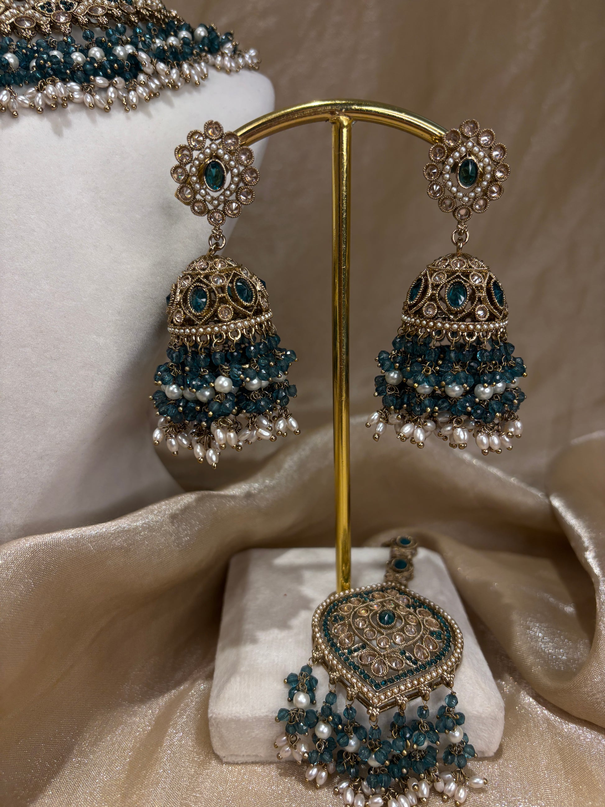 Heavy teal/peacock blue necklace set with small pearl details; comes with jhumki and tikka