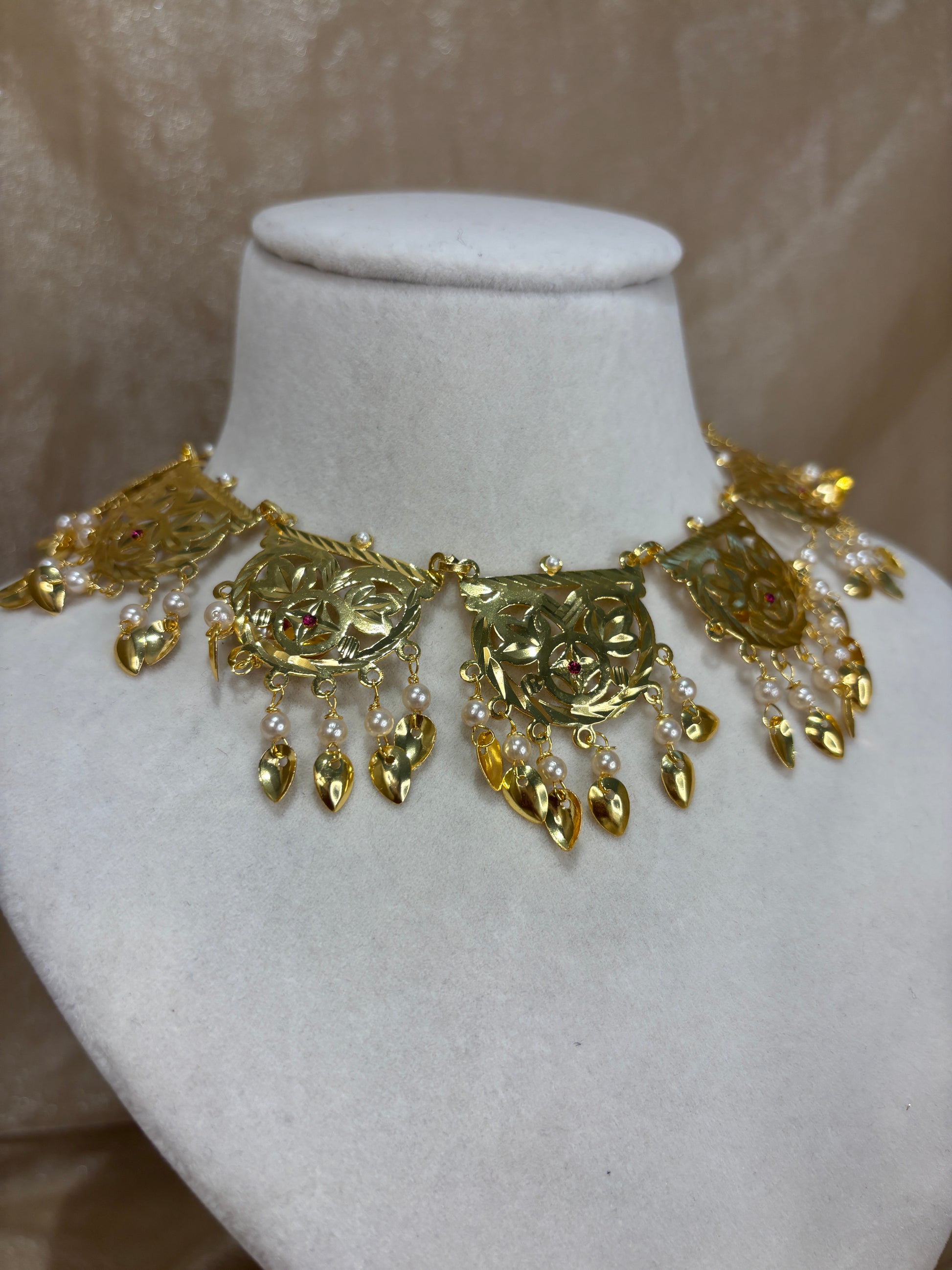 Traditional yellow gold pipal Patti necklace set; comes with earrings and tikka