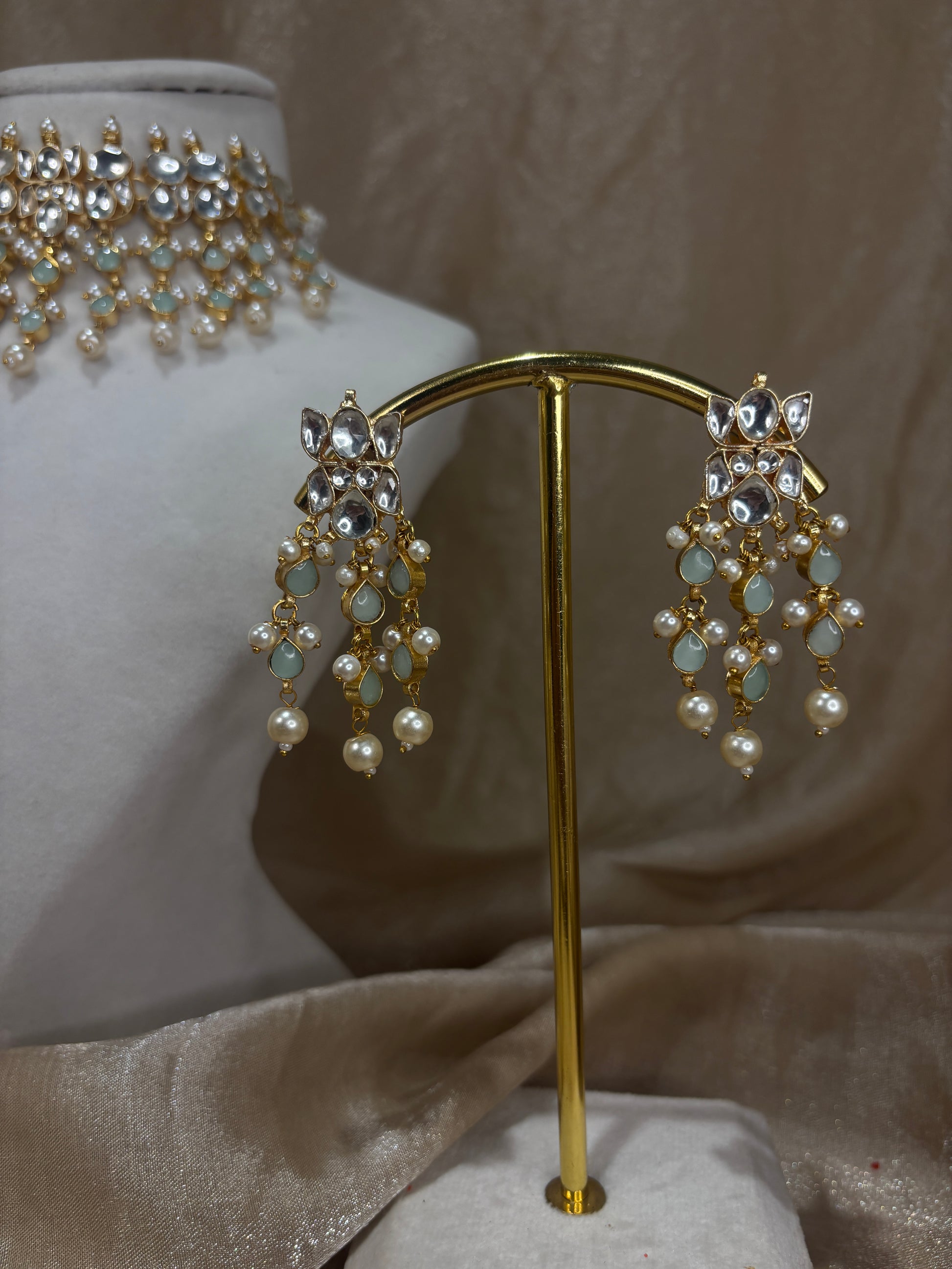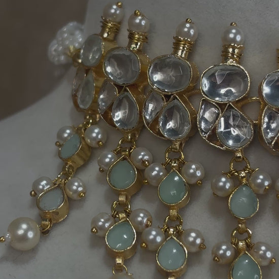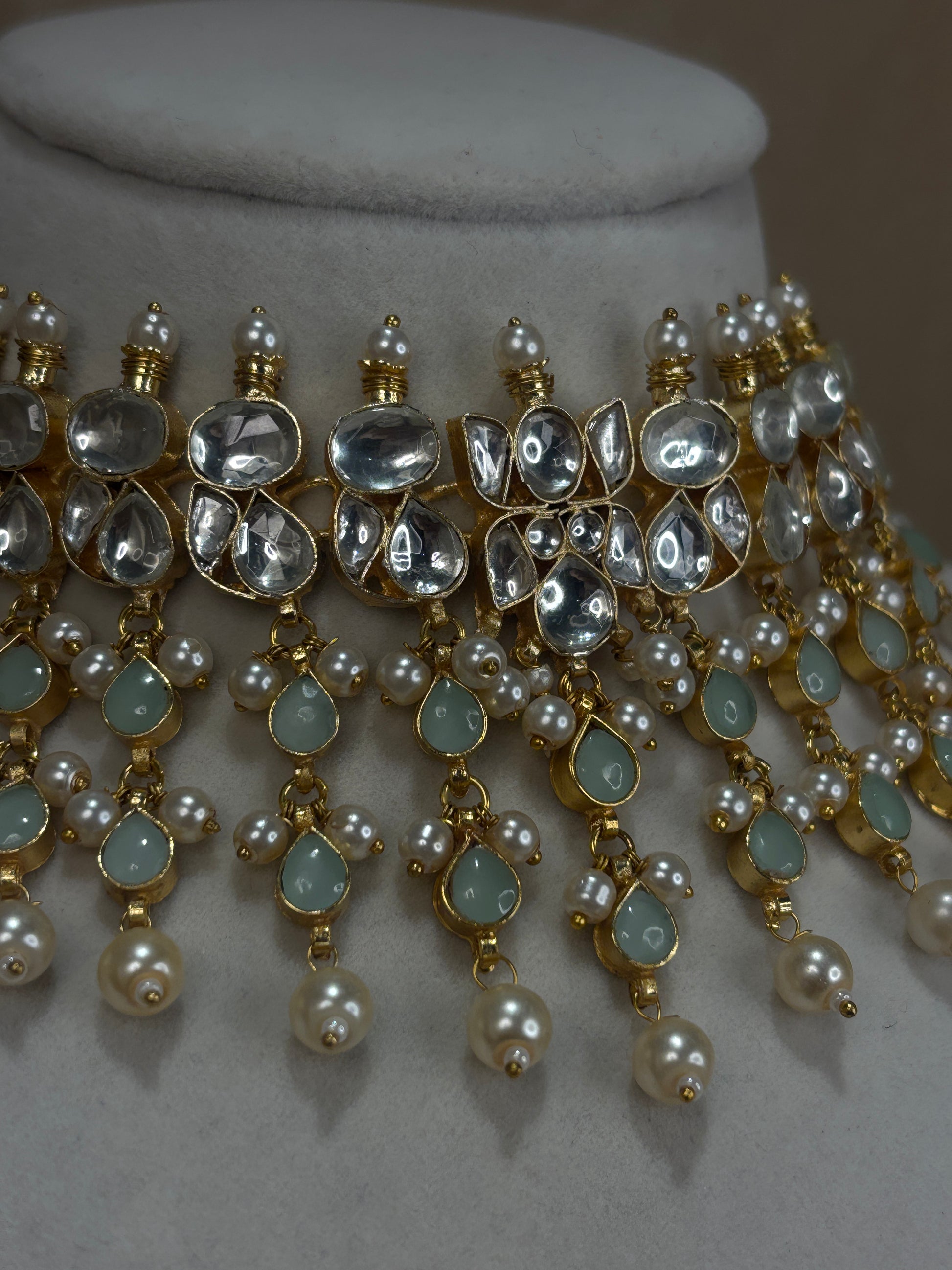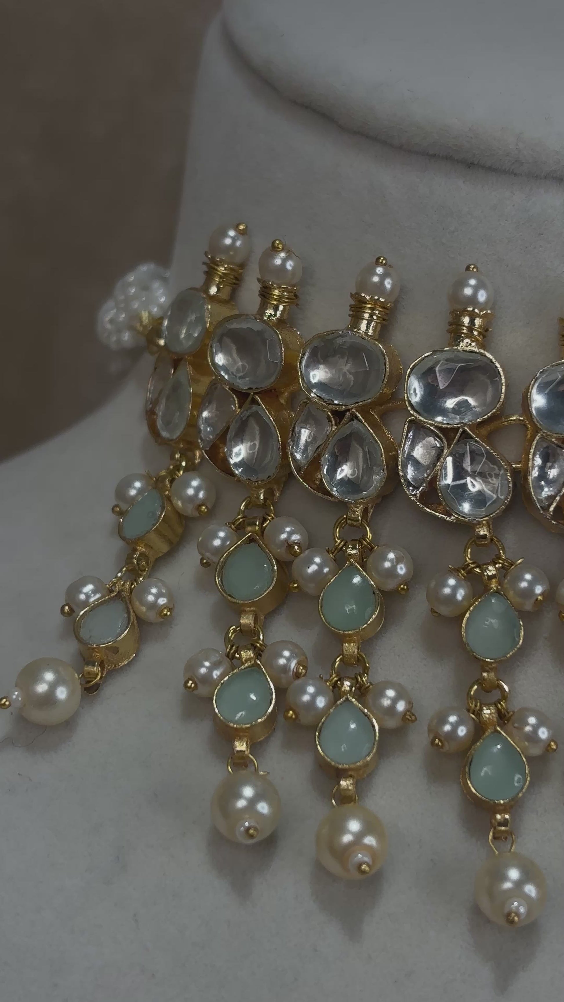 22k gold plated ahmedabadi pachi kundan choker with mint green accents and pearl details; comes with earrings