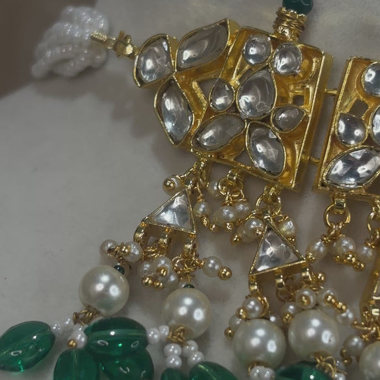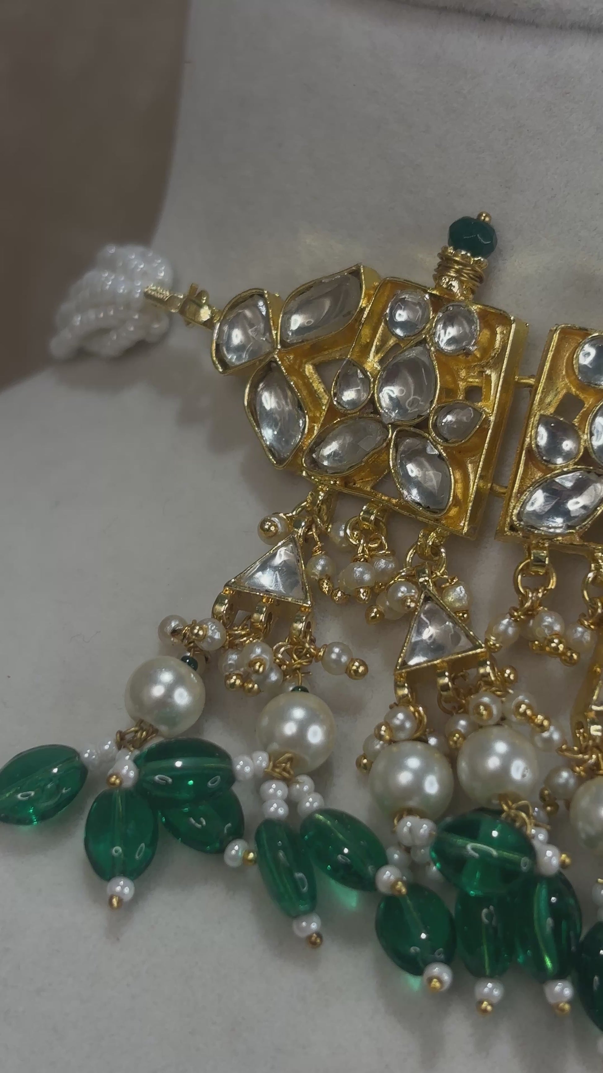 Emerald green 22k gold plated ahmedabadi pachi kundan choker with pearl details; comes with earrings
