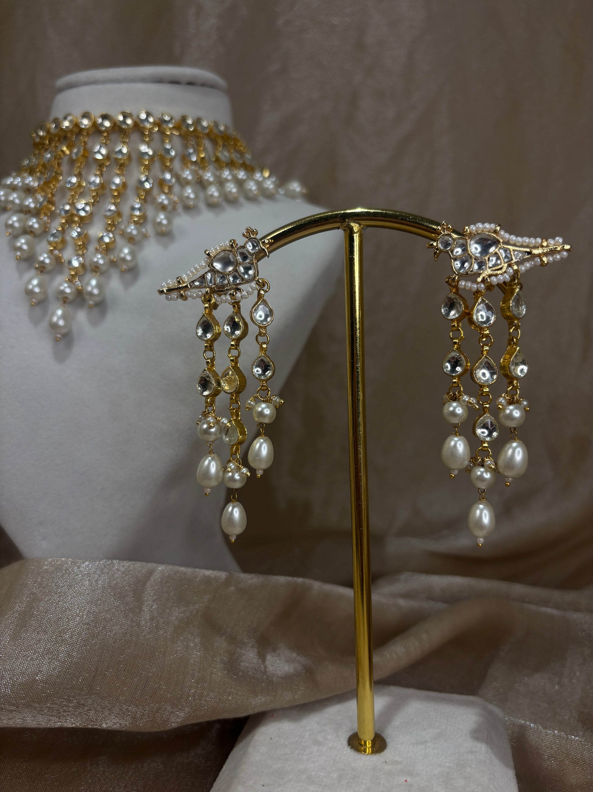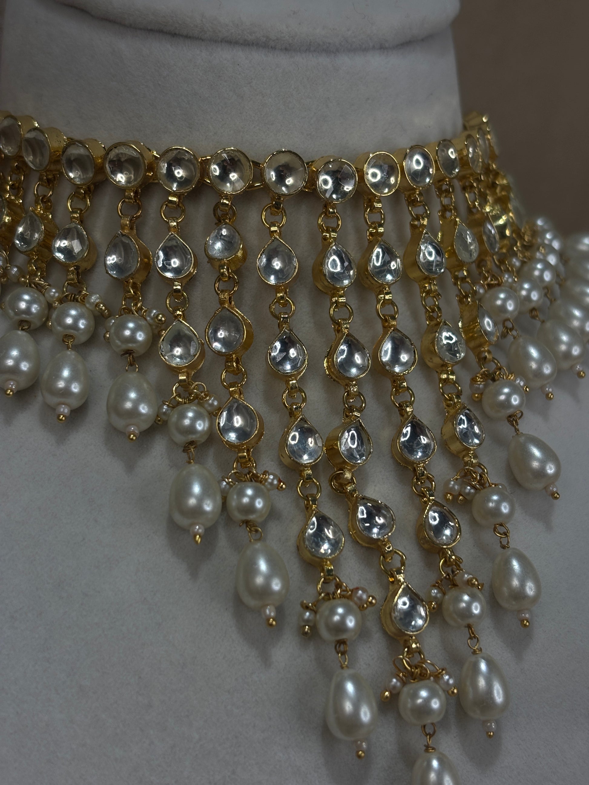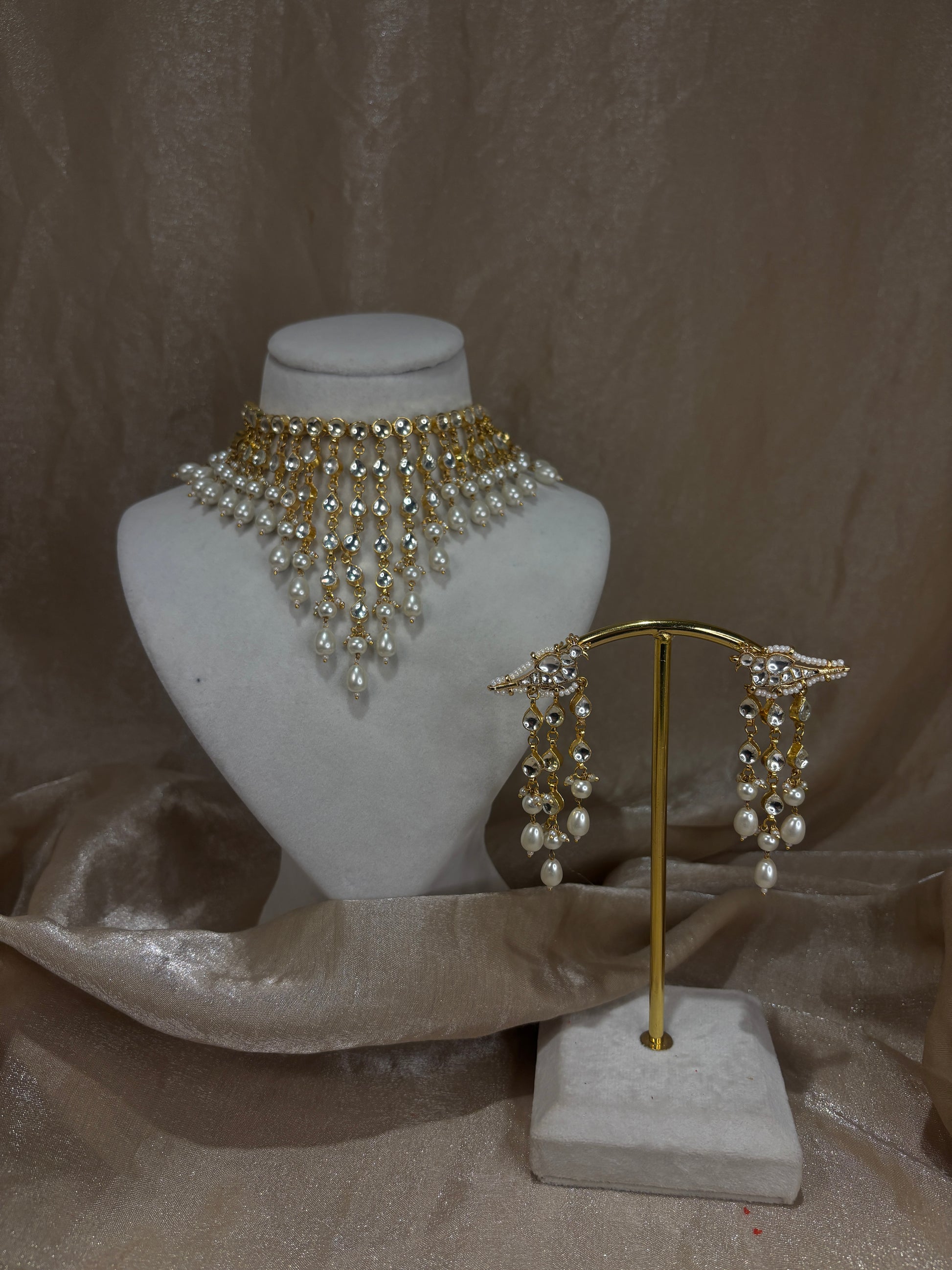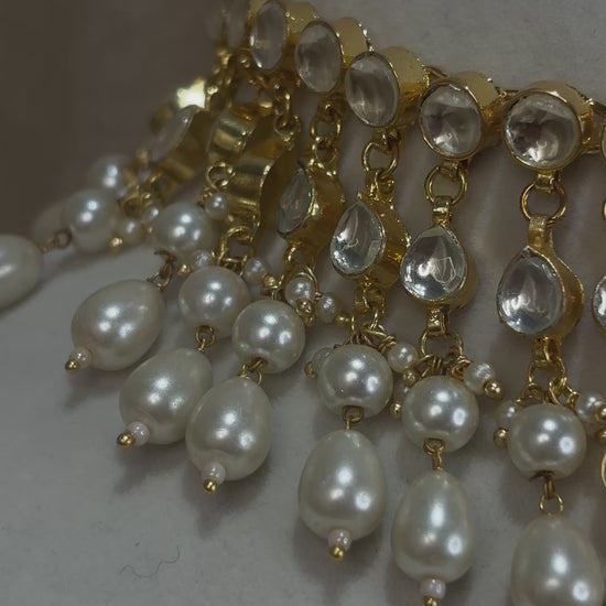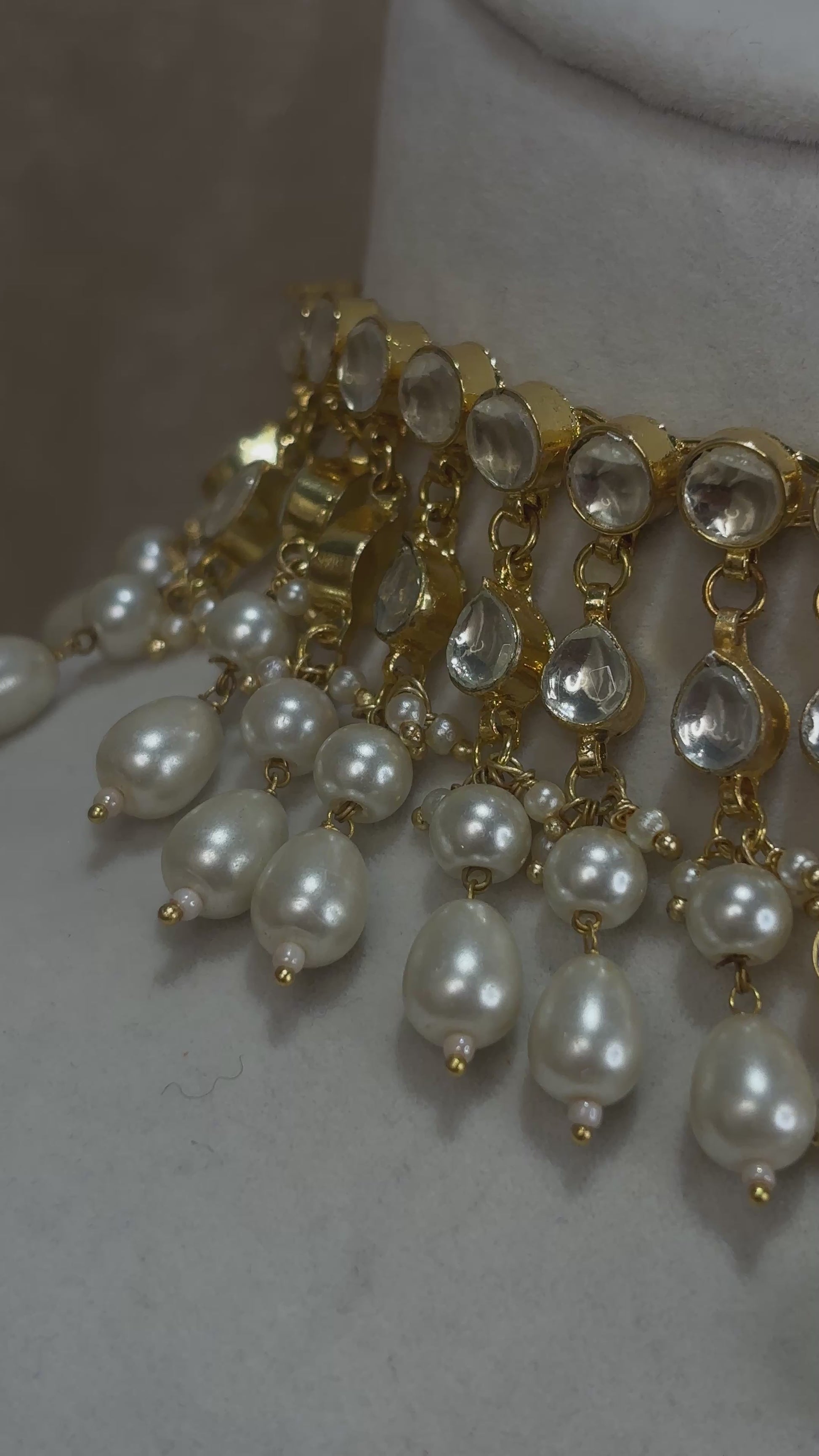 V-shape 22k gold plated ahmedabadi pachi kundan choker with pearl details; comes with earrings