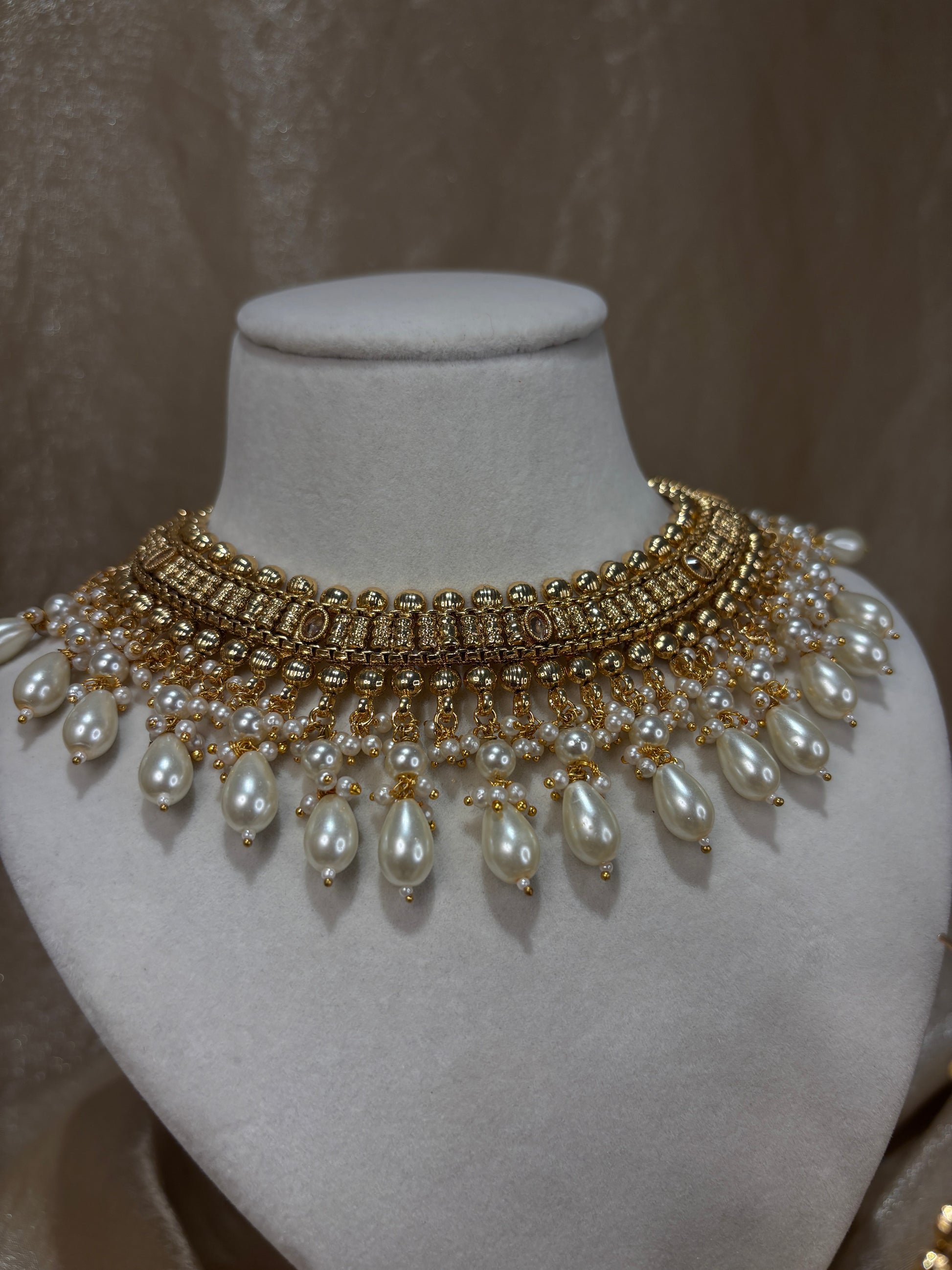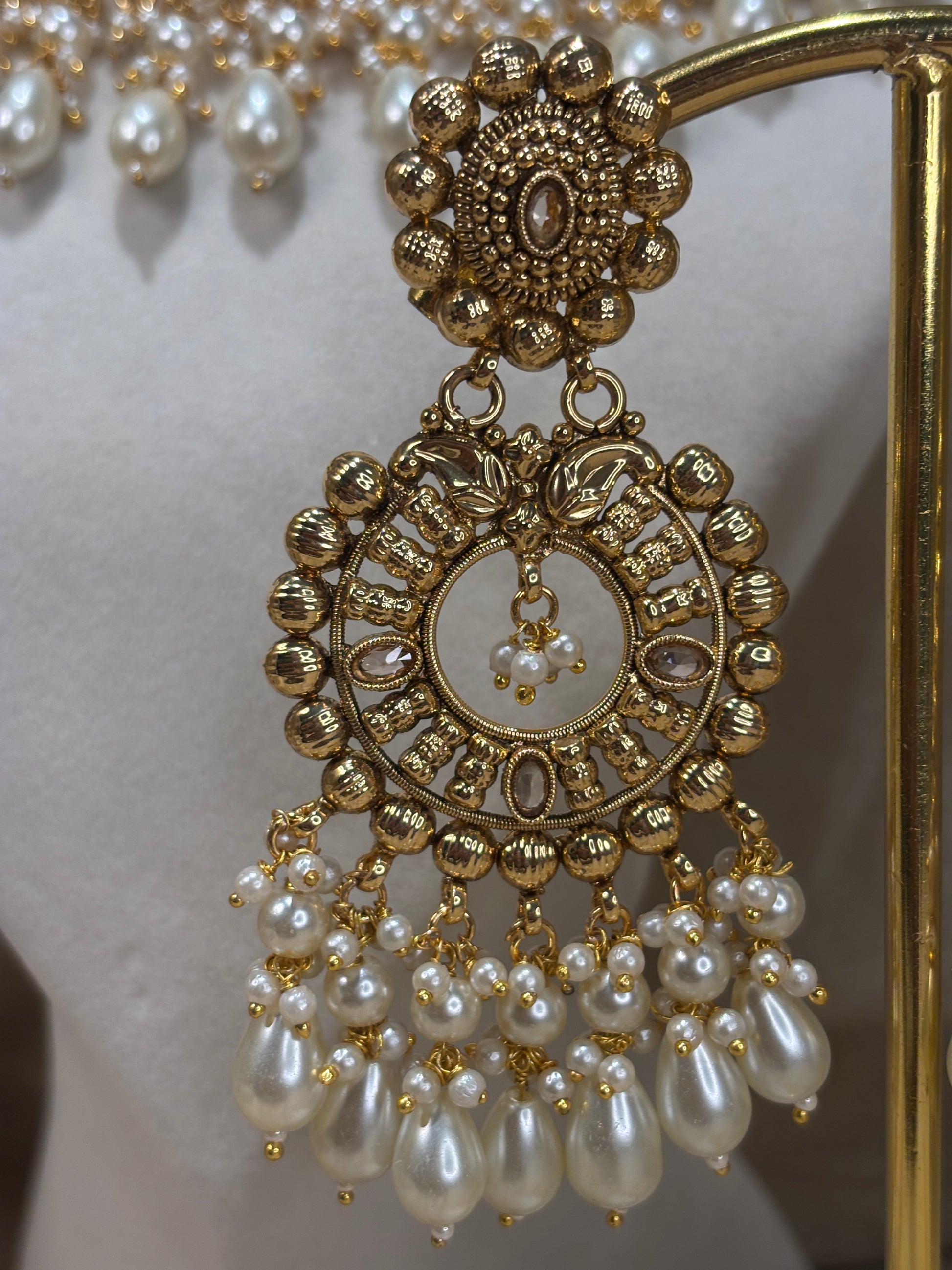 Antique gold necklace in white with small pearl details; comes with earrings and tikka