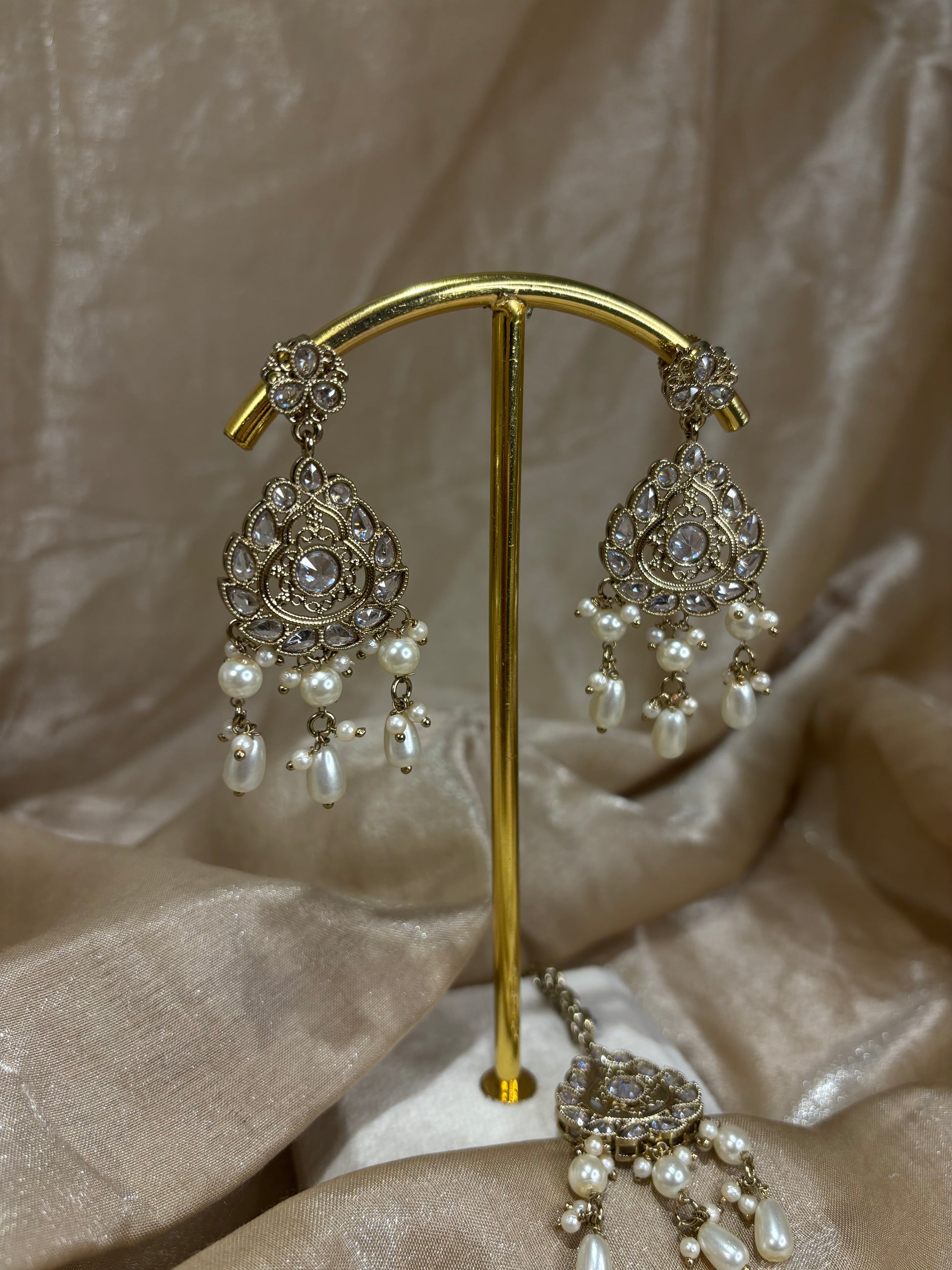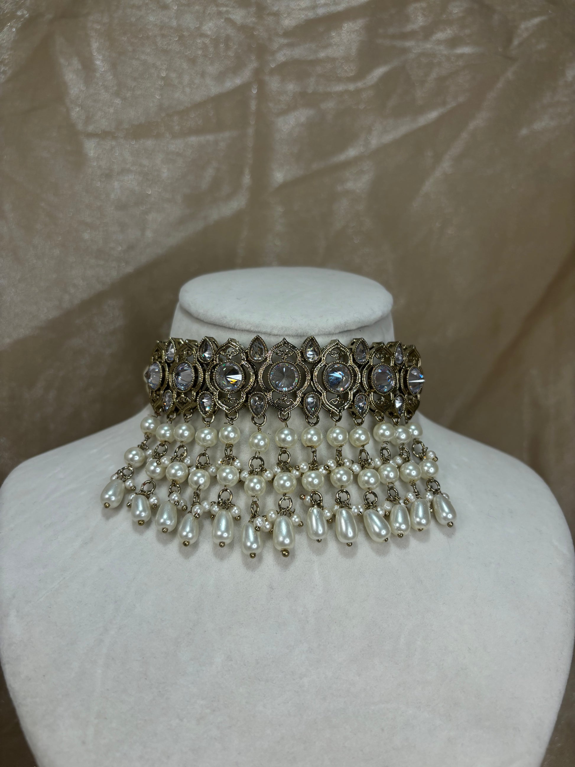 White/gold choker with pearl details; comes with earrings and tikka.