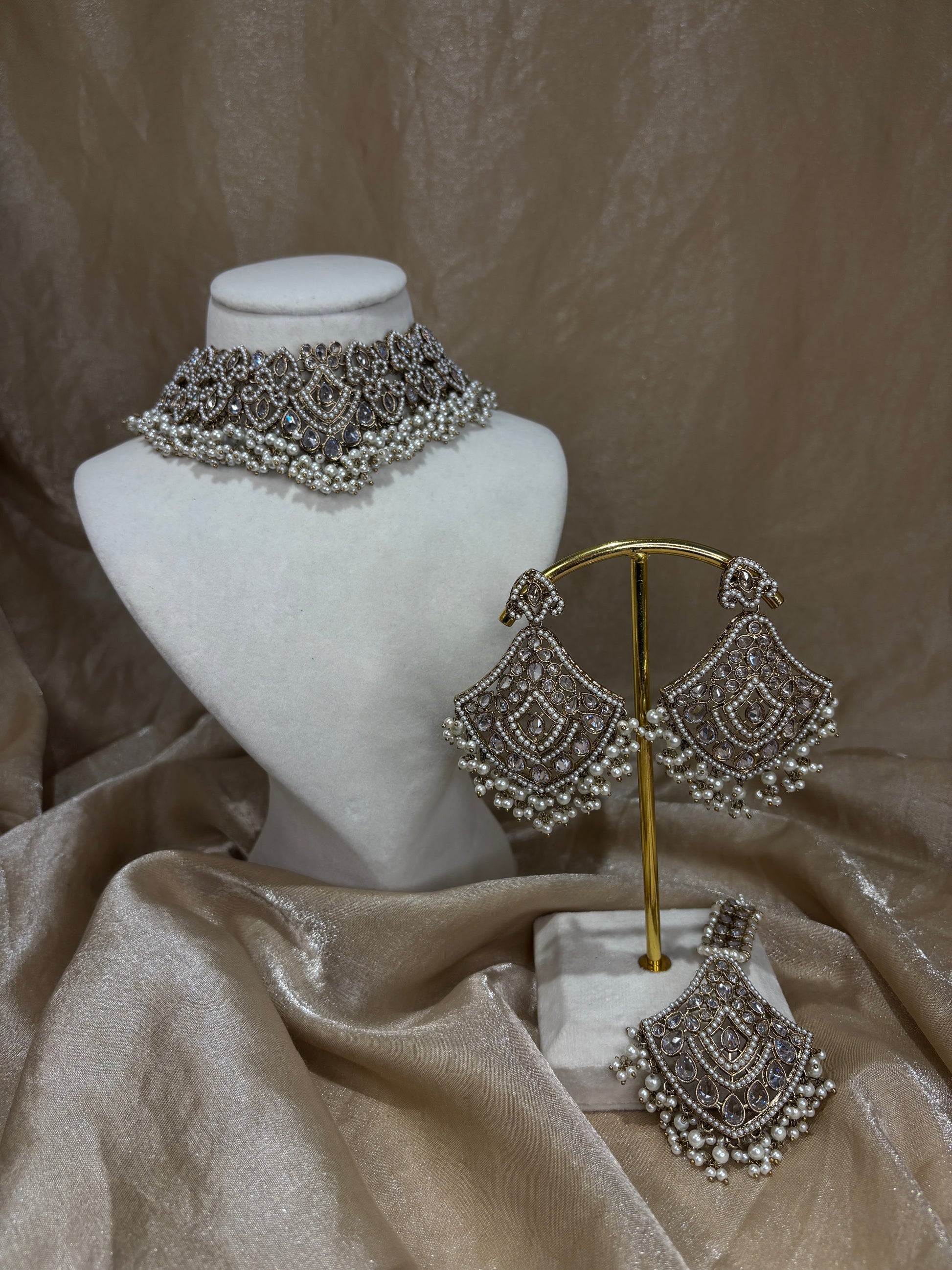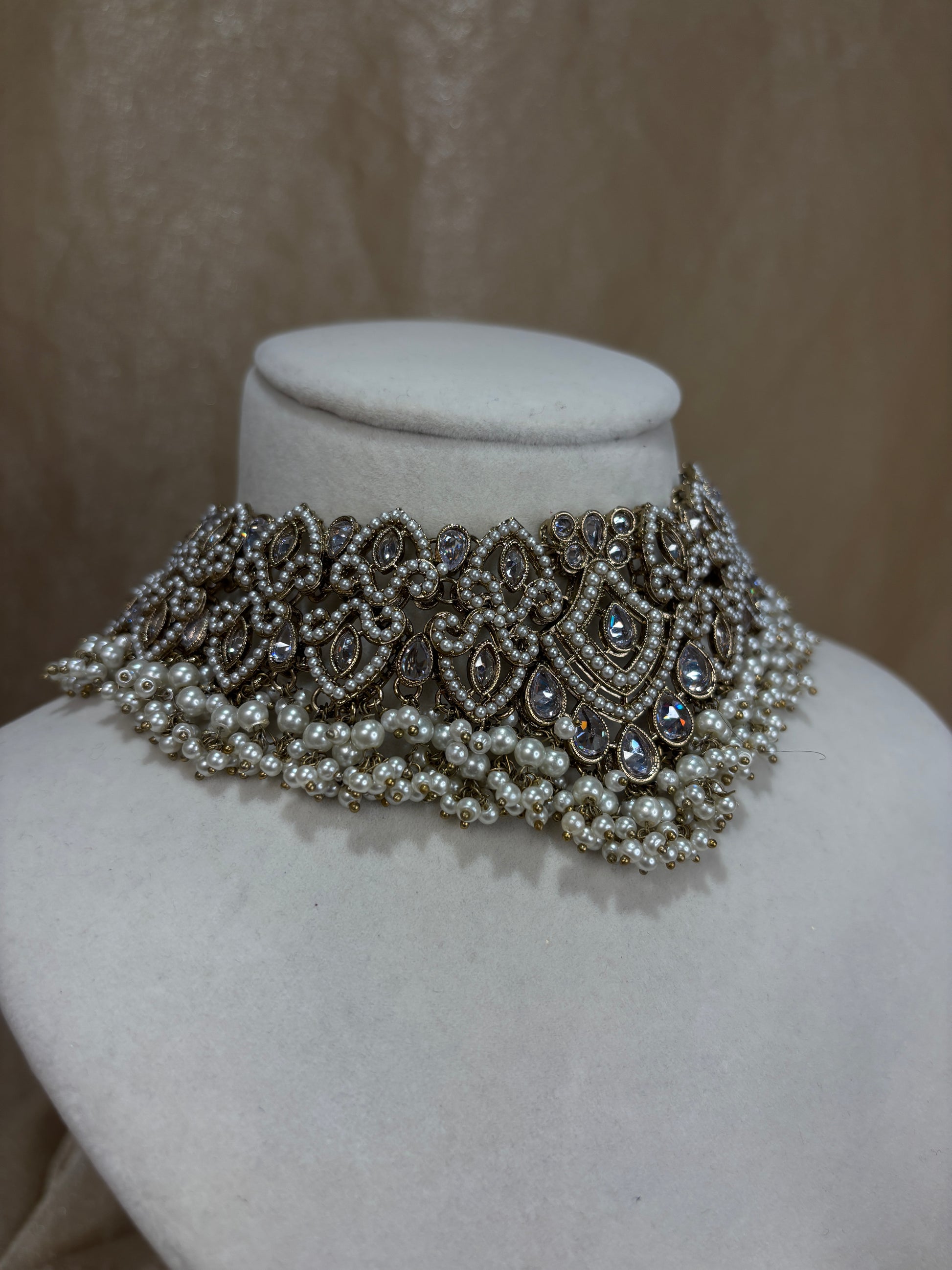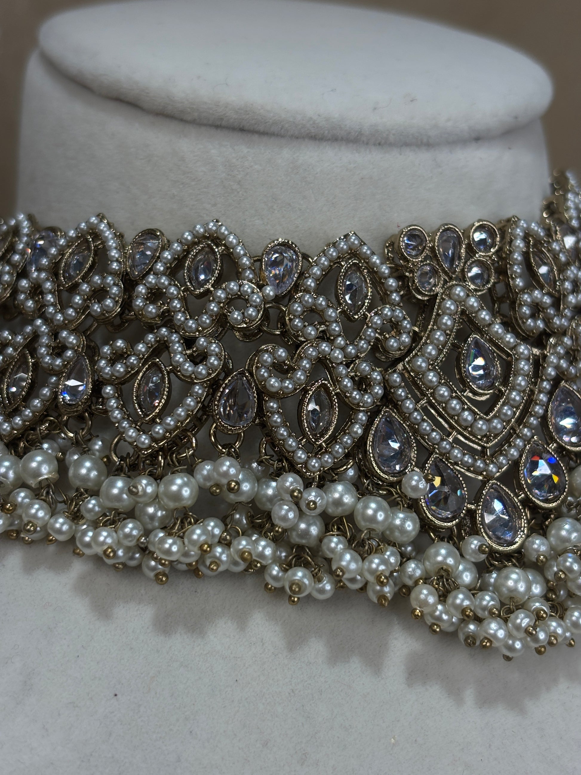 Heavy white/gold choker set with pearl detials; can also be worn as a necklace