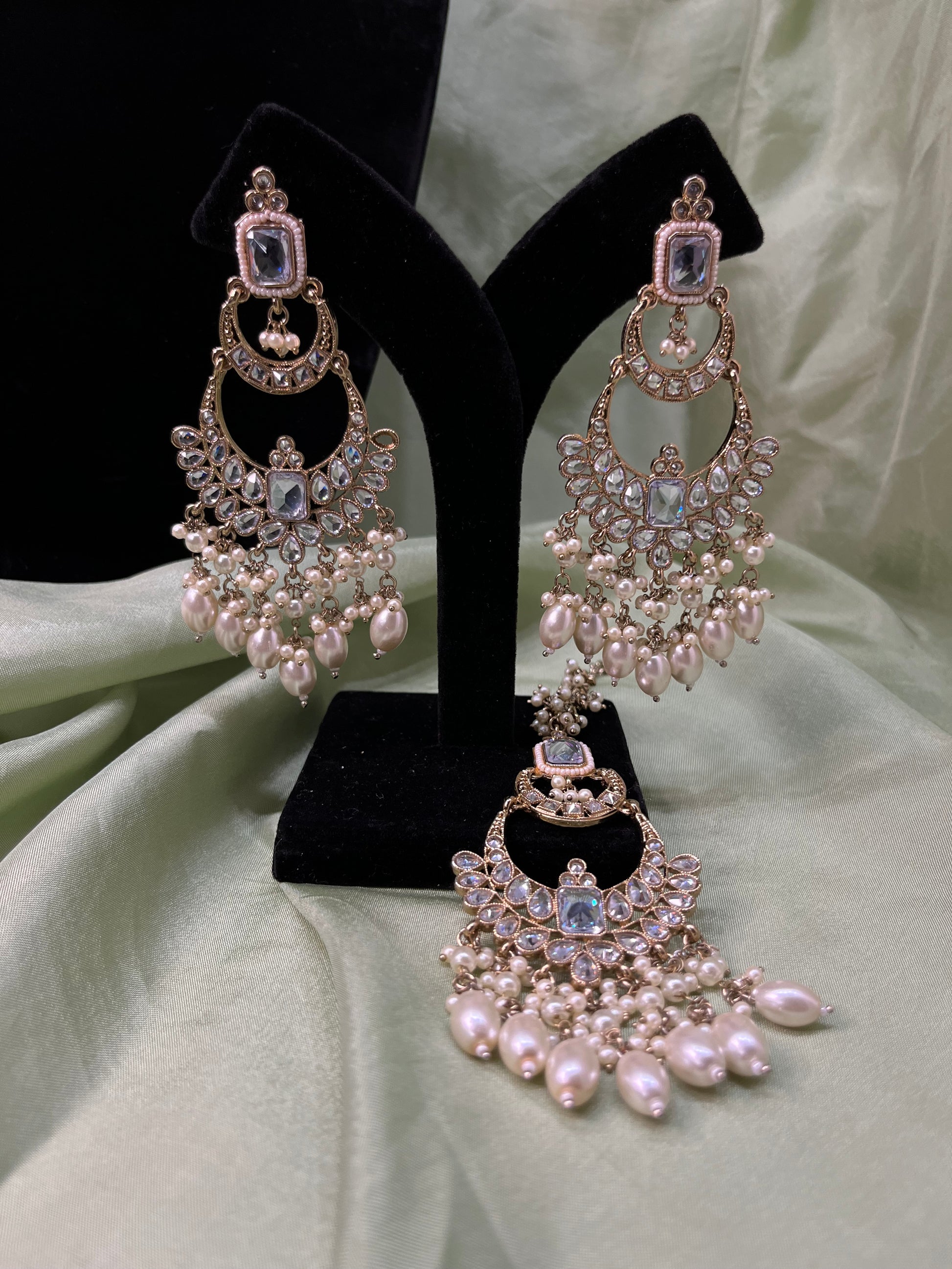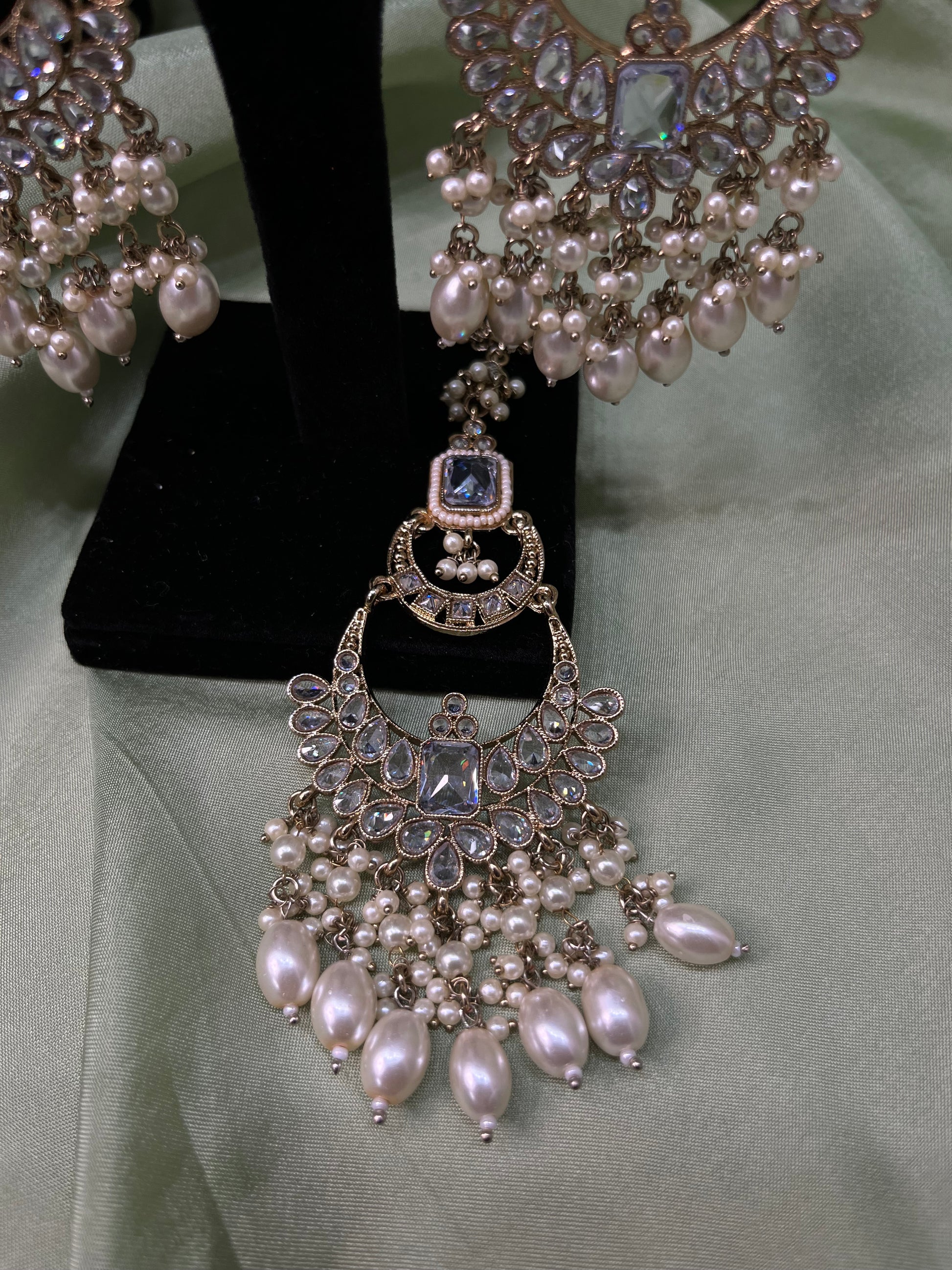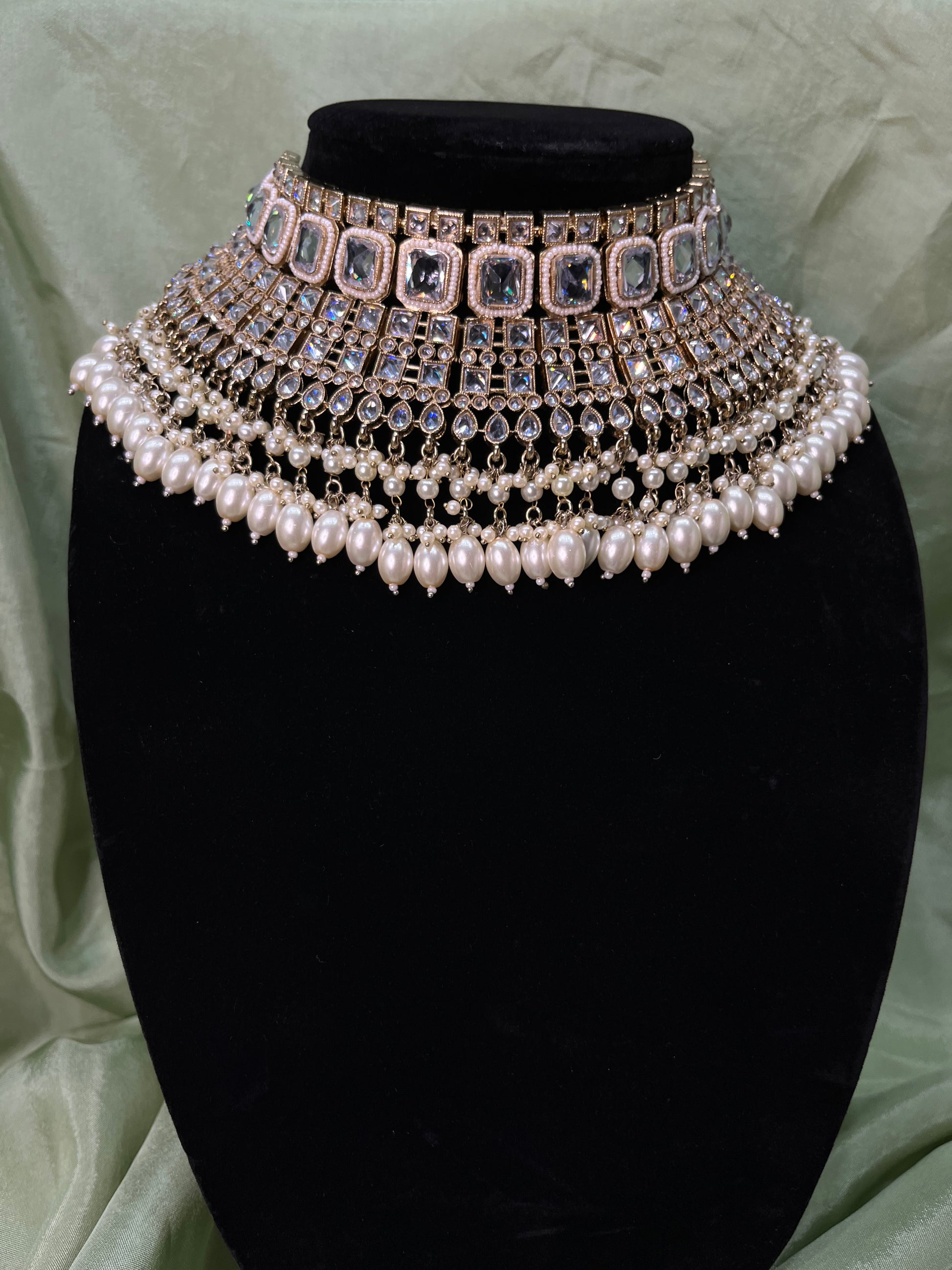 Heavy, structured white gold bridal choker with pearl details; comes with earrings and tikka.