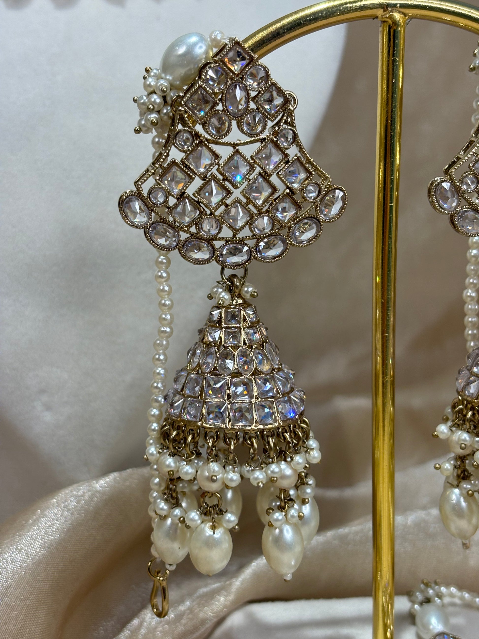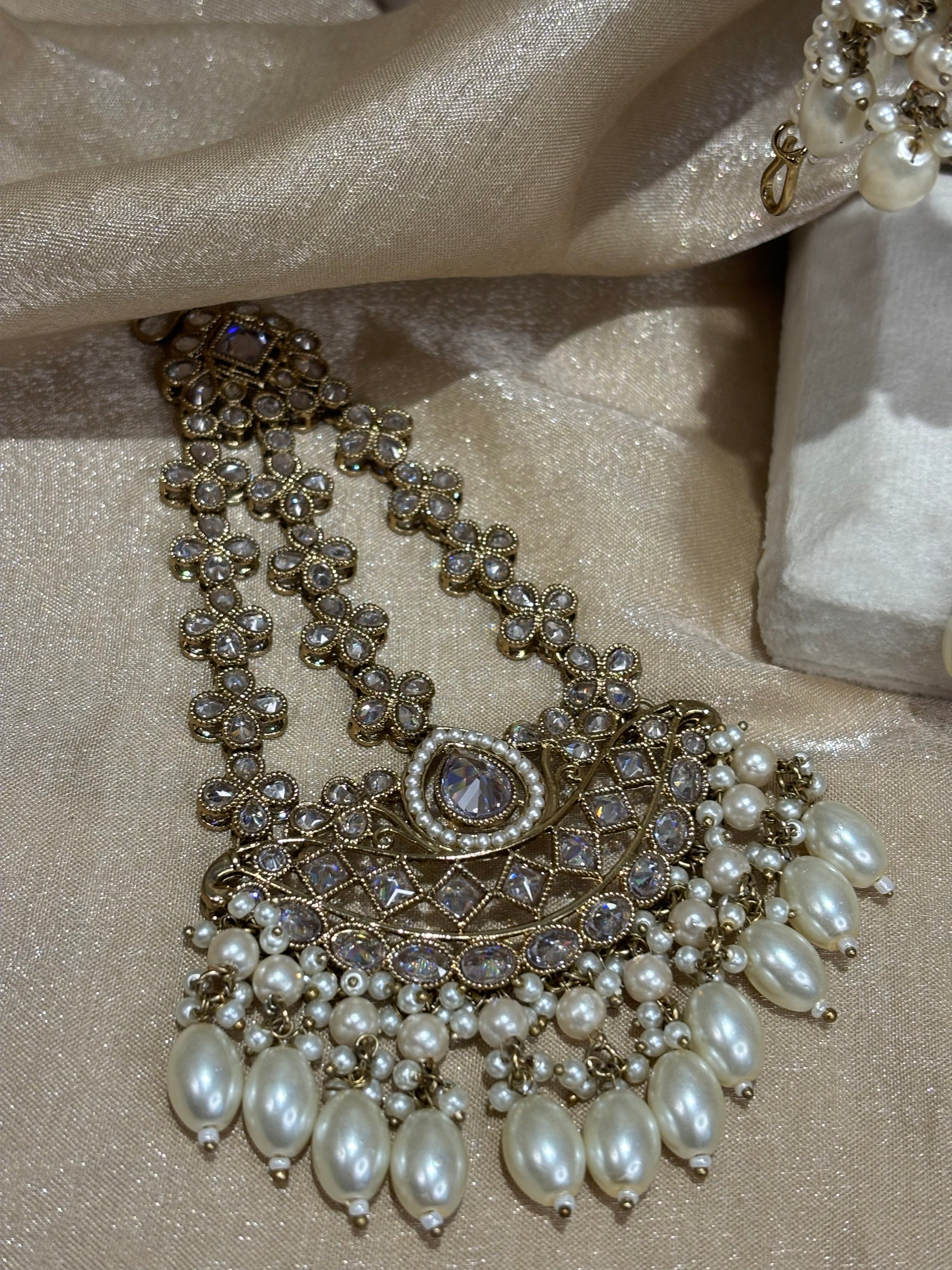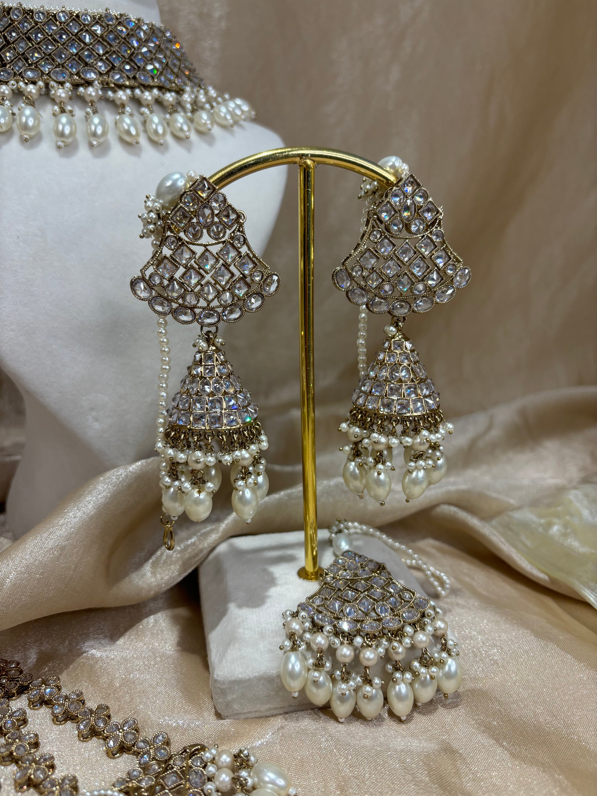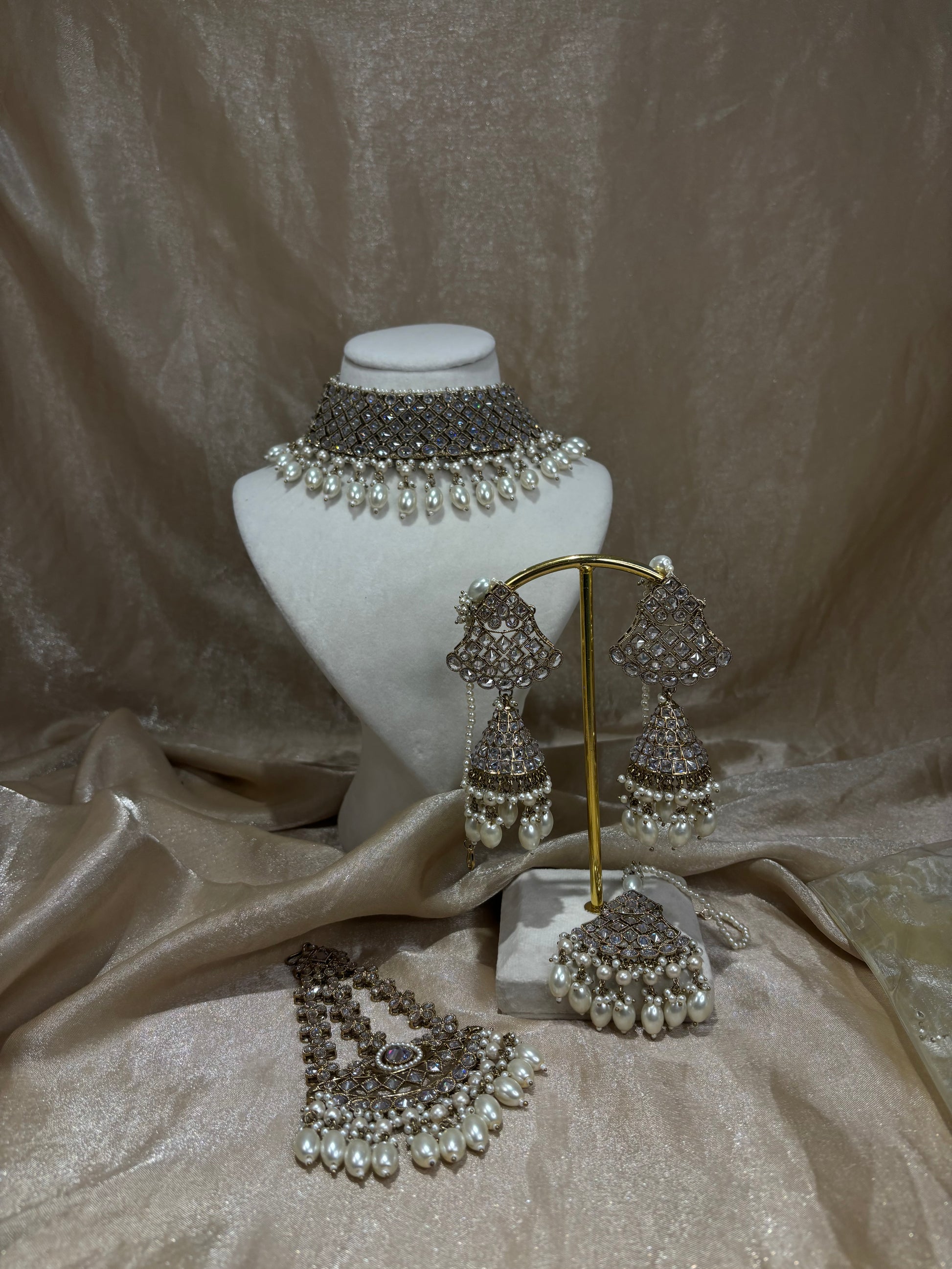 White gold choker set with heavy white pearl details; comes with heavy jhumki, tikka, and passa