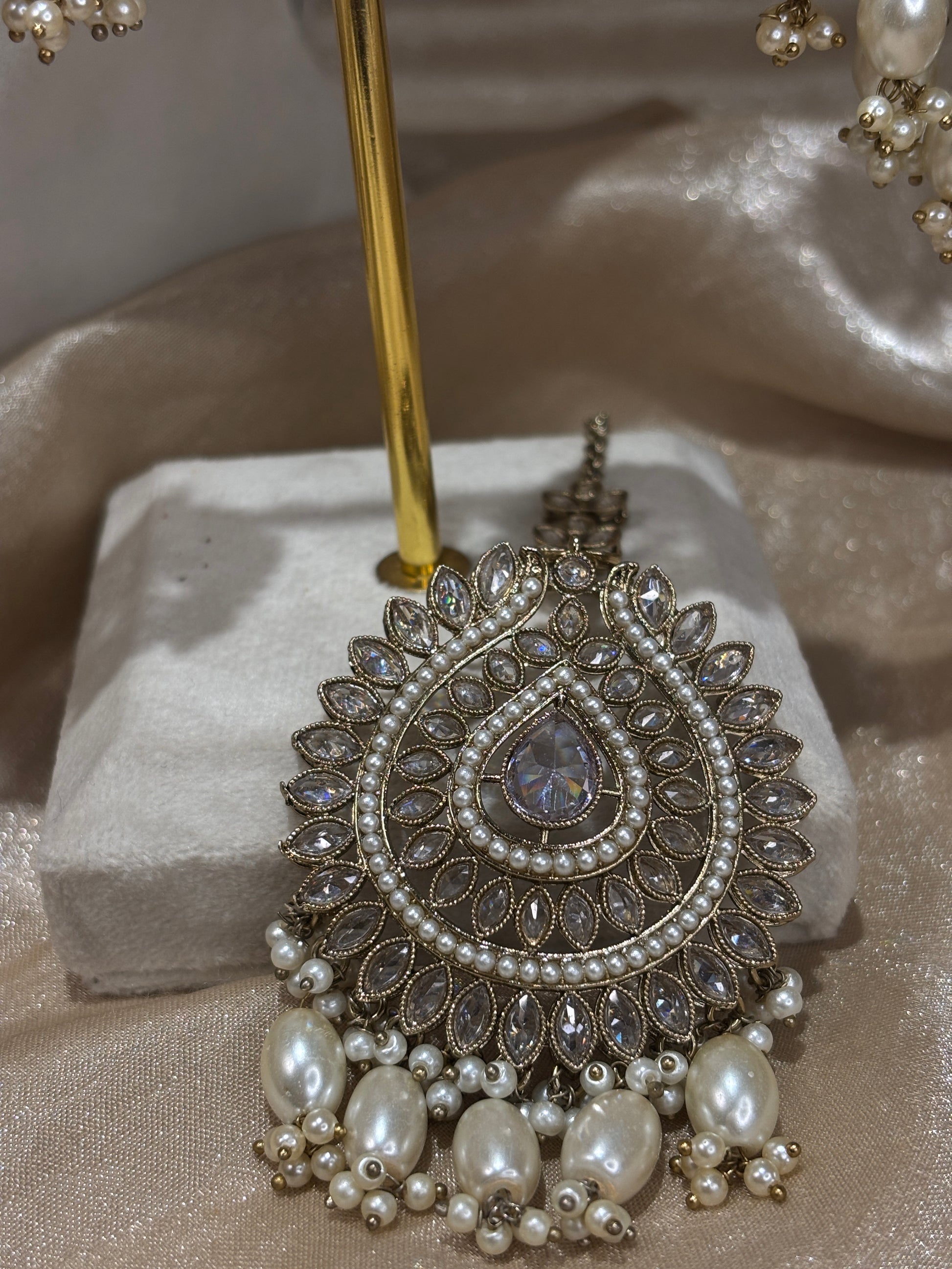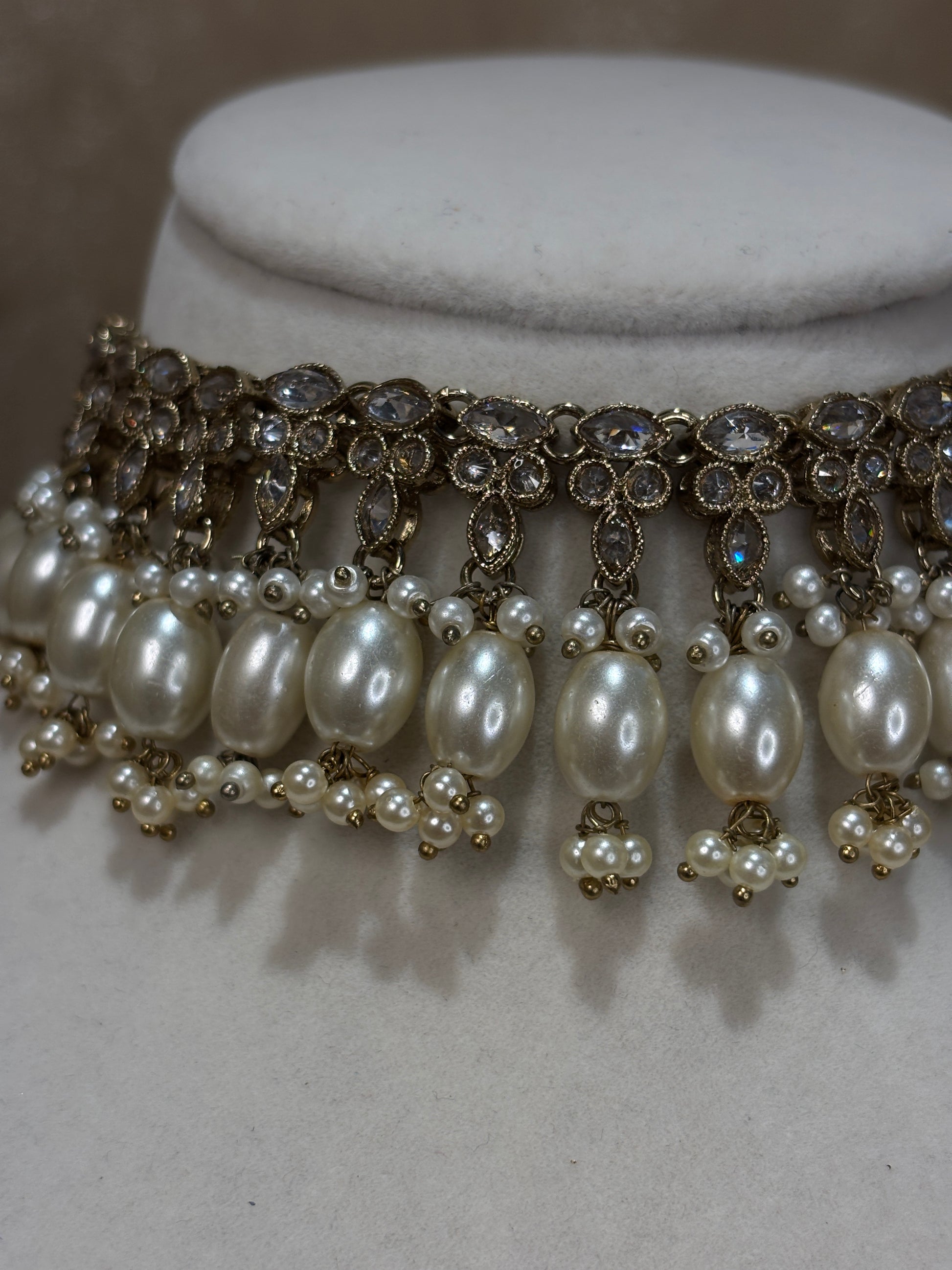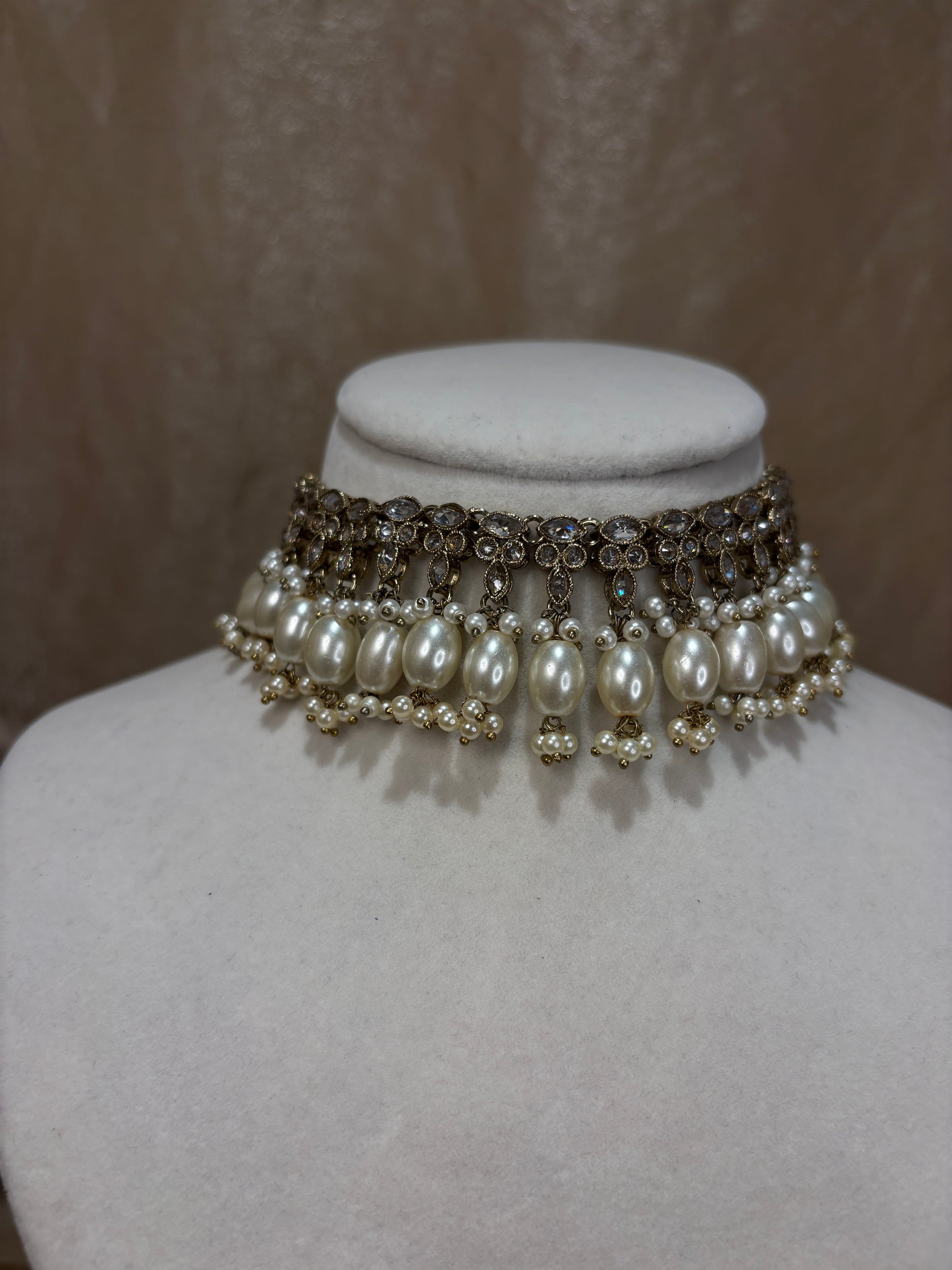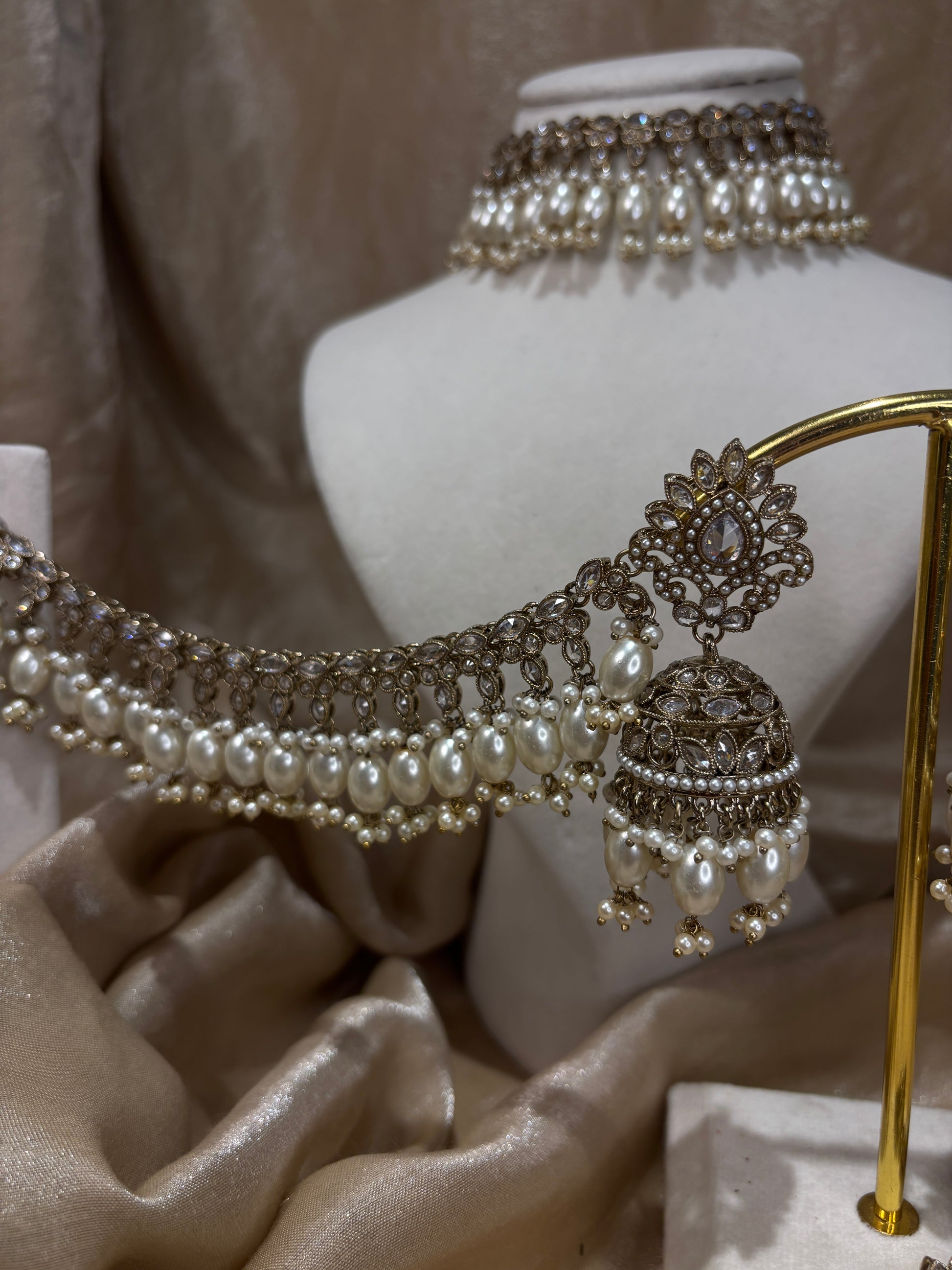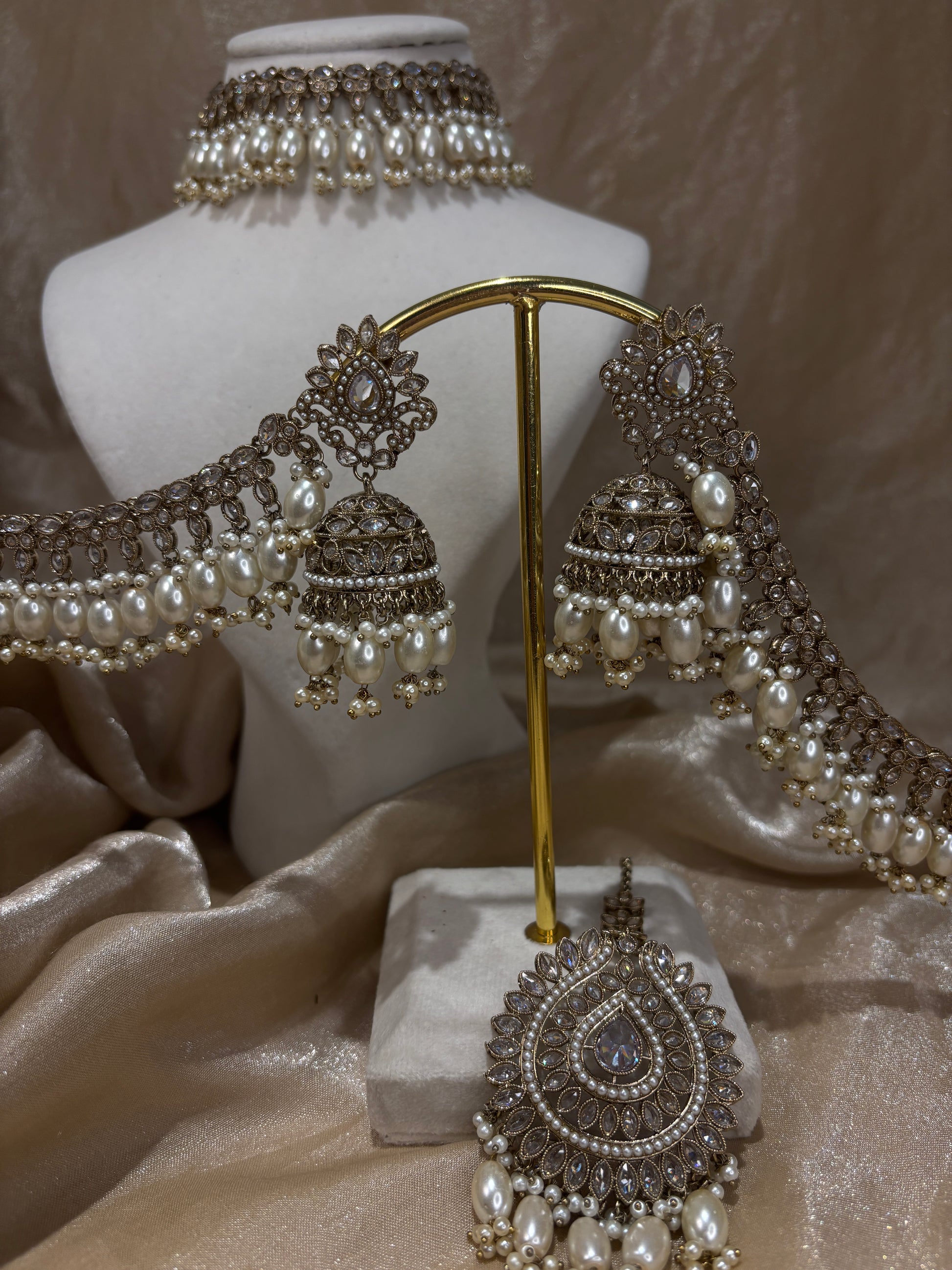 White/gold choker with pearl details; comes with sahare jhumki earrings and oversized tikka