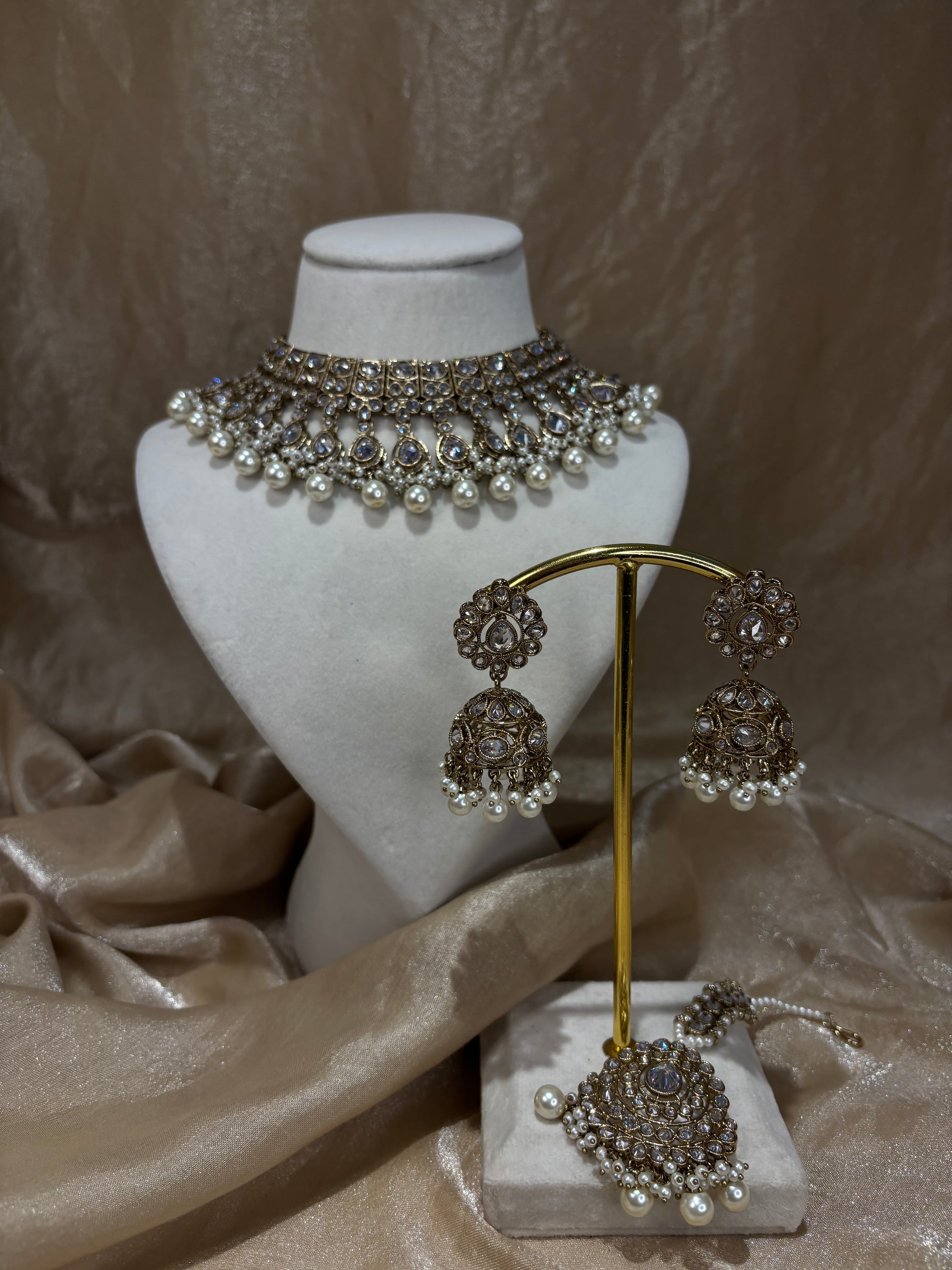 White/gold necklace with pearl details; can be worn as a necklace or choker