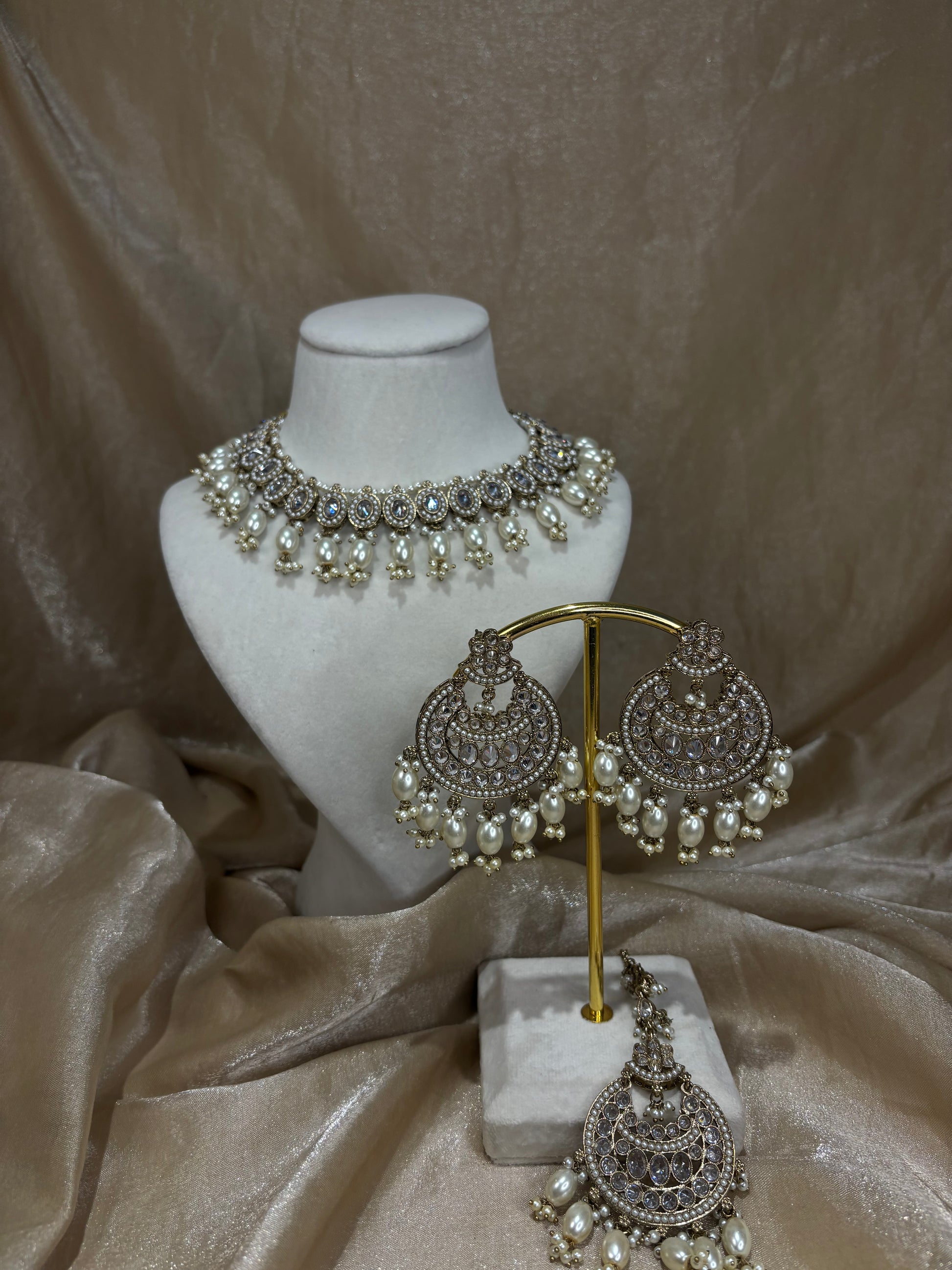 White/gold necklace set with pearl details; comes with round earrings and tikka
