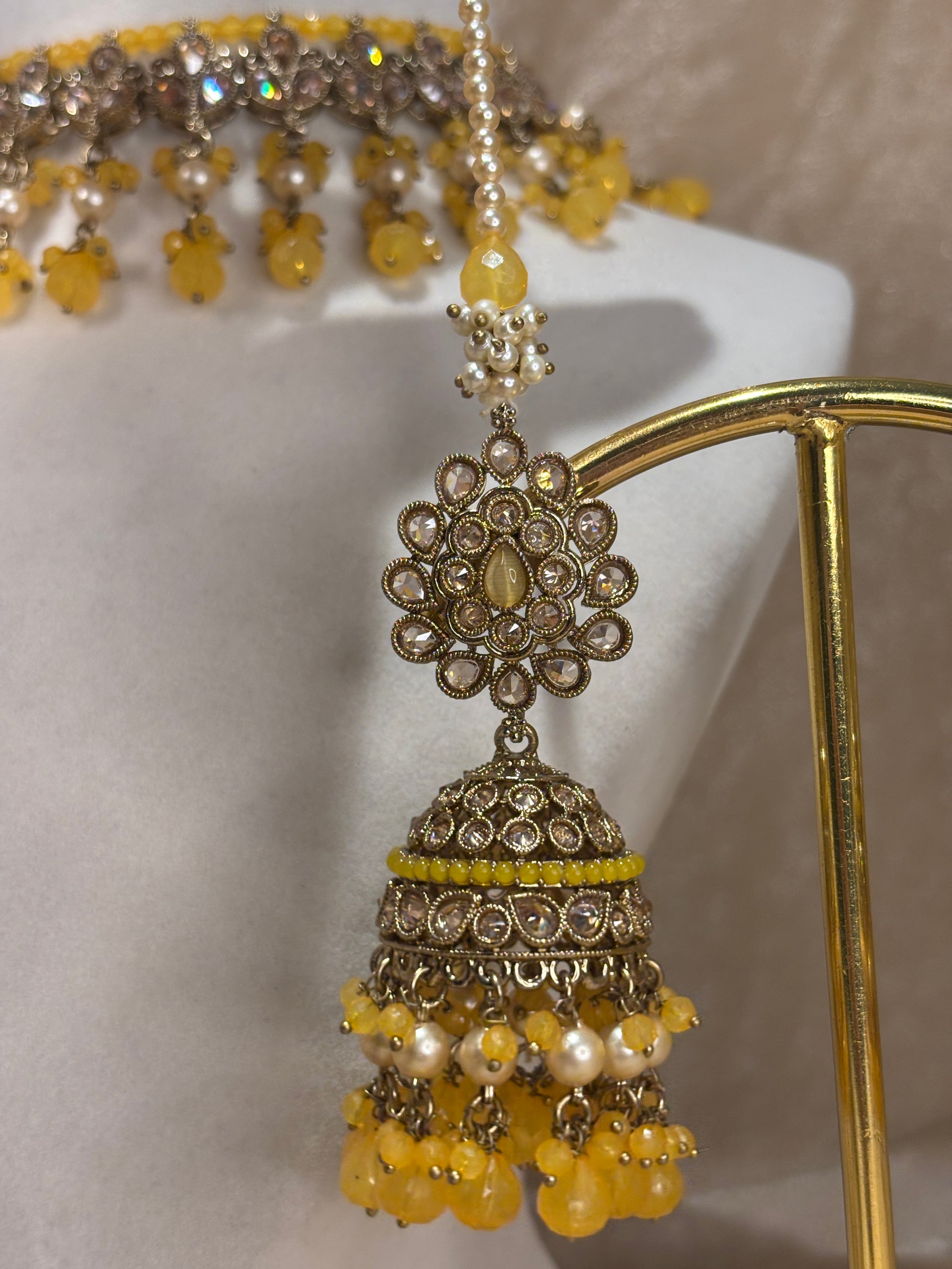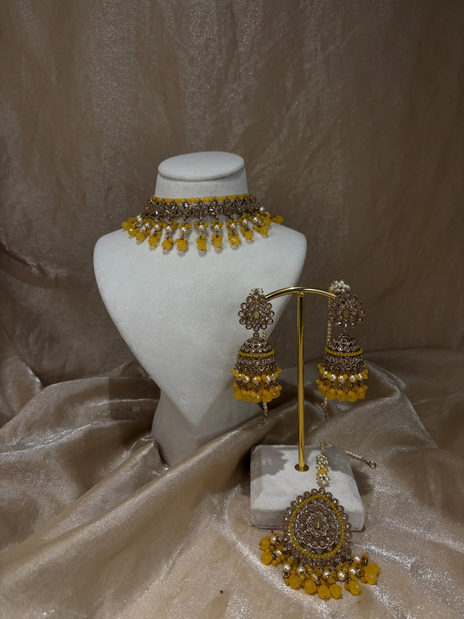Yellow set with small pearl details; can be worn as a necklace and choker