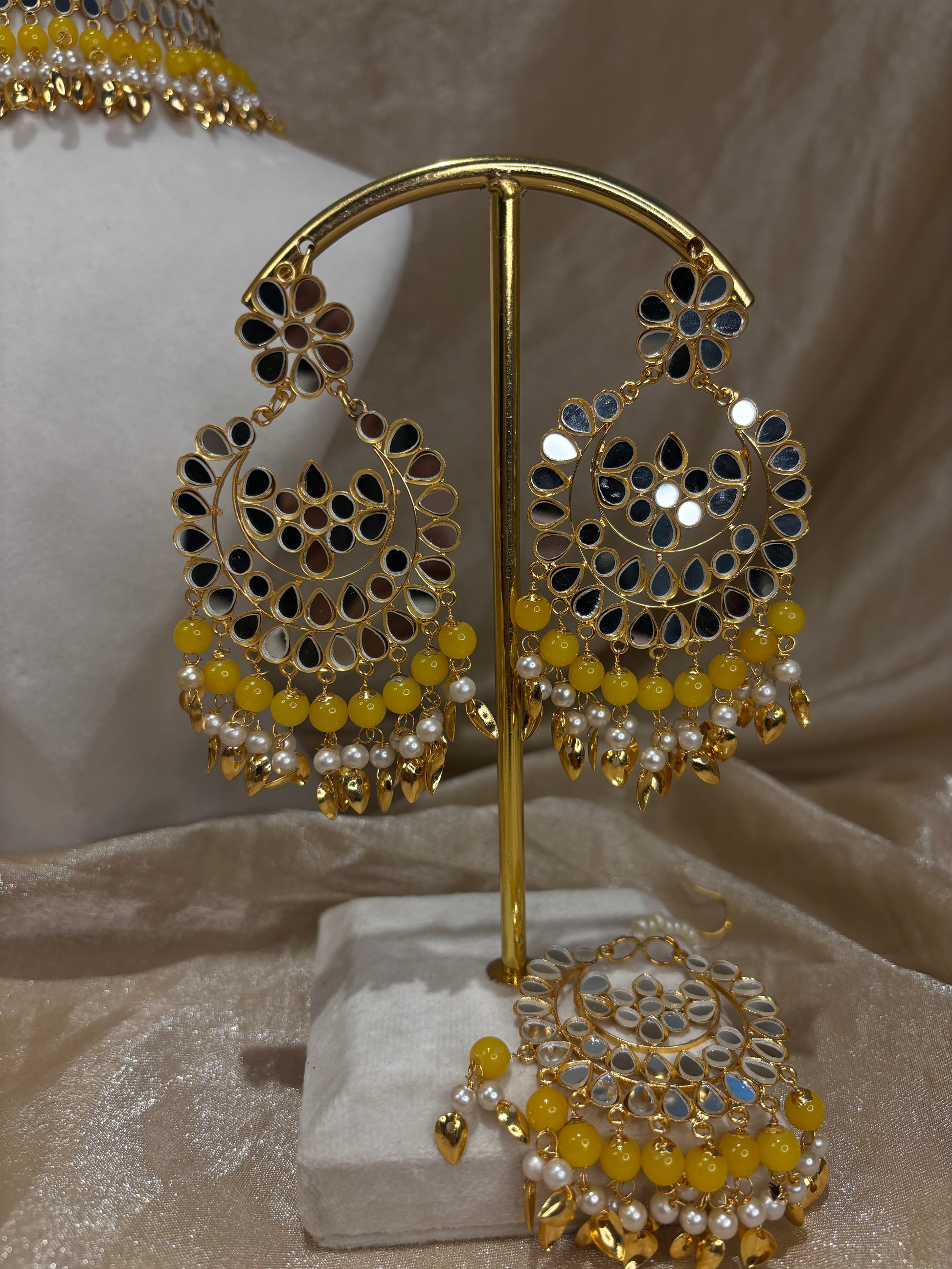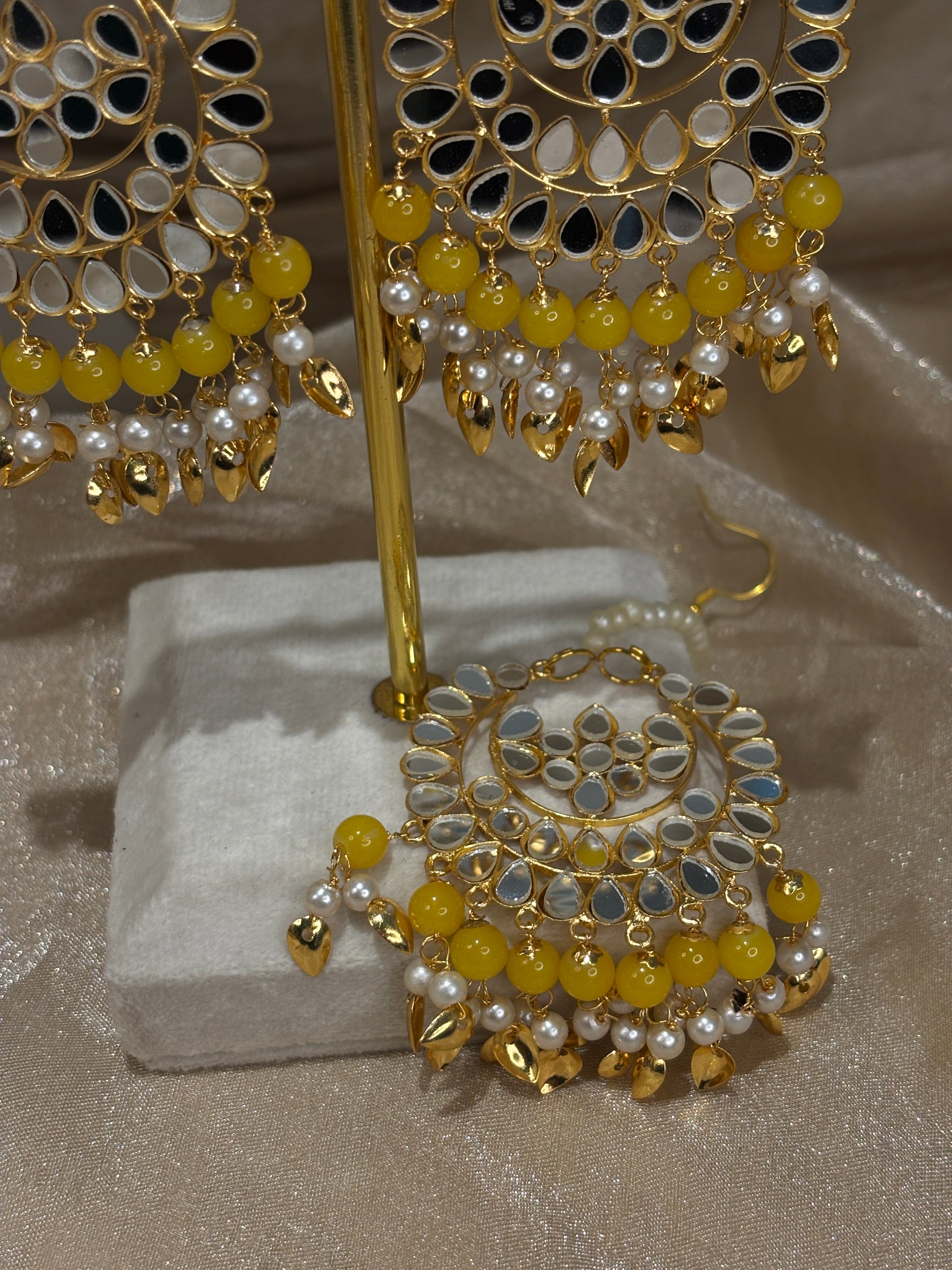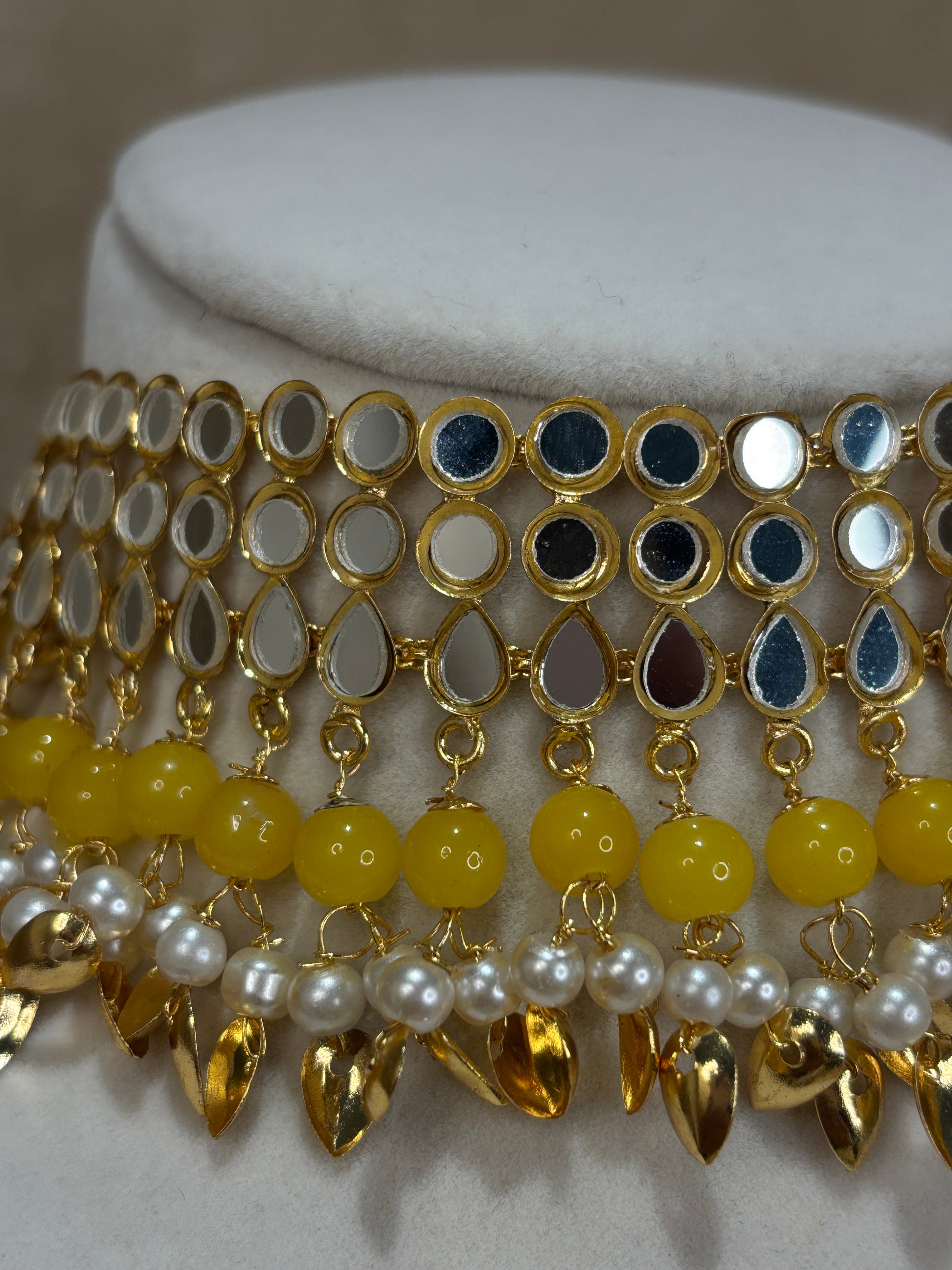 Yellow mirror work choker set with small pearl details; comes with earrings and tikka