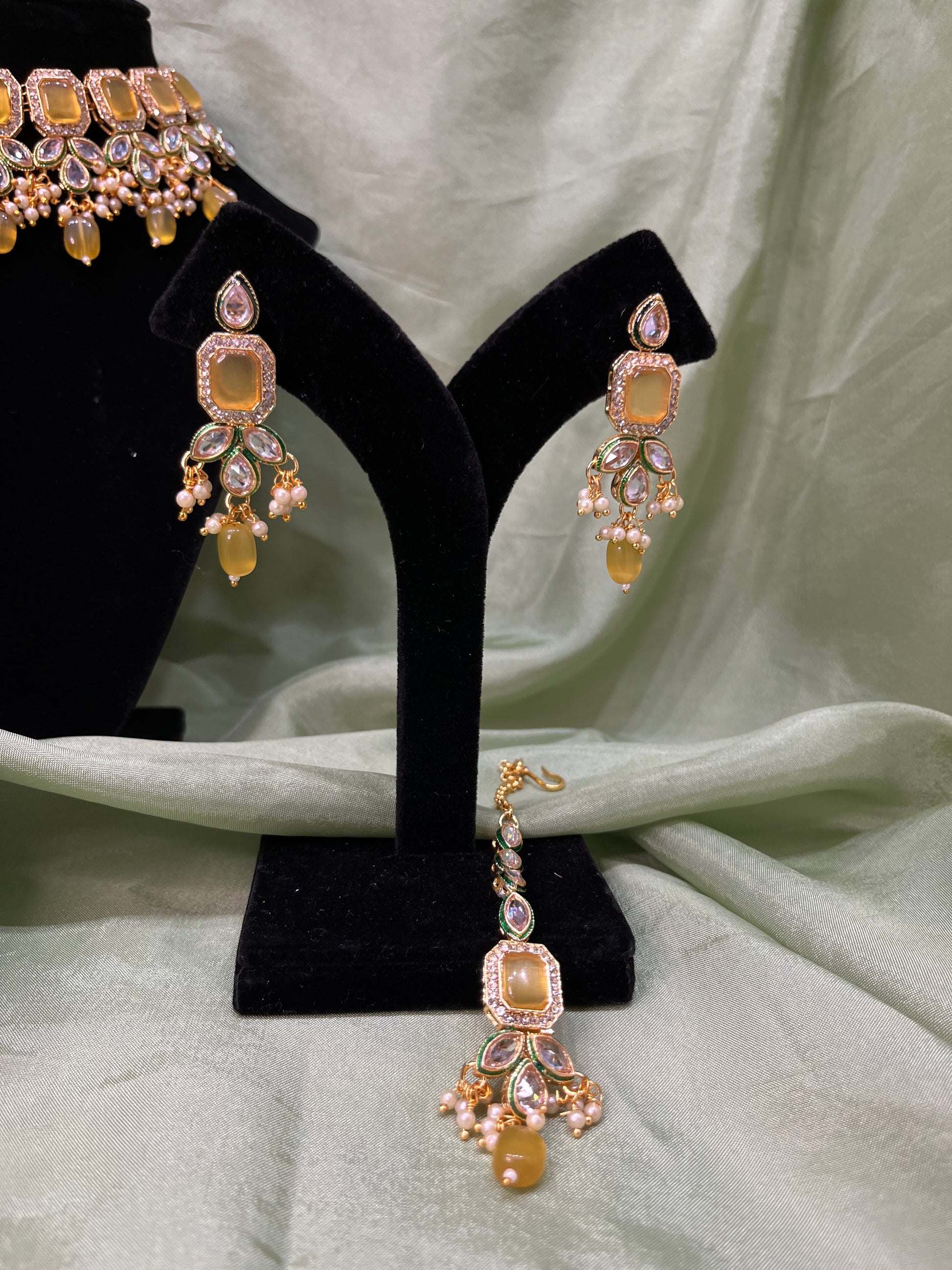 Yellow choker with Mona Lisa stone. Comes with earrings and tikka